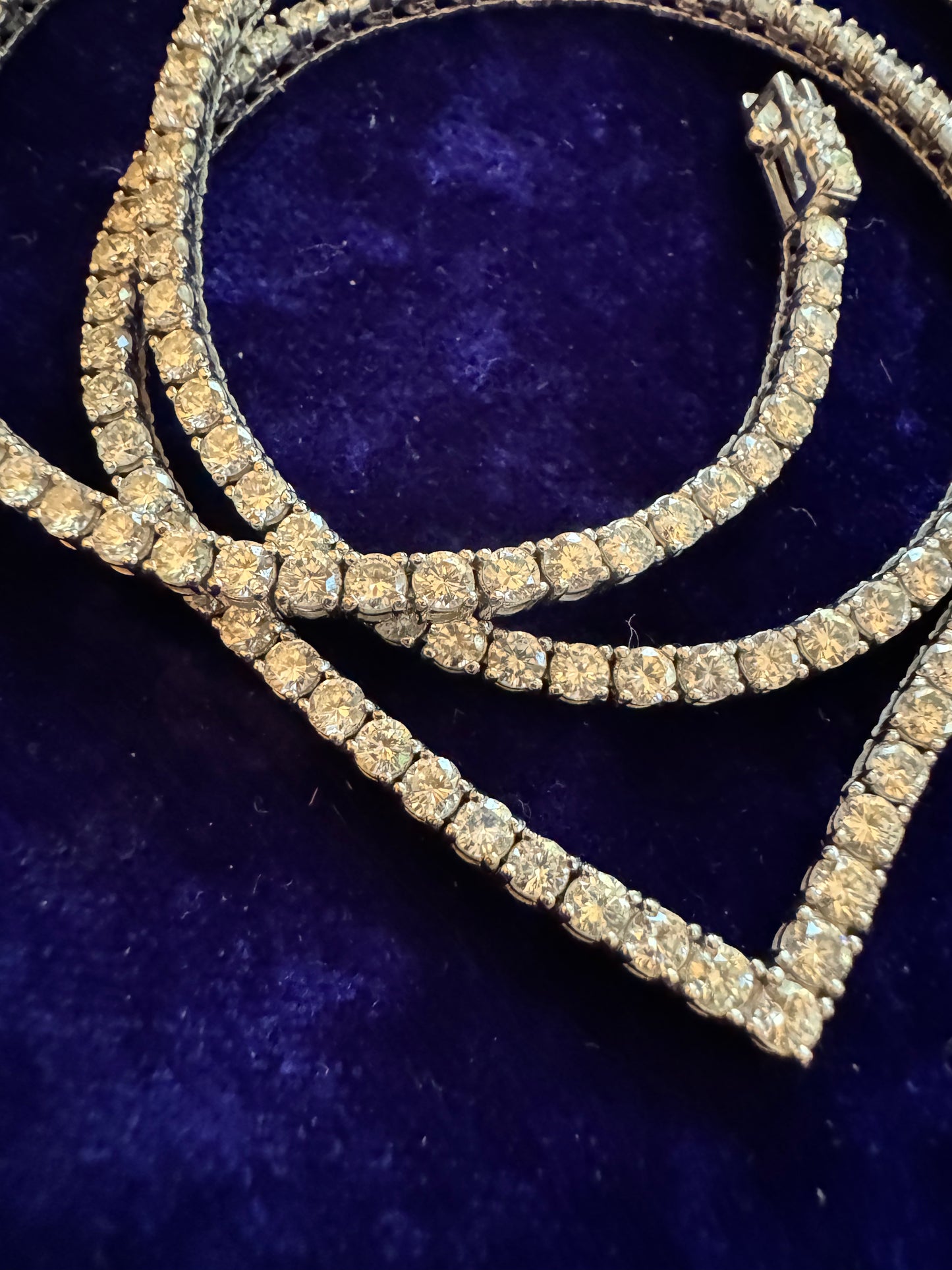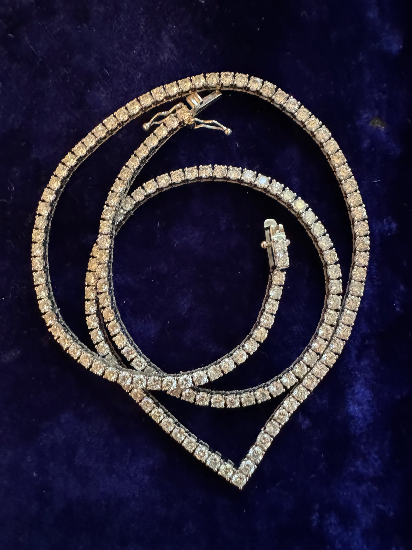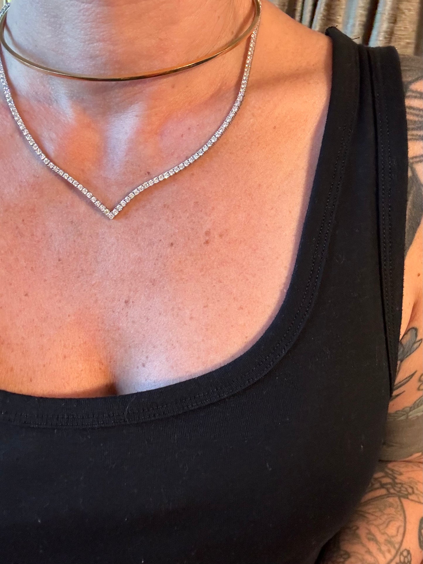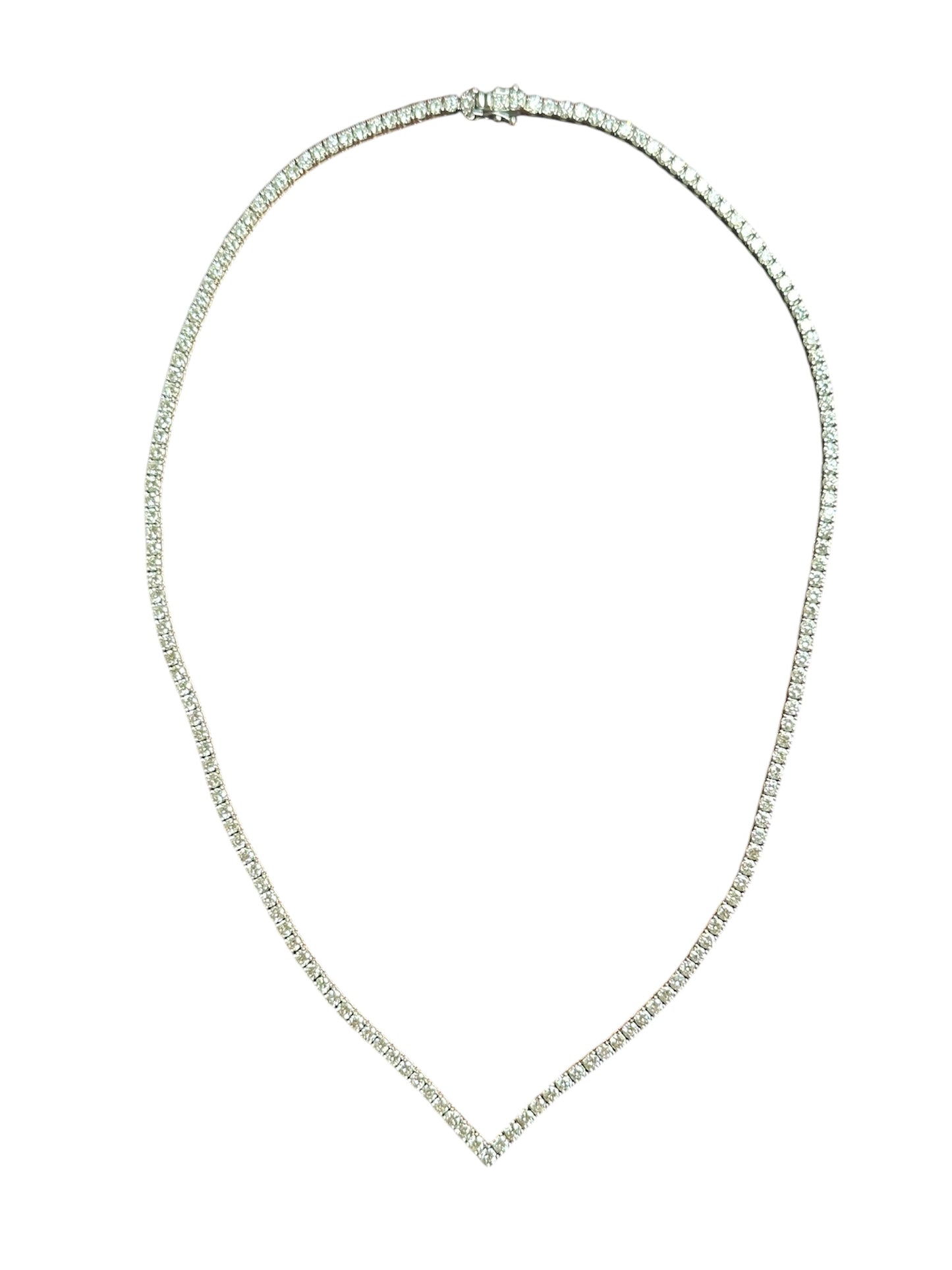 This immaculate chevron/pointed diamond tennis necklace is timeless, yet so unique. The brilliant cut diamonds are white and clean, with an approximate 10 carats. The necklace is 17" long and features an endless clasp to prevent any interruption of the diamonds and she has double figure-8 safety closures. Gorgeous shine alone or layered up for any style.