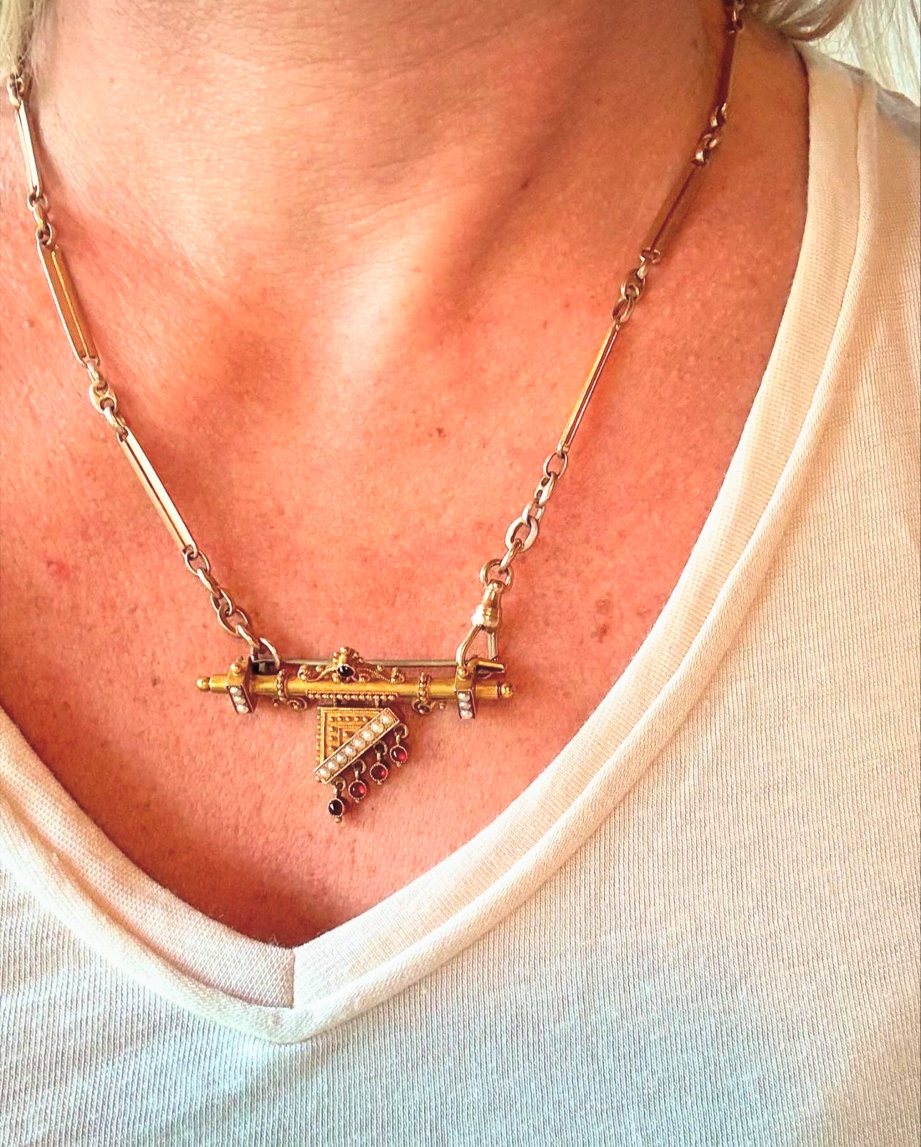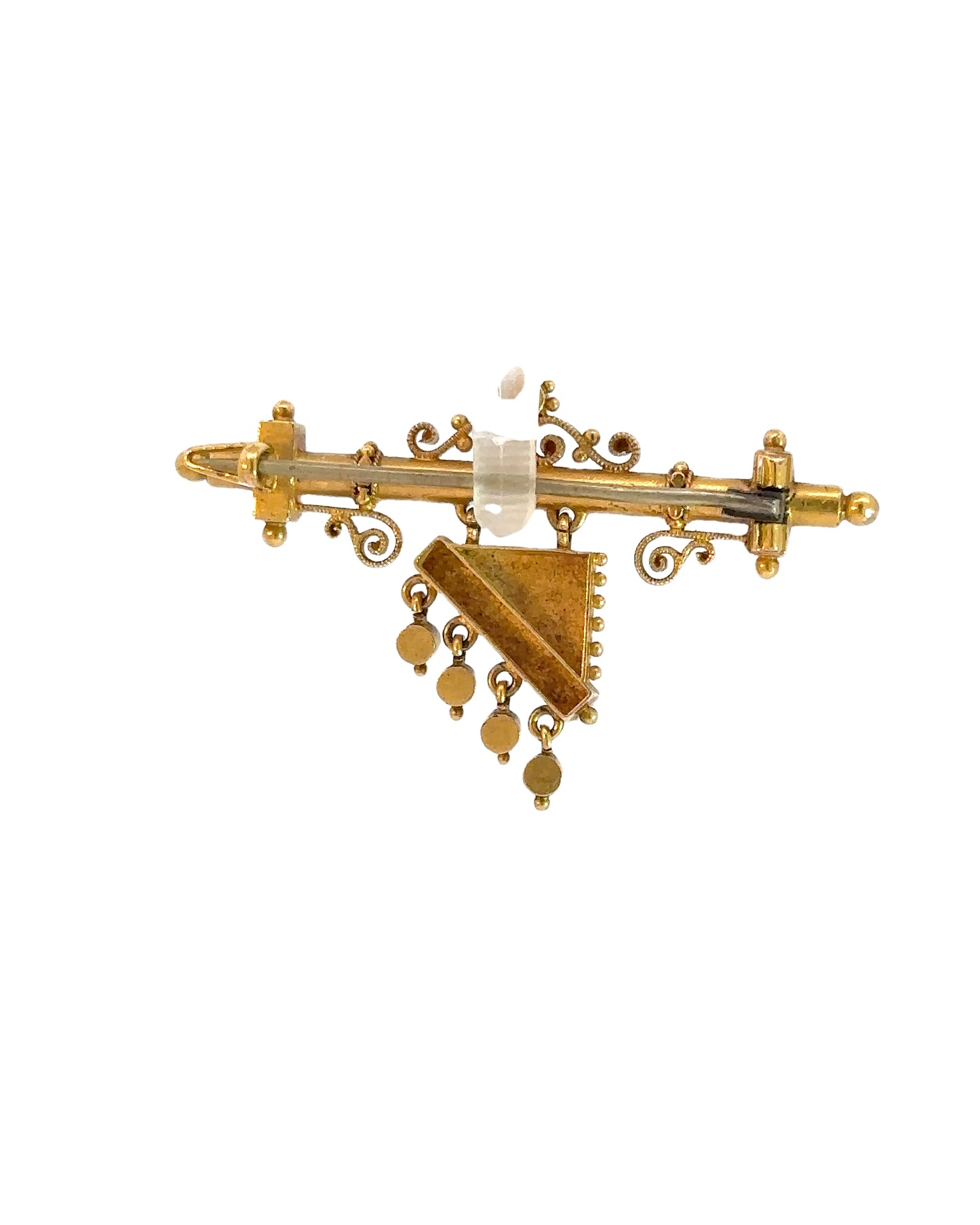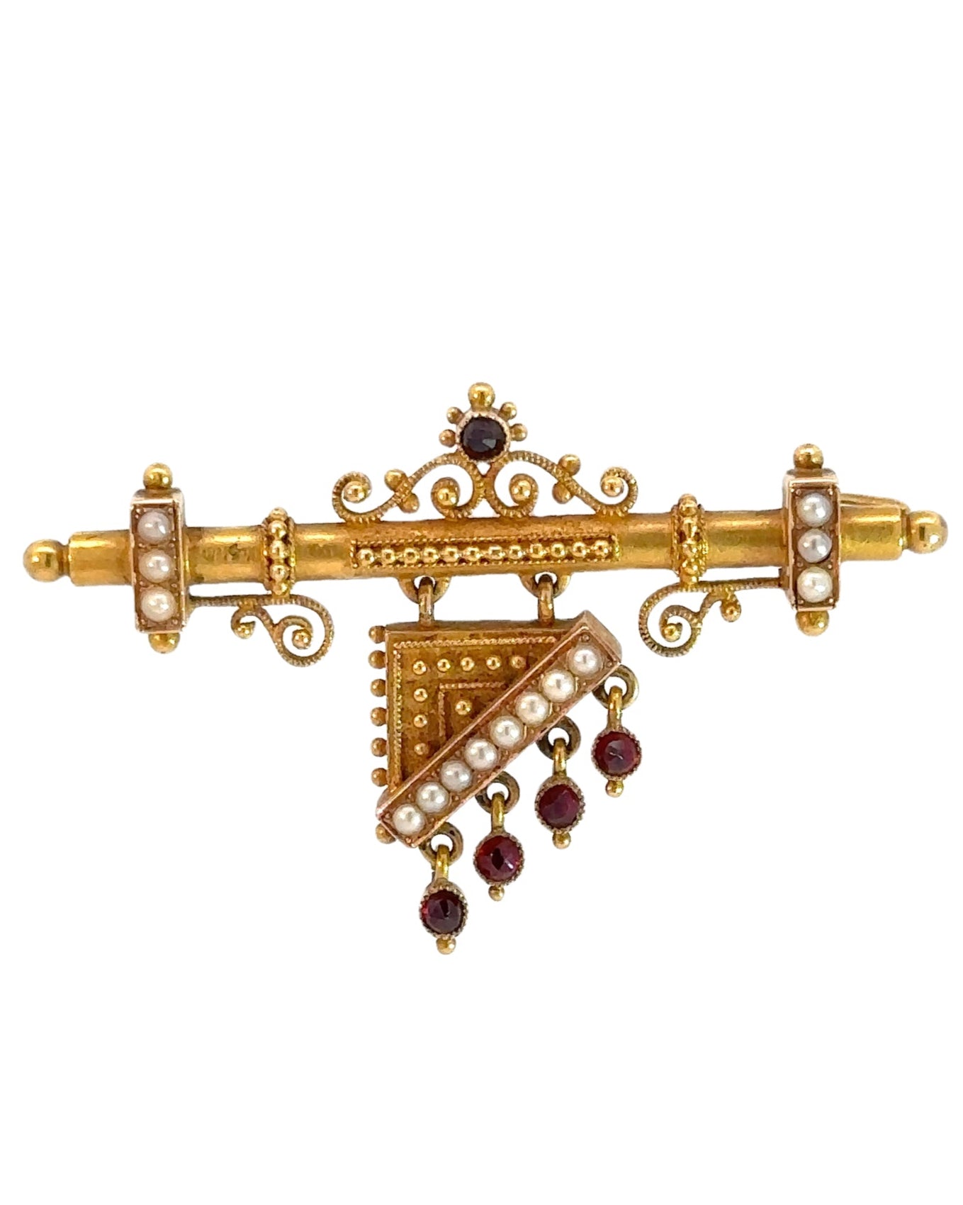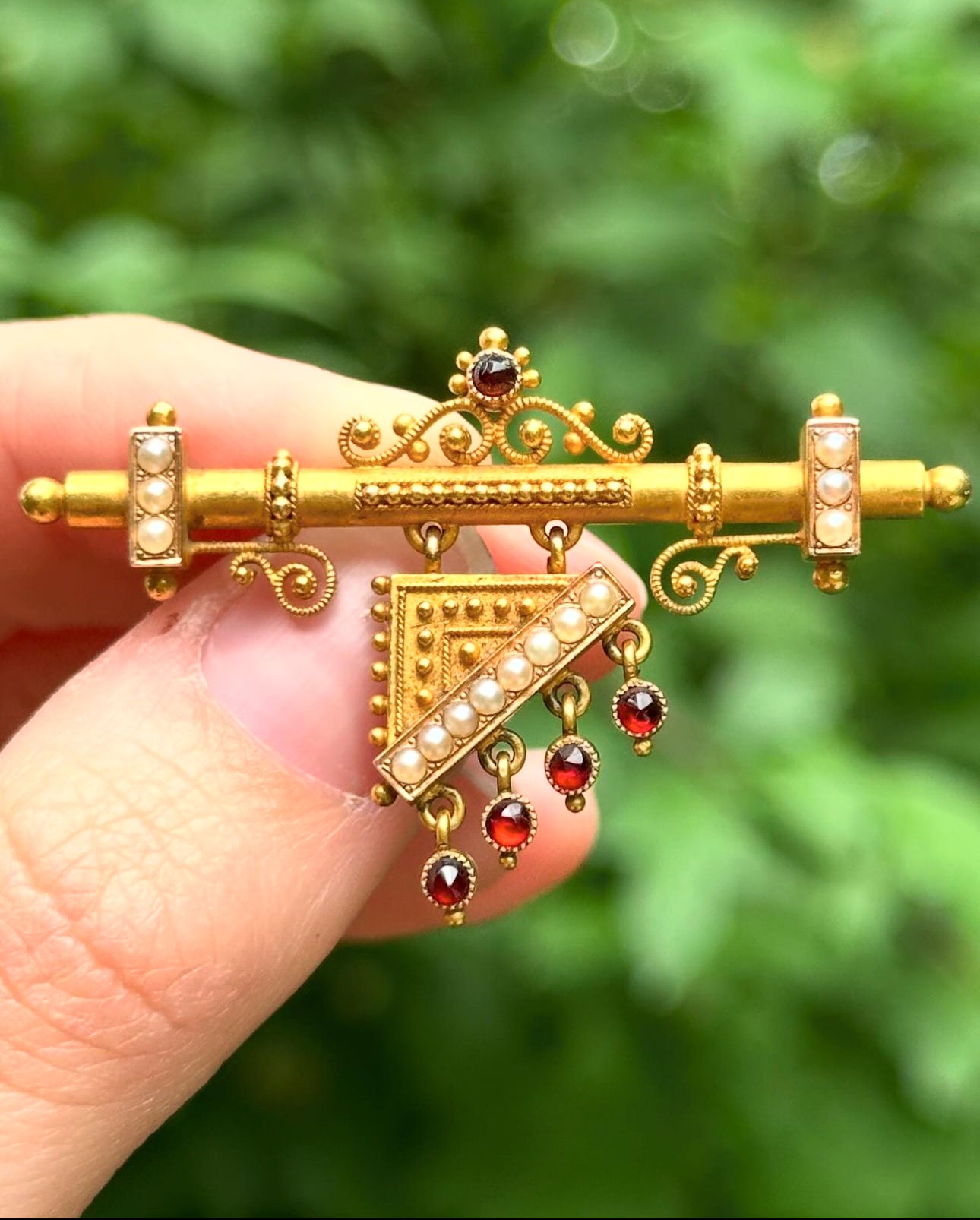 This exquisite antique gold brooch showcases intricate craftsmanship with its delicate filigree work, perfectly faceted garnets, and shimmering pearls. She weighs 6.4 grams and features five garnets and 14 seed pearls. This piece is believed to date back to the early 20th century, circa 1900. She has an extra feature on her pin, a small piece of gold to protect the wearer from being poked. This makes it more versatile, as the wearer can use this piece as a brooch or string it on a chain as a pendant.