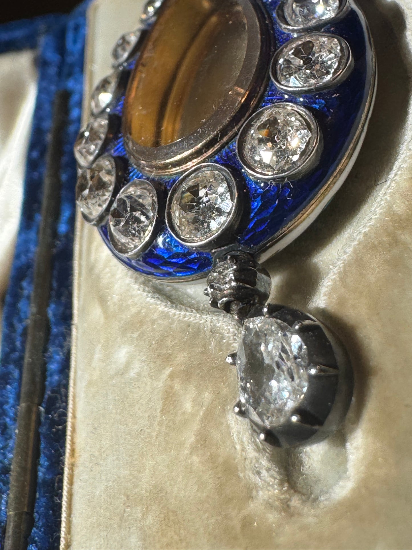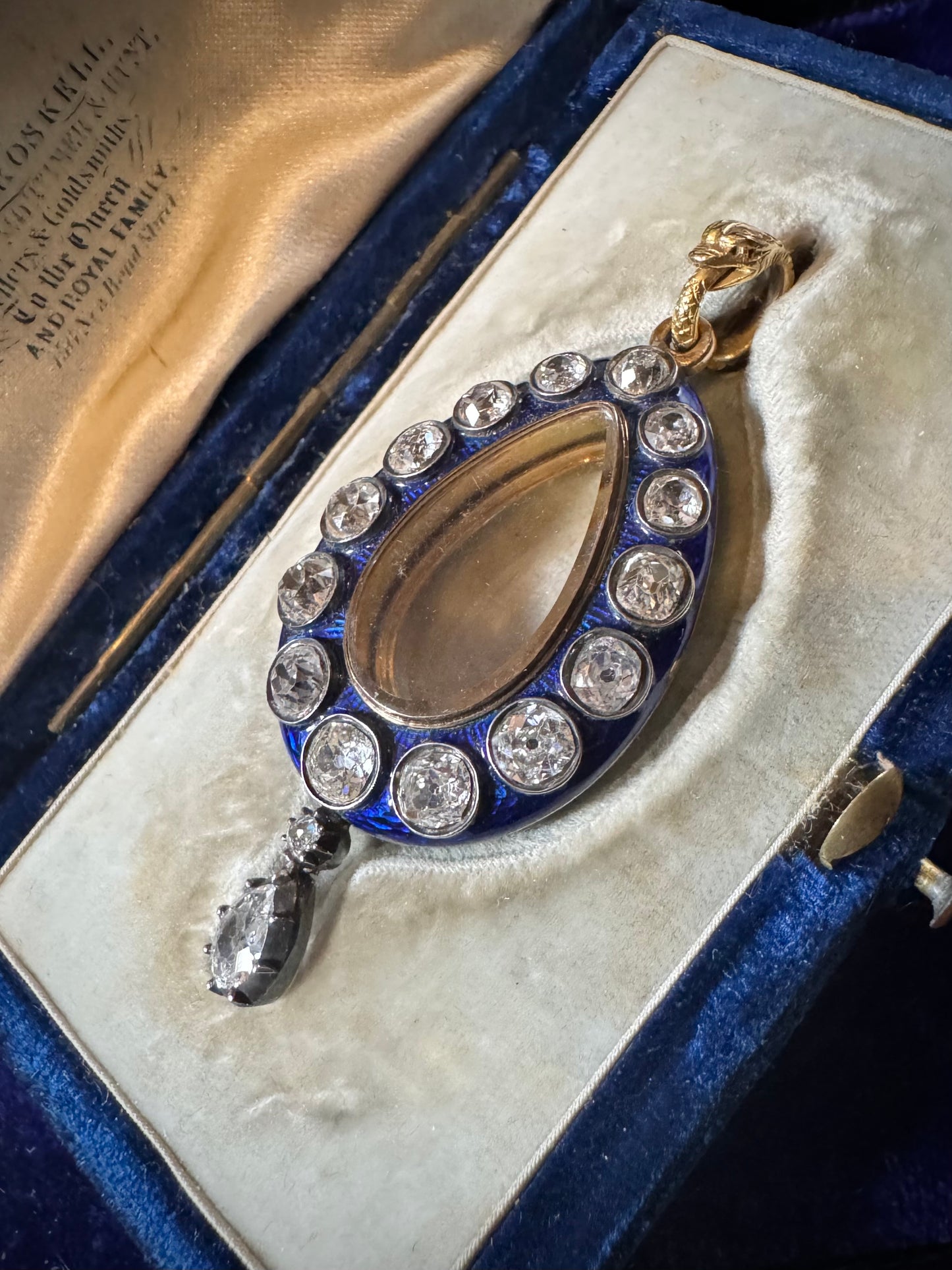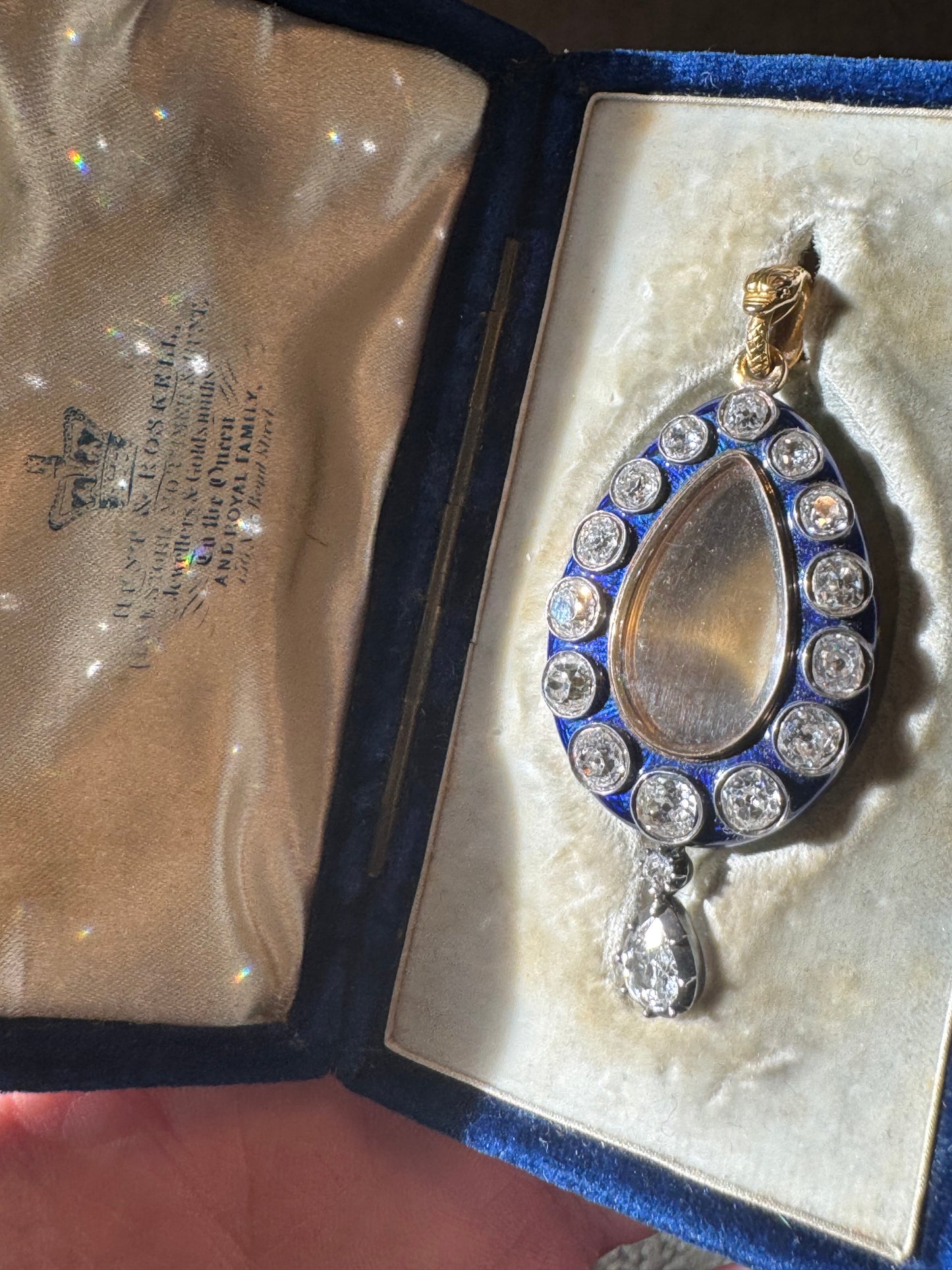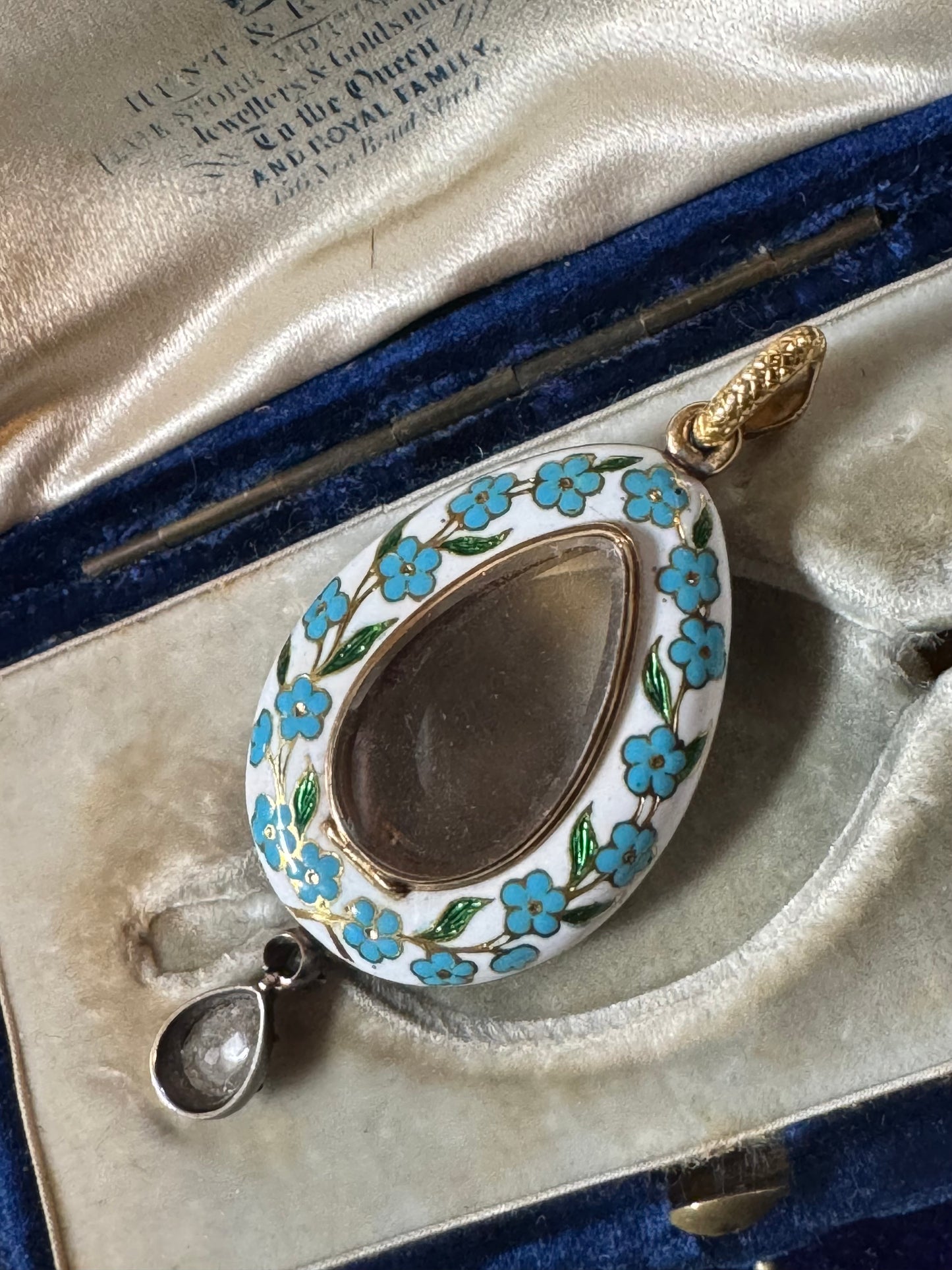 An incredible find and once in a lifetime antique in pristine and in it's original box ~ "Hest & Roskell Jewellers and Goldsmiths To the Queen and Royal Family" ~ This early Victorian locket has an estimated 4.72 carats of gorgeous old mine cut diamonds. They are so nice with F-G color, incredible cuts and VS - SI clarity. The entire locket measures approximately 56 mm, and 46 x 24 mm from the top of the locket to the bottom of the pear drop diamond. I would love to give the rainbows and butterflies in the description but the work speaks for itself, especially on the stunning enamel work