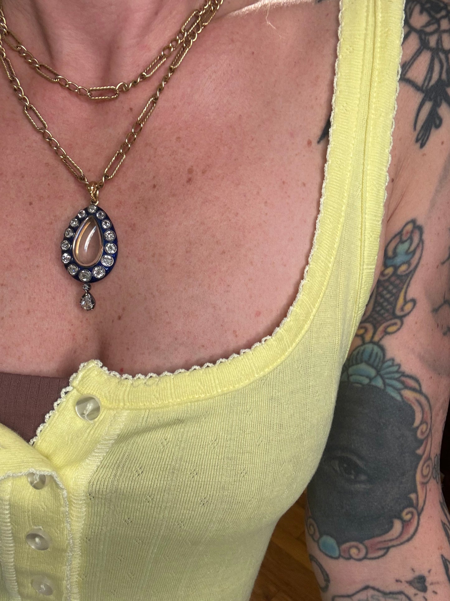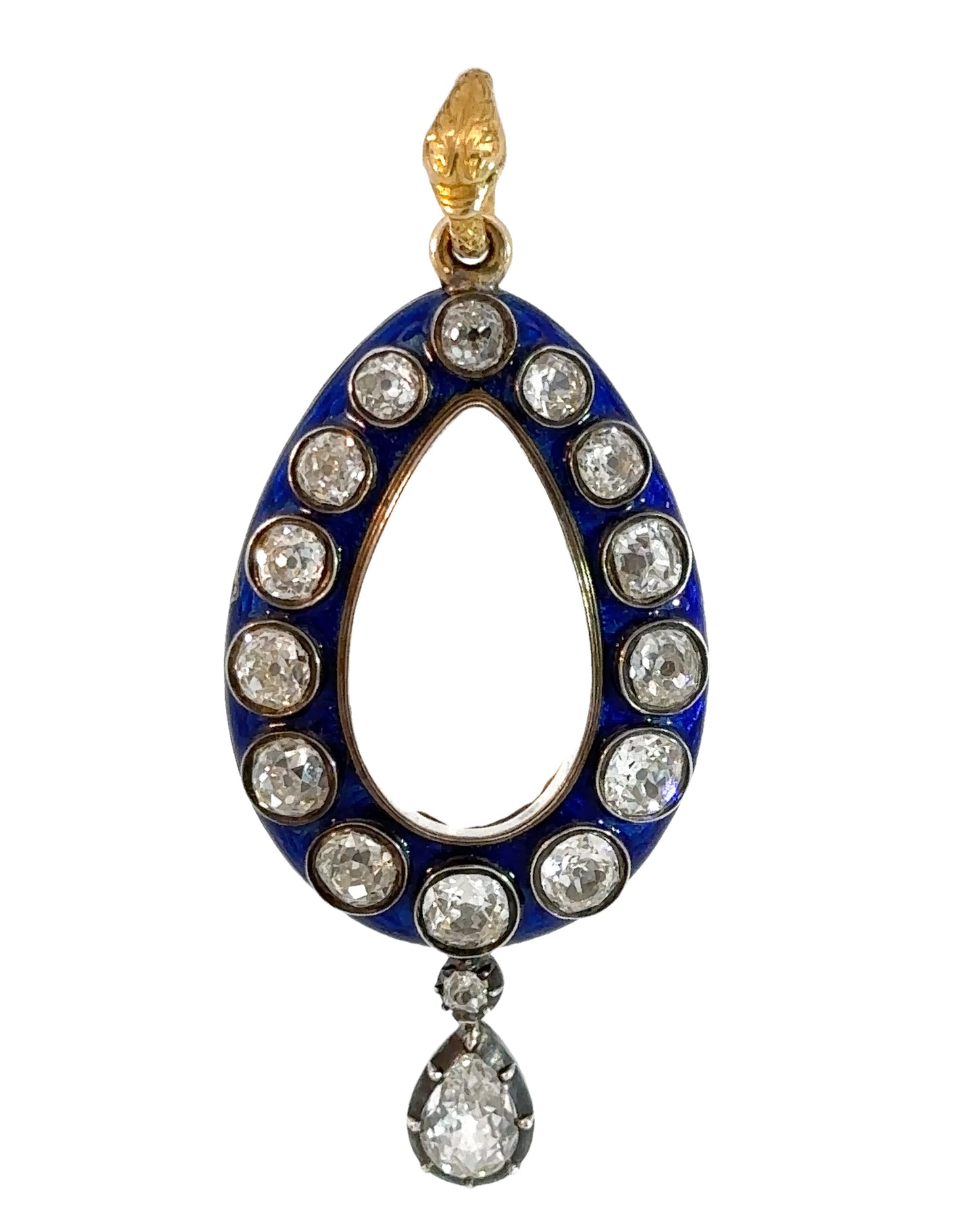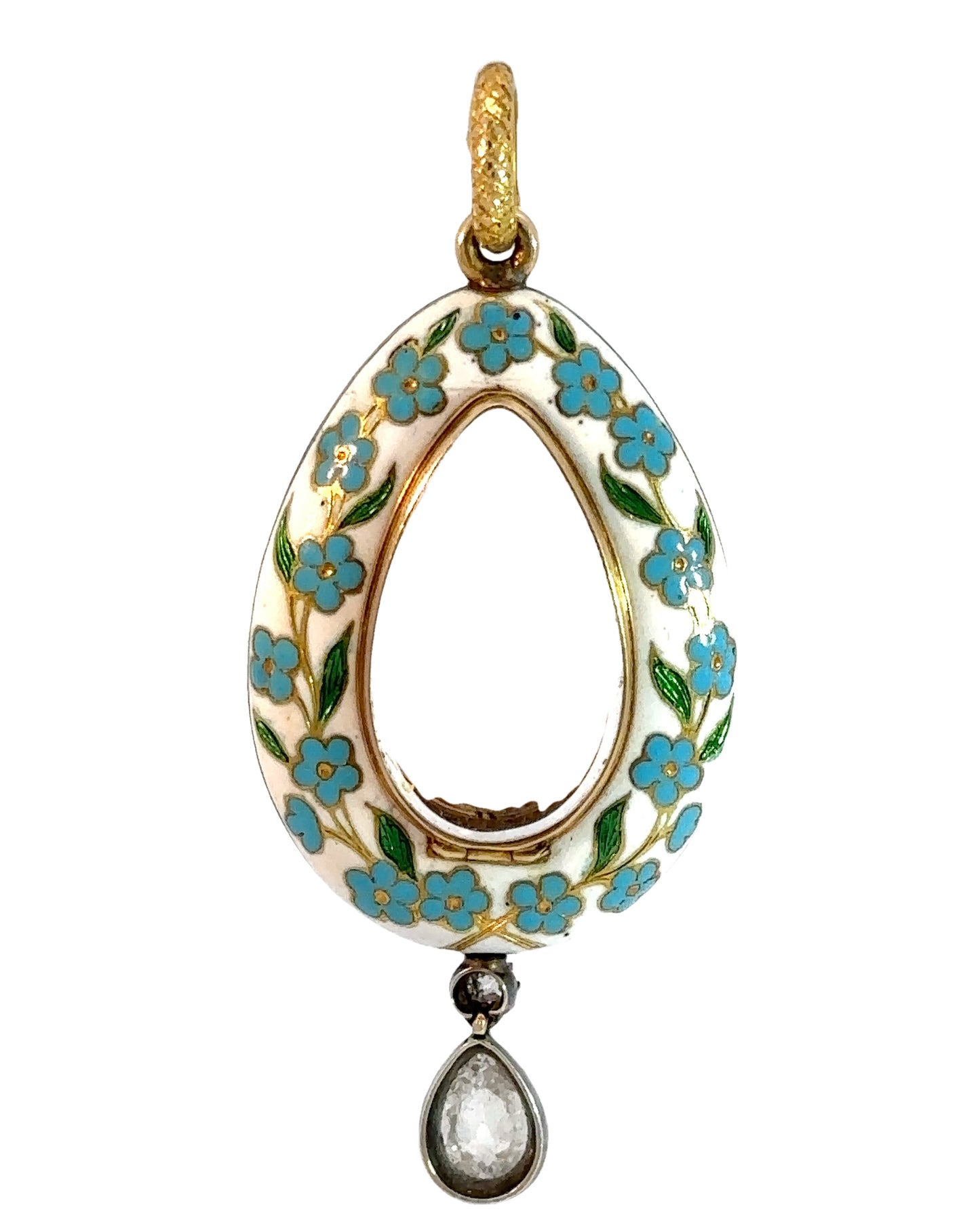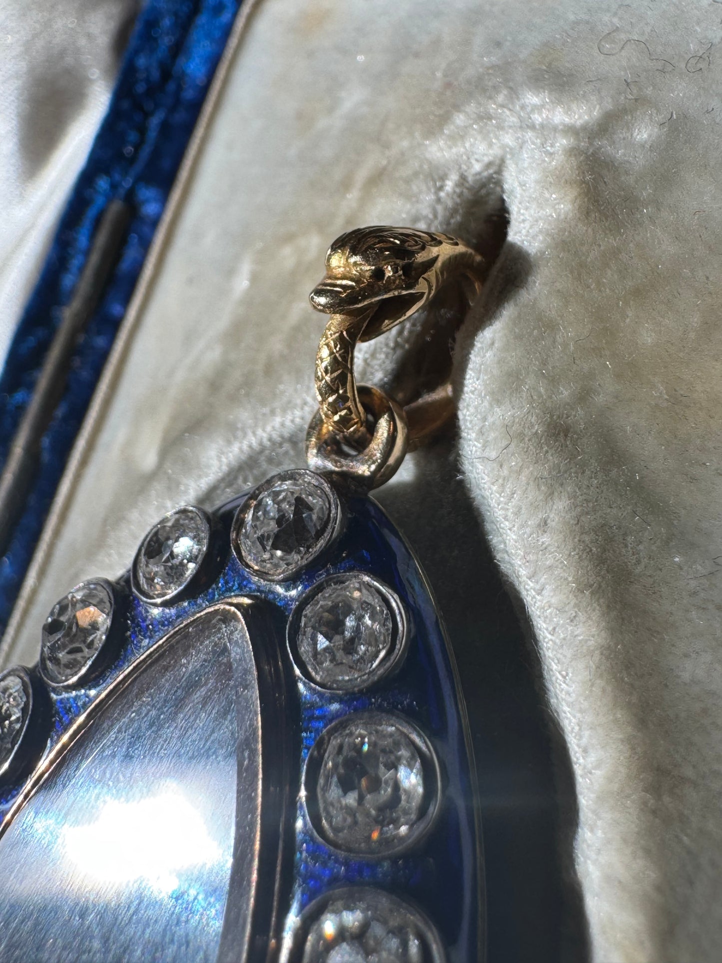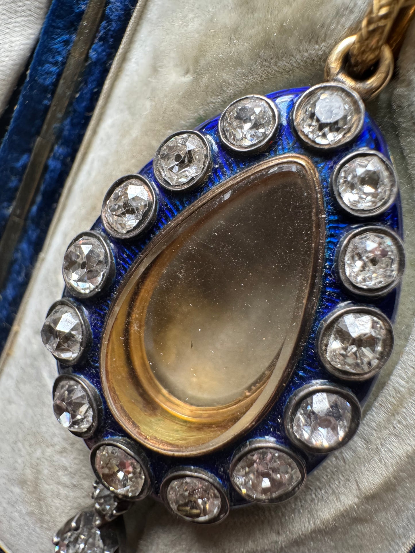 An incredible find and once in a lifetime antique in pristine and in it's original box ~ "Hest & Roskell Jewellers and Goldsmiths To the Queen and Royal Family" ~ This early Victorian locket has an estimated 4.72 carats of gorgeous old mine cut diamonds. They are so nice with F-G color, incredible cuts and VS - SI clarity. The entire locket measures approximately 56 mm, and 46 x 24 mm from the top of the locket to the bottom of the pear drop diamond. I would love to give the rainbows and butterflies in the description but the work speaks for itself, especially on the stunning enamel work