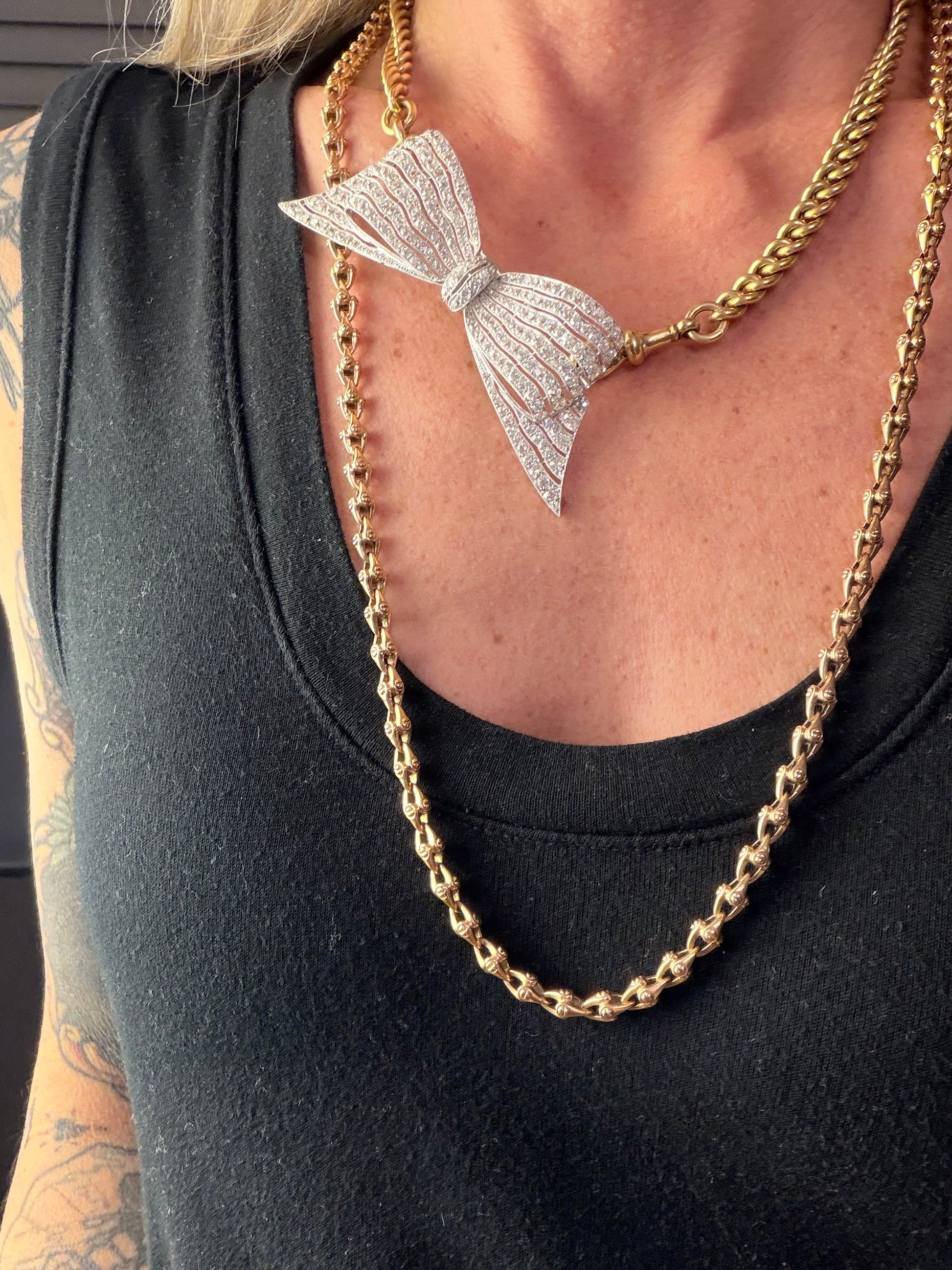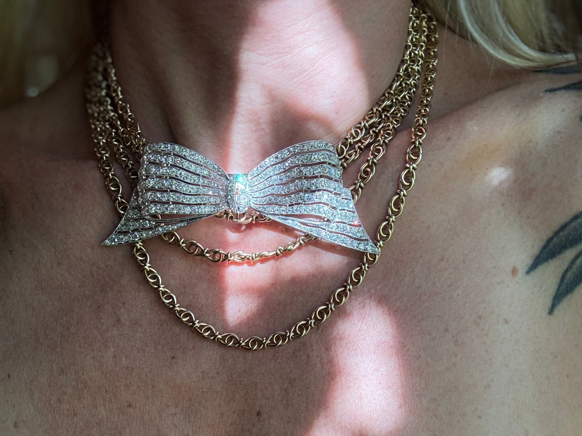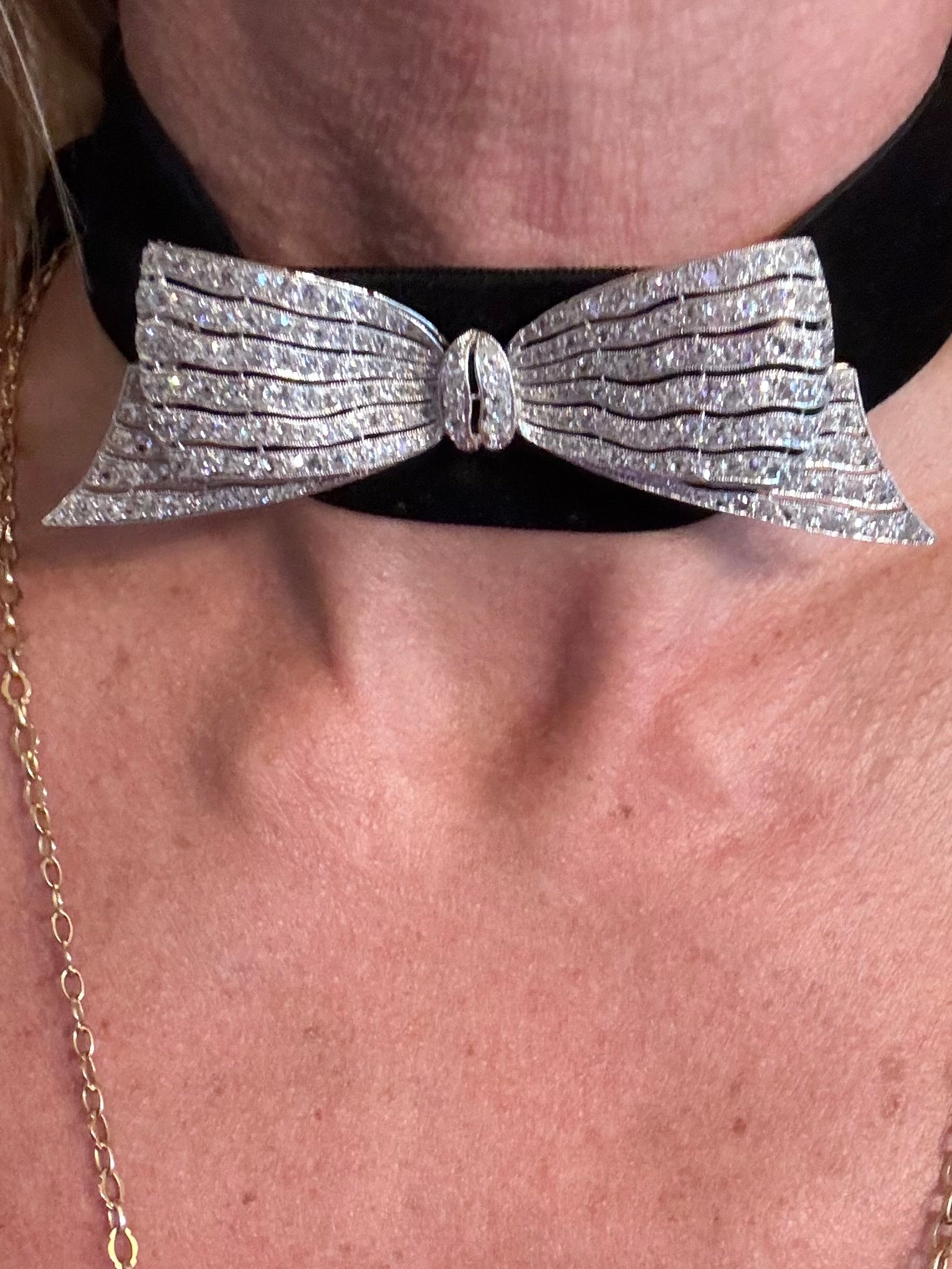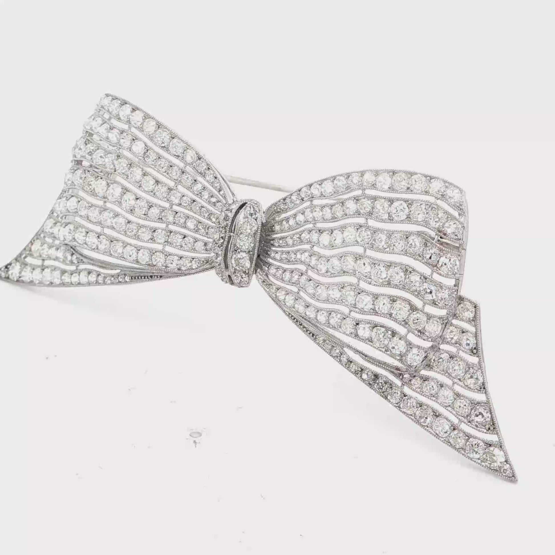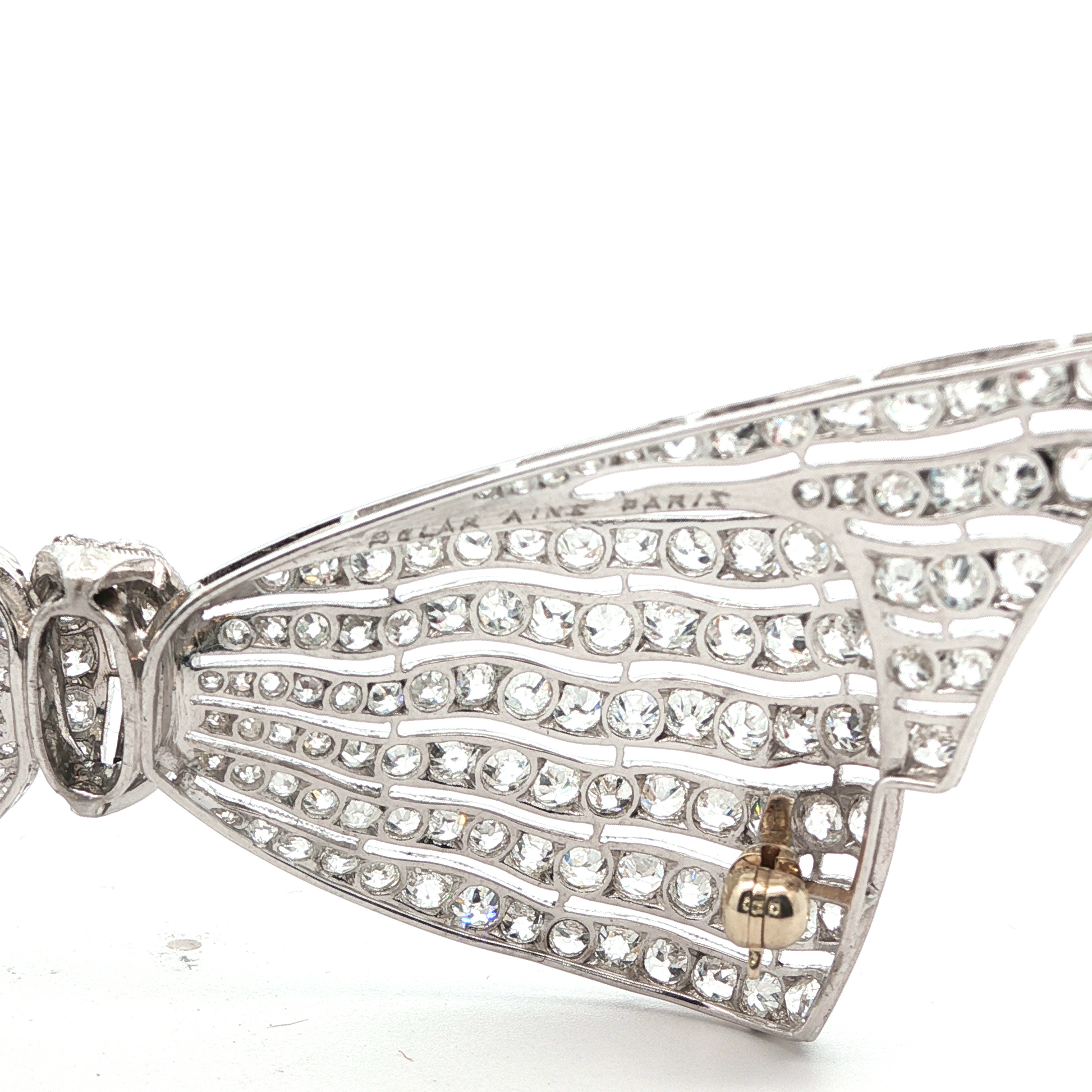 A masterpiece of French antique glamour. This platinum bow brooch, weighing a striking 18.9 grams, is approximately 11.50 carats of old mine cut diamonds in bright G–H color and VS clarity. At 94mm x 40mm, it has the scale and sparkle of a true Parisian showpiece. Numbered "7391" and finished with French assay marks and a Paris retailer signature "LAX AINE PARIS"