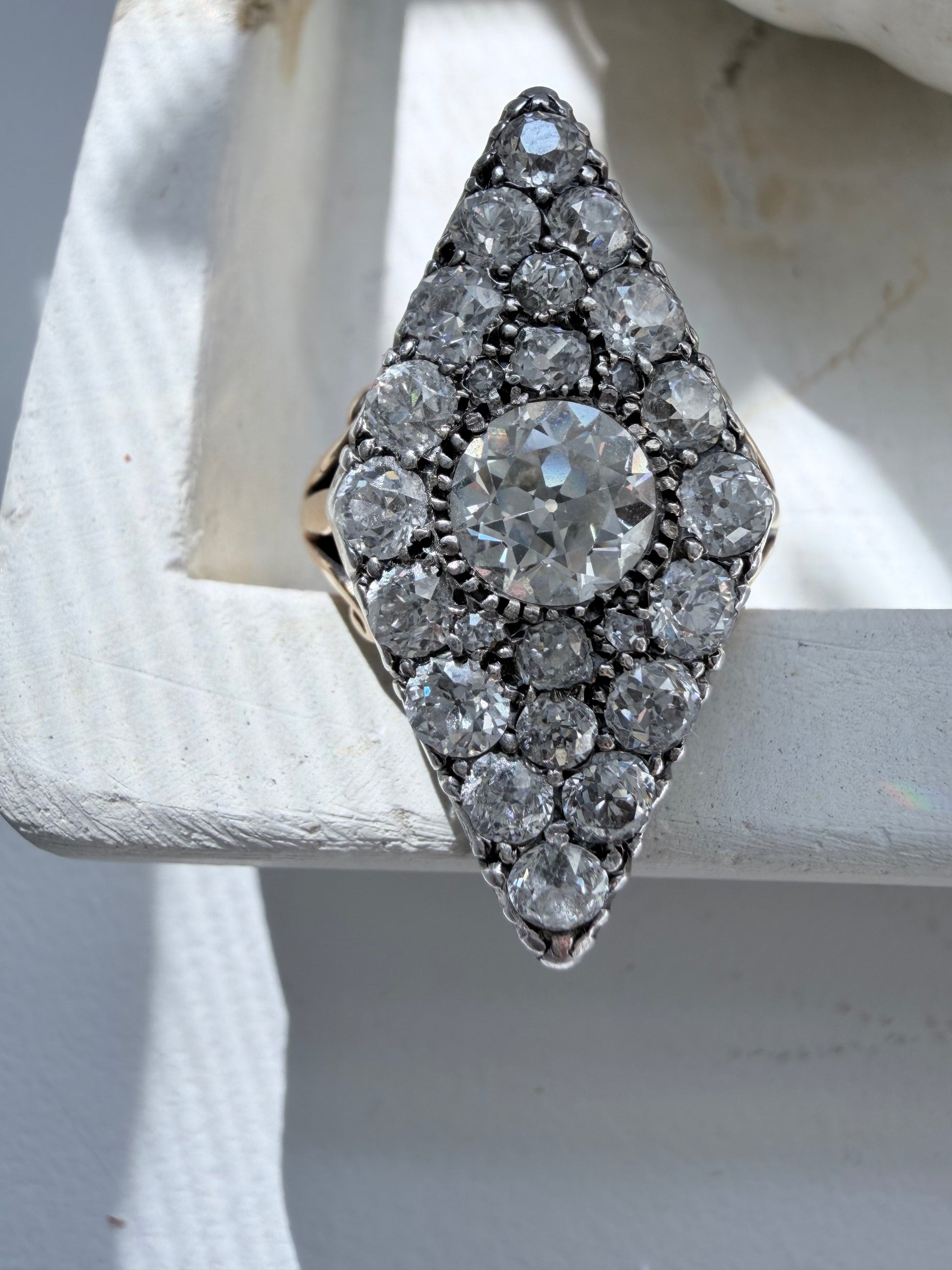 Antique navette ring in 18k gold and silver, weighing 7 grams. Measuring 35 x 15 mm. Set with an old cut diamond center weighing approximately 1.25 carats, graded H/VS, with an additional approximately 3 carats of old cut diamonds throughout.