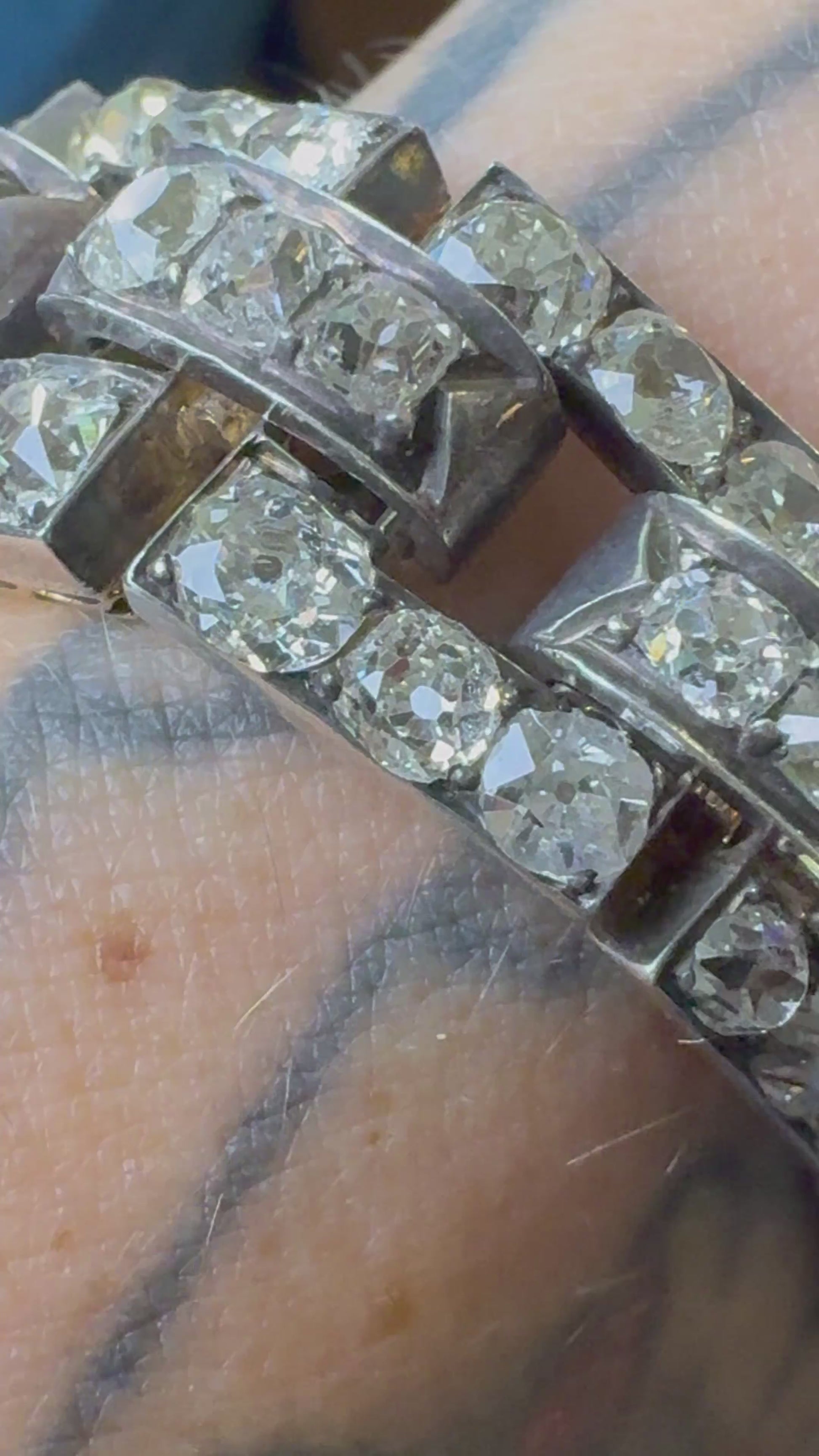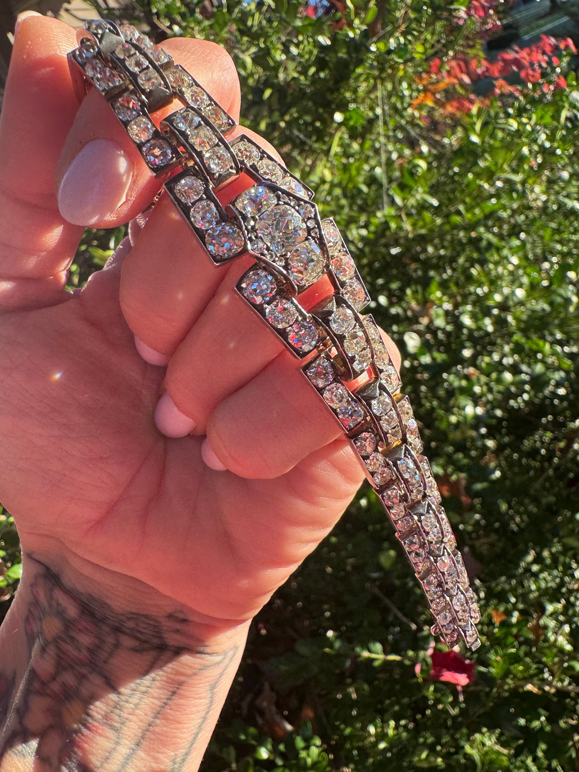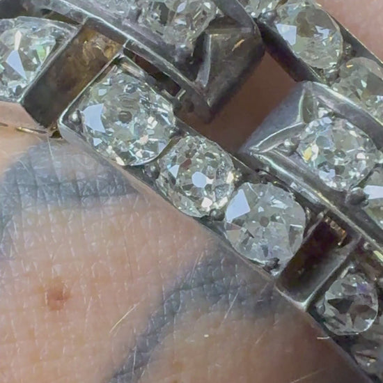 Circa 1850 a Victorian masterpiece in 18K gold and silver, weighing a bold 44.5 grams. Set with approx. 22 carats of large, chunky old mine cuts H–J color, VS–SI clarity all fire, all attitude. The largest old mine cushion is approximately 1.28 carats. The top center spans 27mm, length 7.6”, with French import marks and every original detail intact. Heavy, luminous, and utterly breathtaking. + can be shortened by our shop.