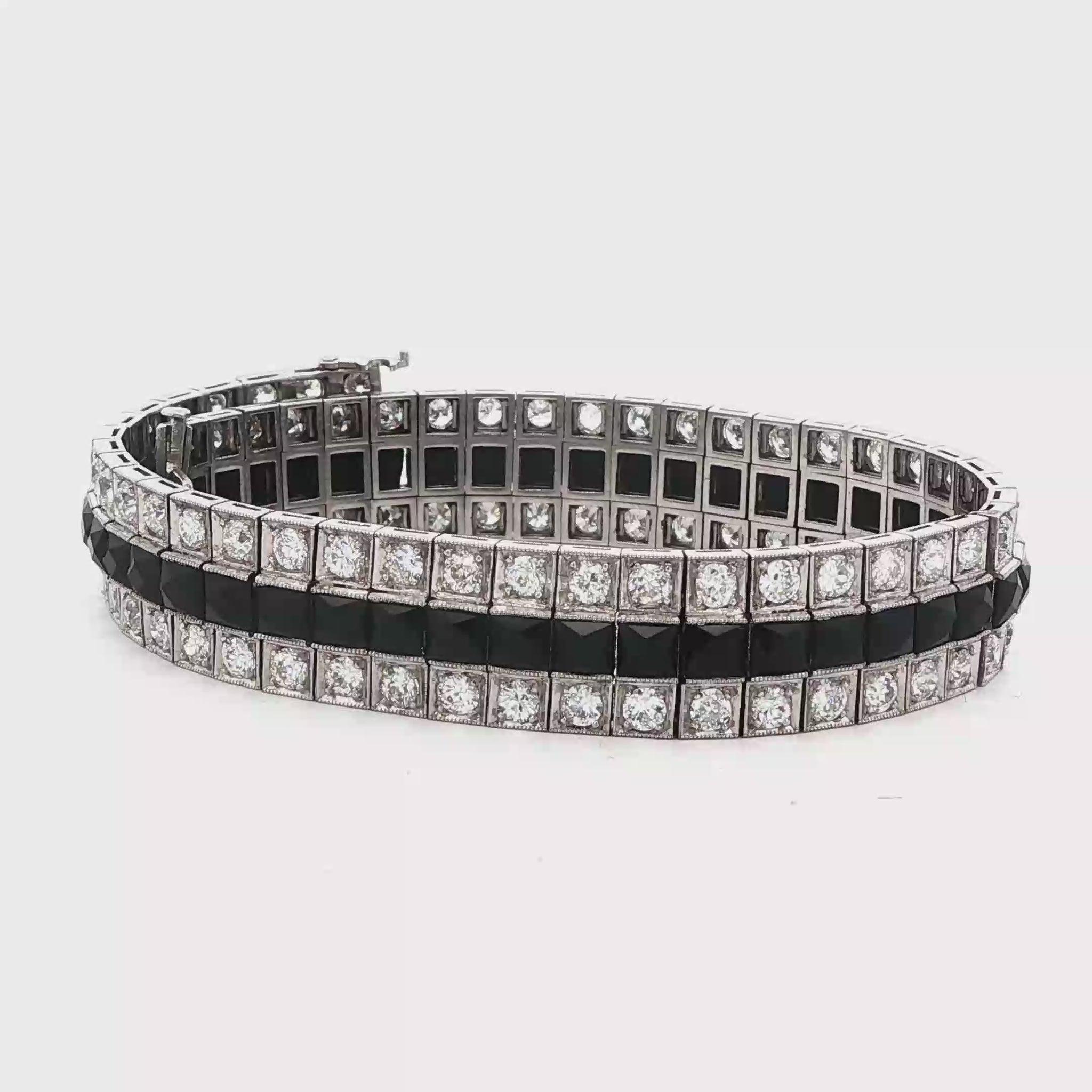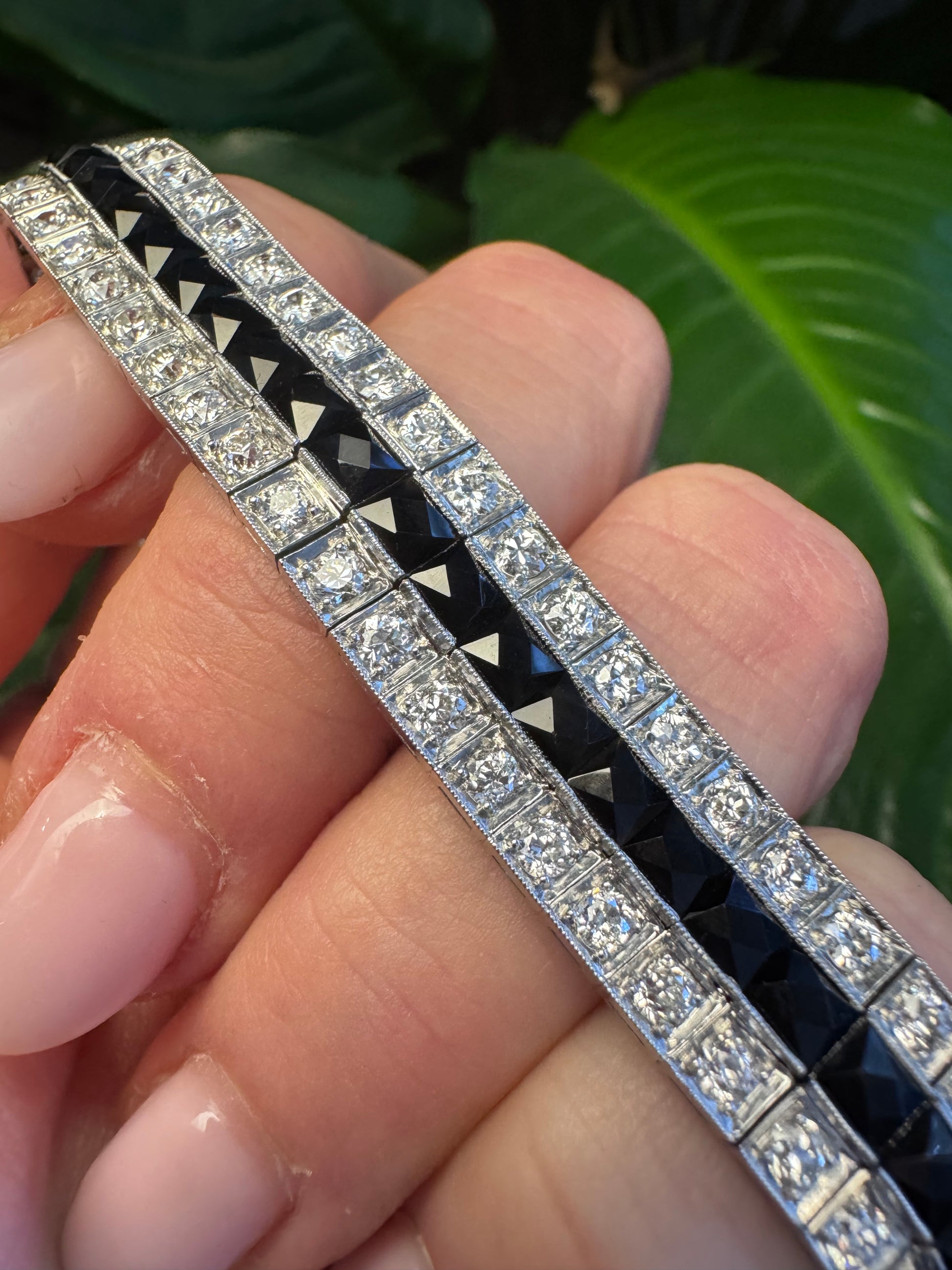 Art Deco Mixed Antique Cut Diamond and Onyx Line Bracelet