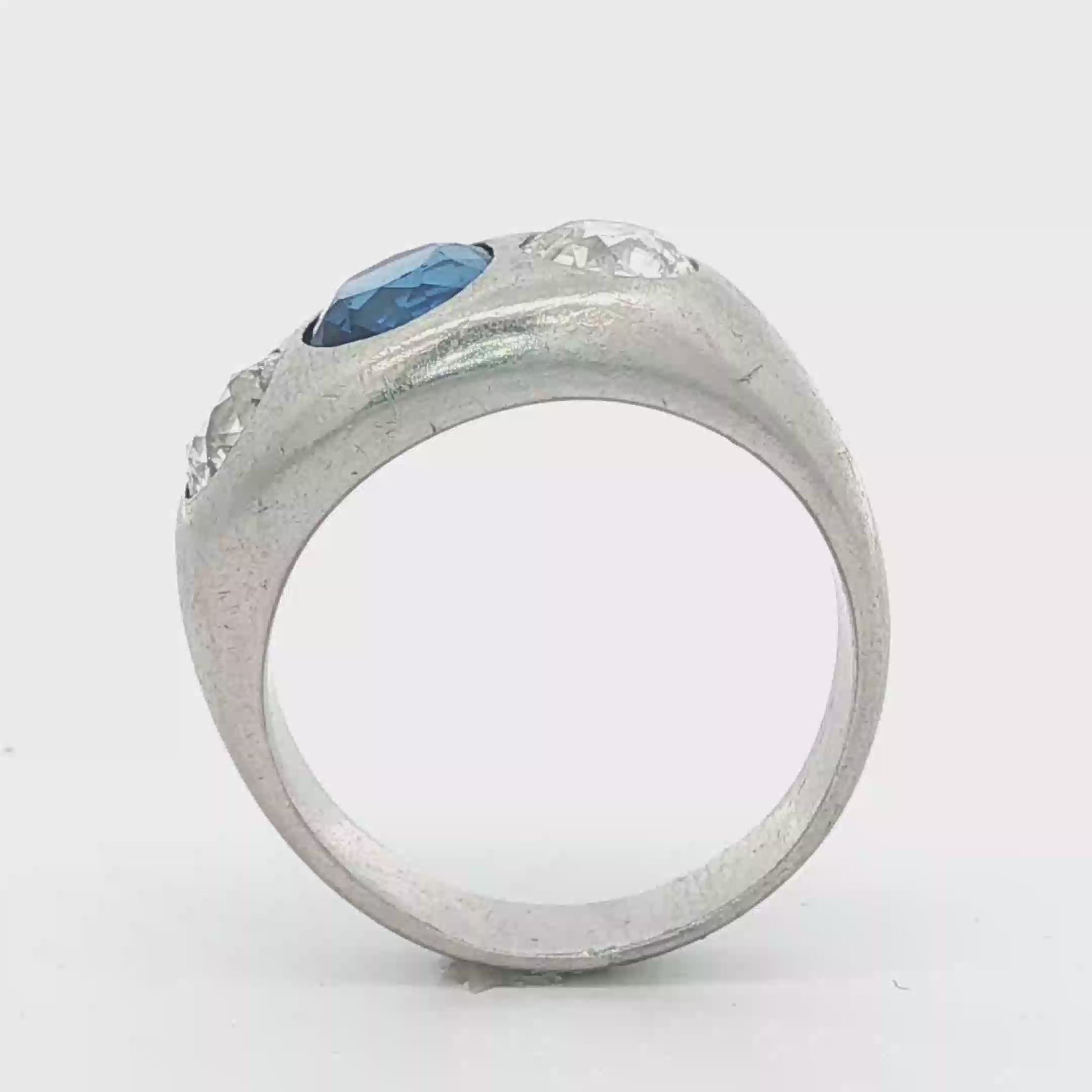 Crafted in platinum and weighing a solid 17 grams. At the center sits a 2.10 ct Burmese sapphire, no heat, accompanied by certification and prized for its exceptional color. The stone is set low and clean, letting the color do all the work.