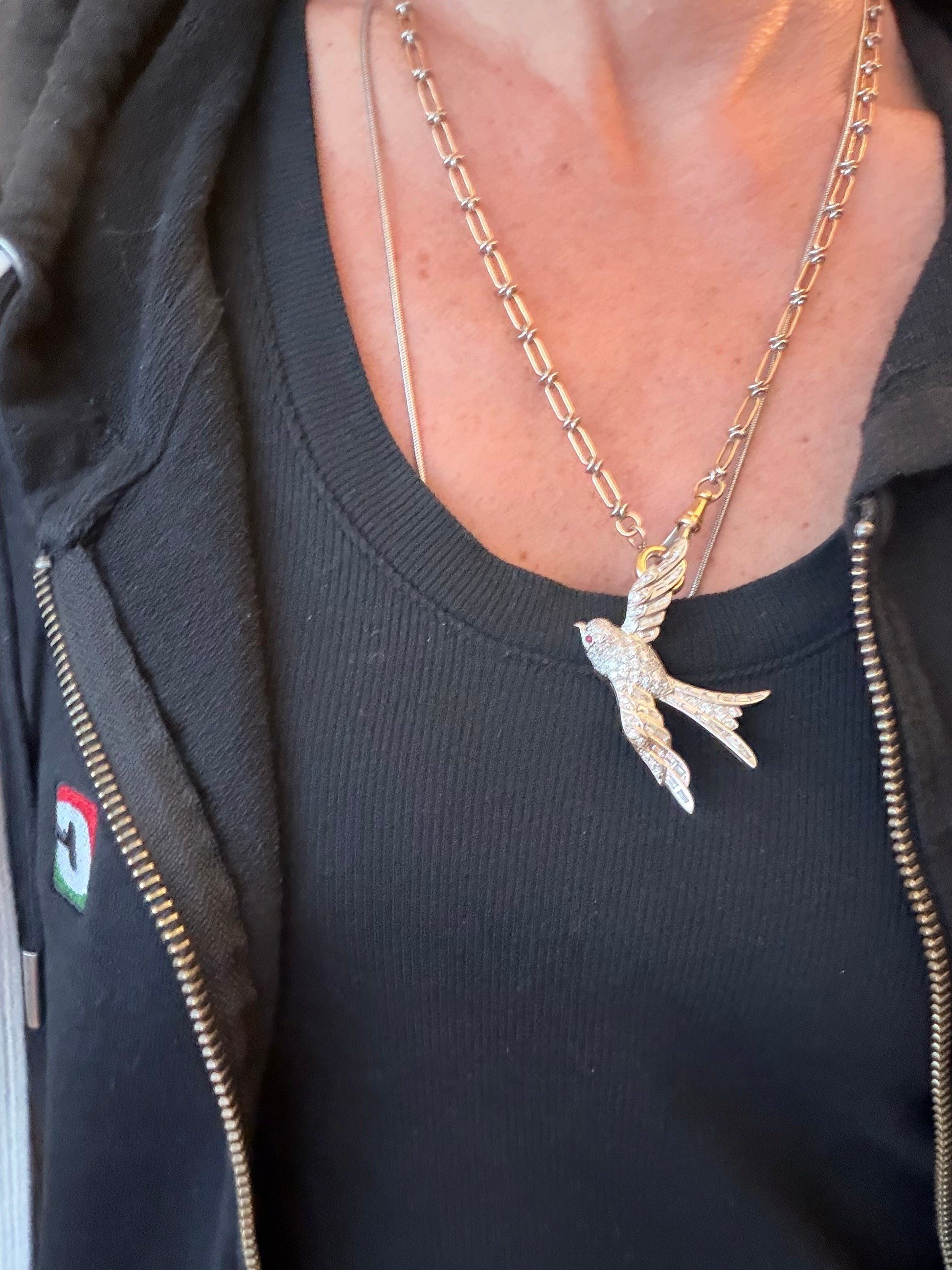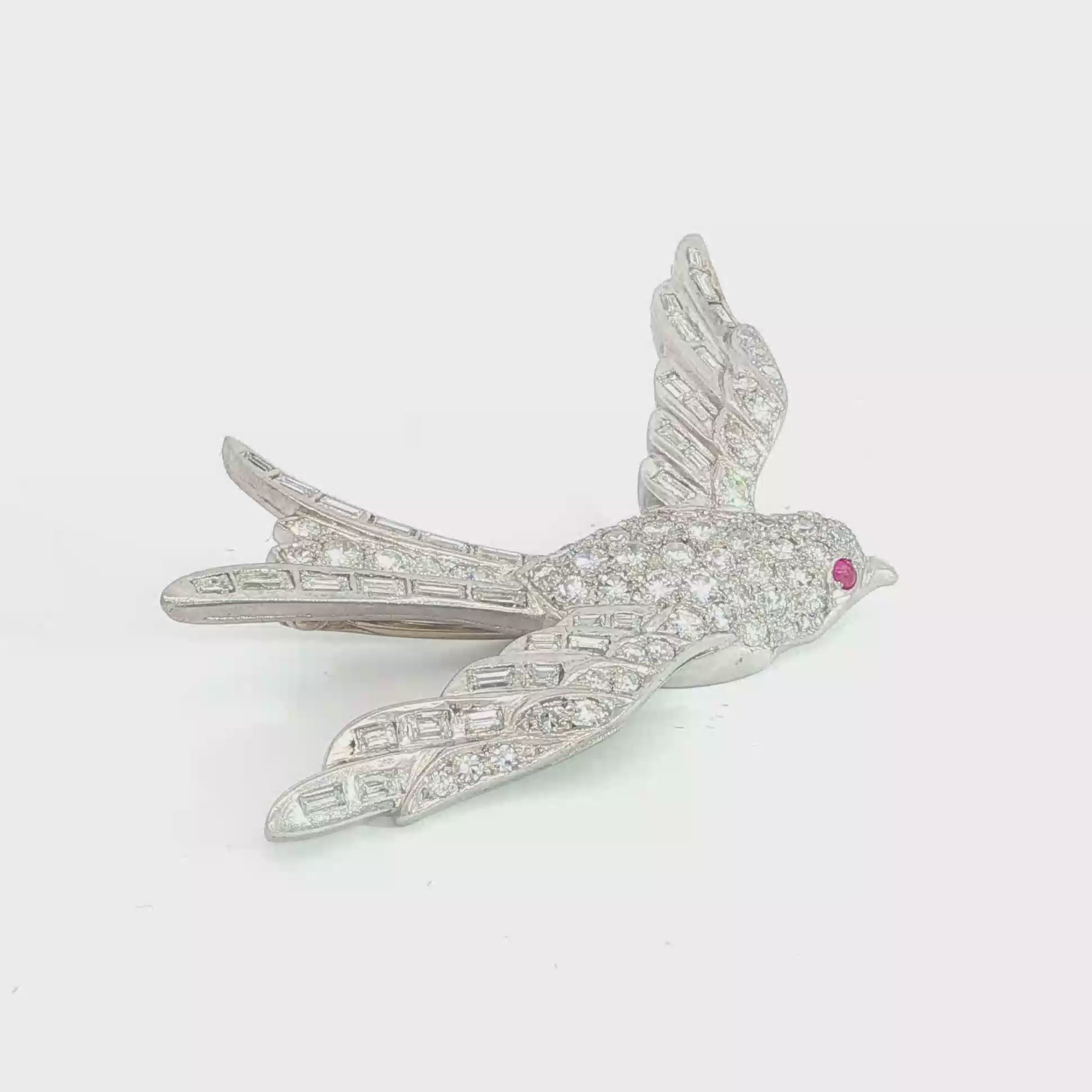 A symbol of devotion and safe return, the swallow has long been associated with love, fidelity, and hope. Rendered here in platinum and dating to the 1940s, this brooch carries both meaning and material presence, weighing a substantial 16.2 grams.