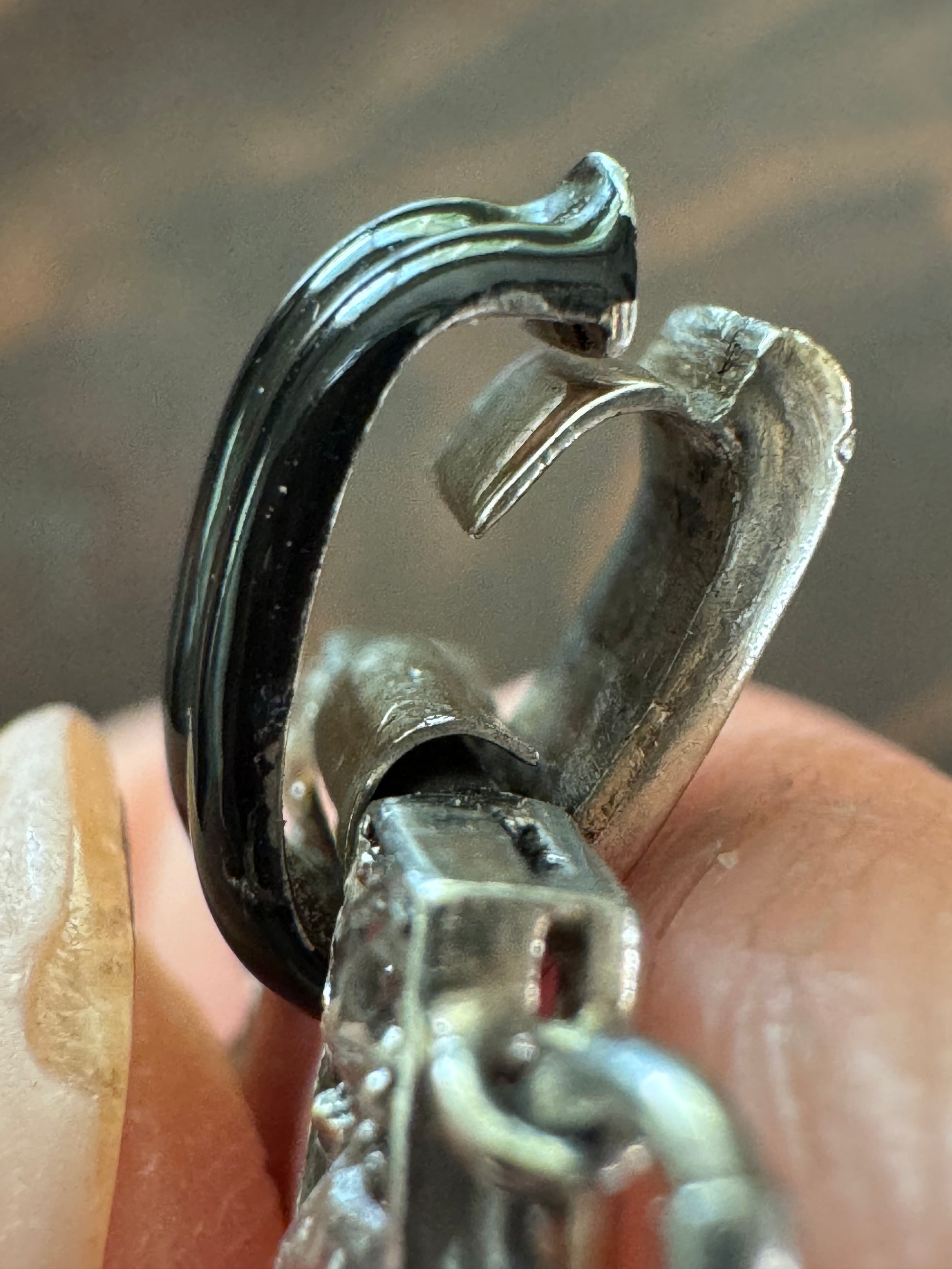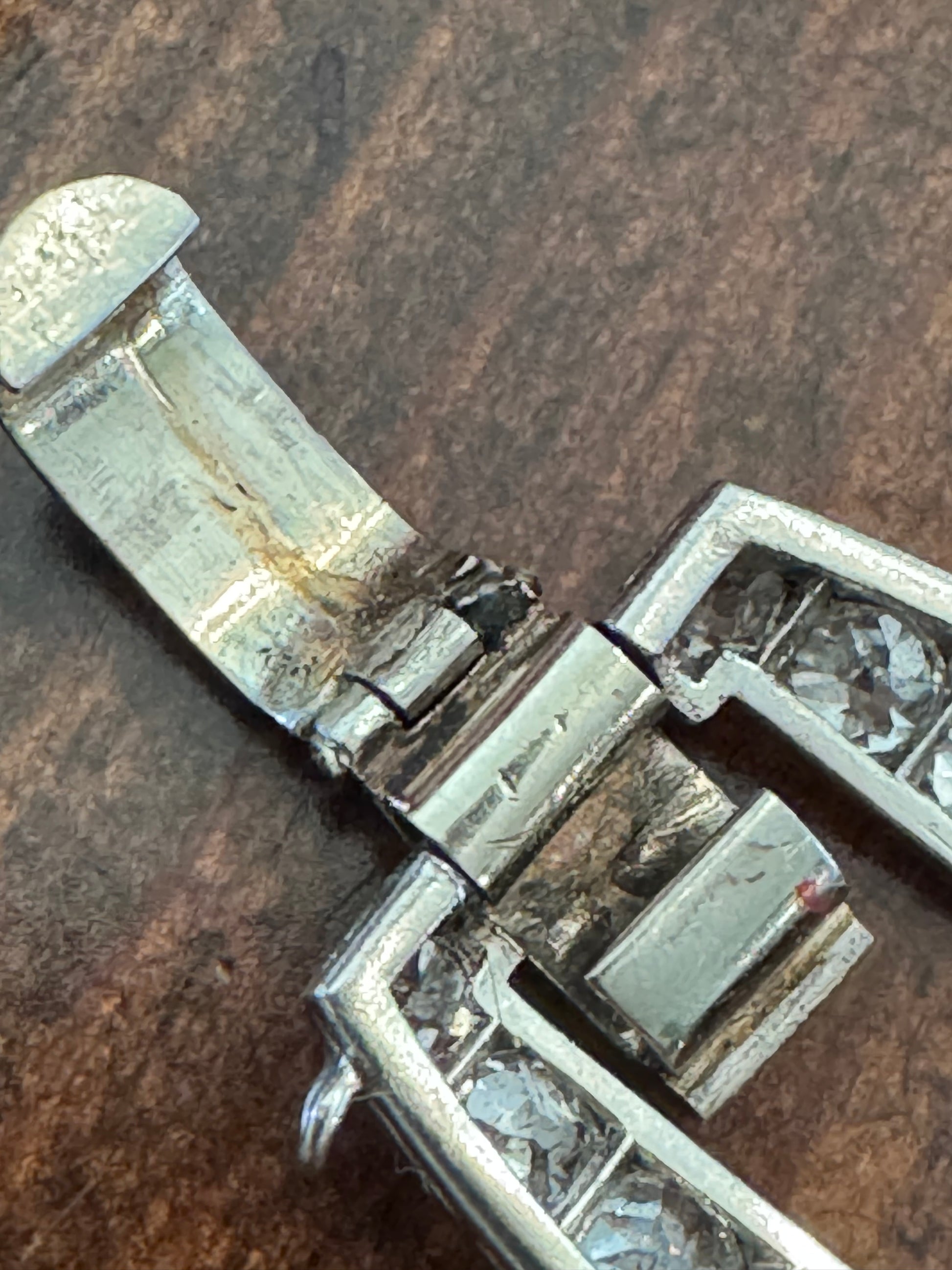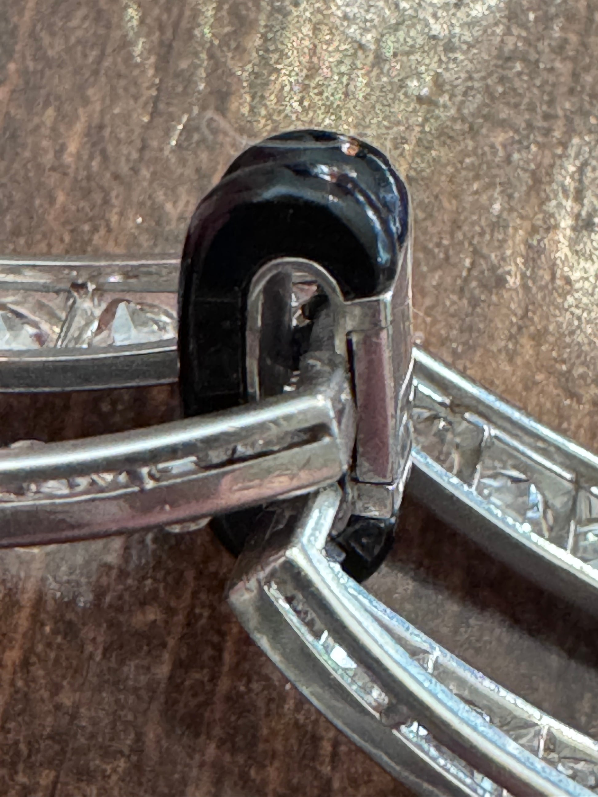 Measuring 7.5 inches in length and 15mm in width, she sits with substance and ease — a bracelet that feels as powerful as it looks. The clasp is master-level engineering: tight, secure, with black enamel detail that continues the endless pattern. Stamped with French assay and partial maker’s marks for Charles Fontana & Cie, and accompanied by its original fitted box, Fontana – 13 Rue Royale – Paris.