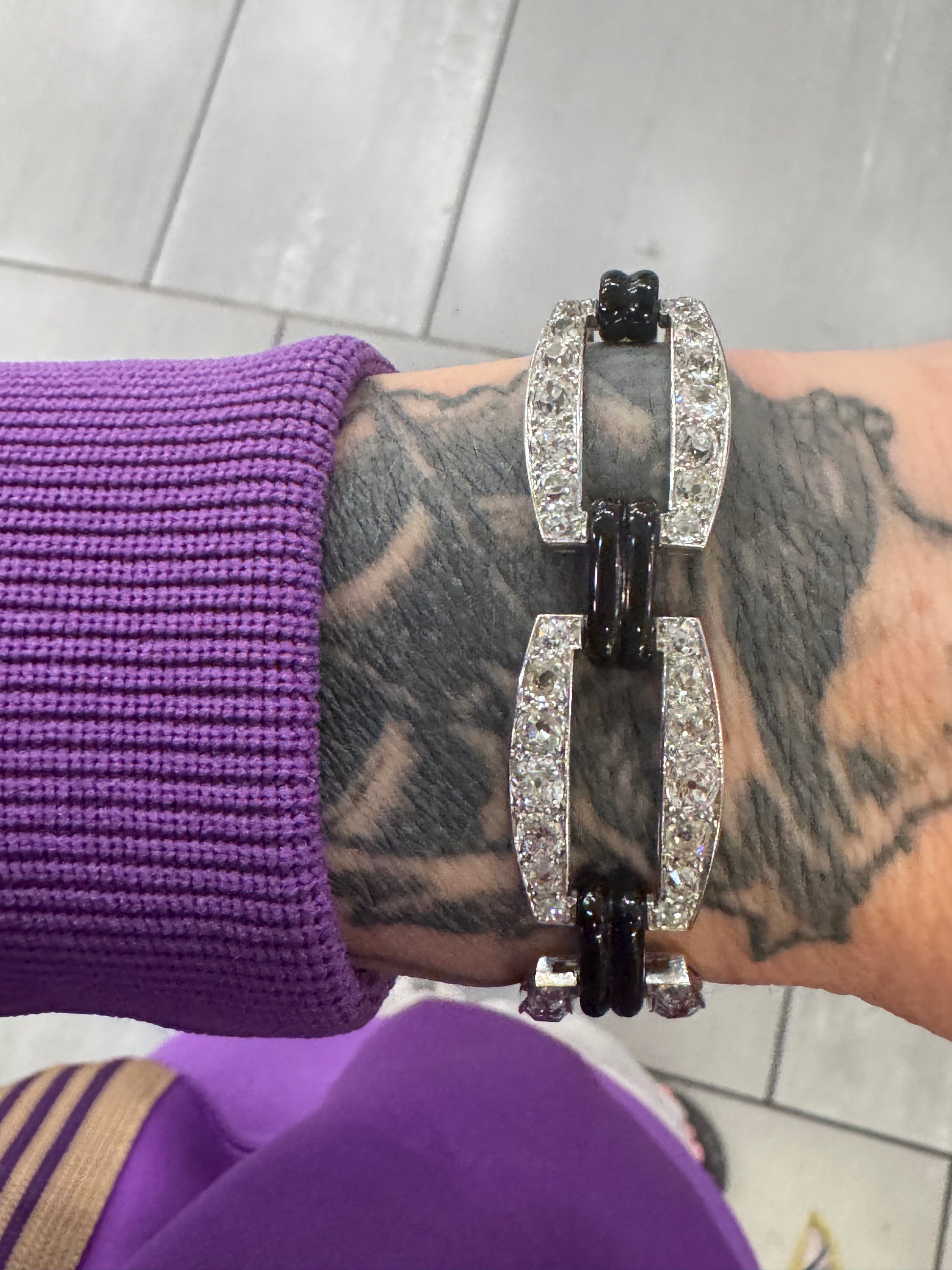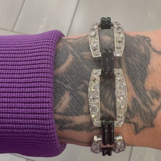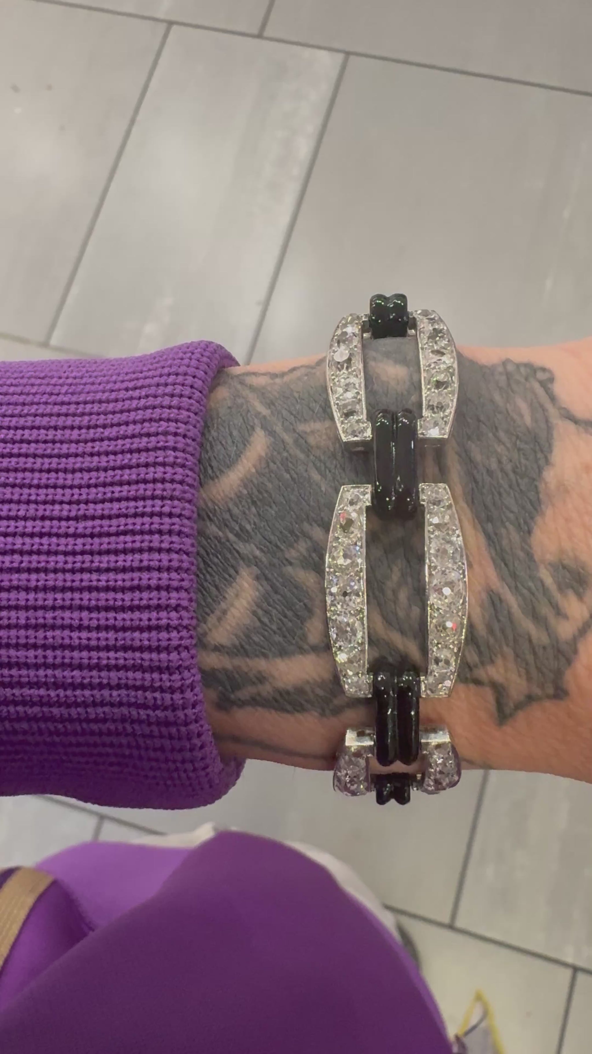 Circa 1925 — a study in balance, precision, and Parisian cool. Crafted in platinum and 18k white gold, weighing 31.8 grams, this bracelet holds approximately 10.00 carats of old mine cut diamonds, their soft candlelight brilliance playing perfectly against sleek carved black onyx spacers. Seven diamond-set tapering links, joined in perfect rhythm, create a piece that’s both architectural and sensual — the very definition of Art Deco refinement.