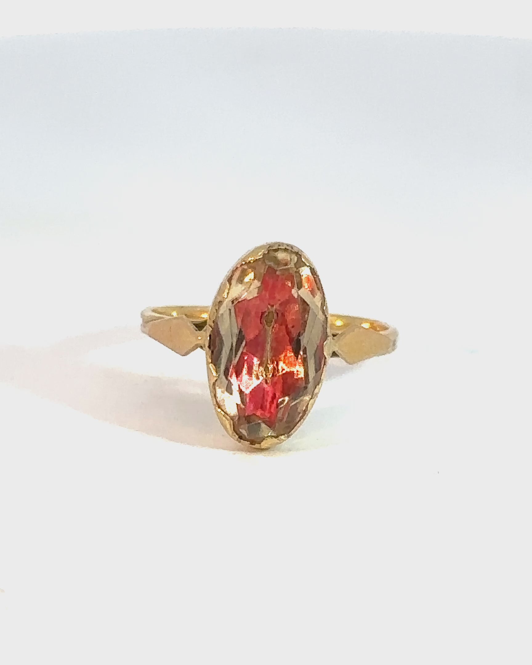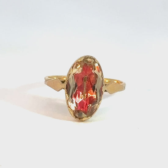A simple and beautiful antique ring, from the Georgian period, with a French hallmark on the outside of the band. The focal point is the large central faceted rock crystal, measuring 15 x 9 mm. This lovely stone is foiled with an orange-y pink colored backing, adding dimension and color to the clear stone.