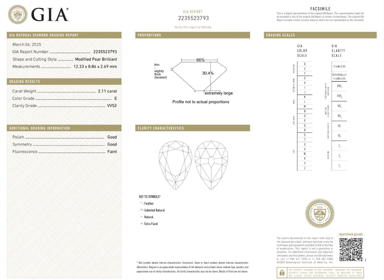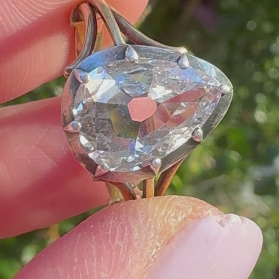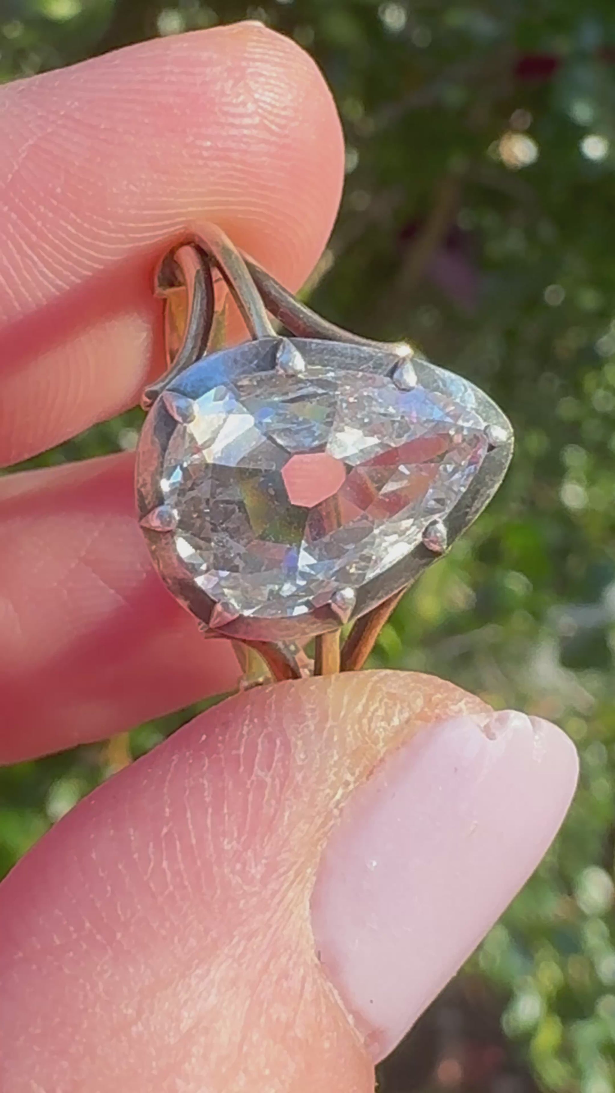 18k gold with silver-topped Georgian style custom mount centered with a certified 2.11 ct E/VVS antique pear cut that spreads like a 5 carat stone, it delivers major presence with that coveted old-world light return.