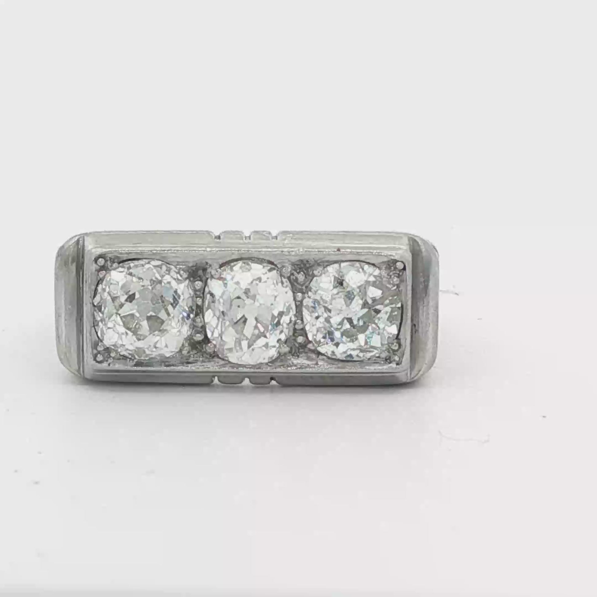 Crafted in 18k white gold and weighing 11.1 grams, this three-stone ring has beautiful balance and presence. Set with three old mine cut diamonds weighing approximately 0.90 carat each, the stones fall in the H color range with SI clarity. The ring measures approximately 8.4 mm across the top and wears comfortably on the hand. French hallmarked with a maker’s mark, it reflects the quality and craftsmanship of its origin. Sizeable 7.