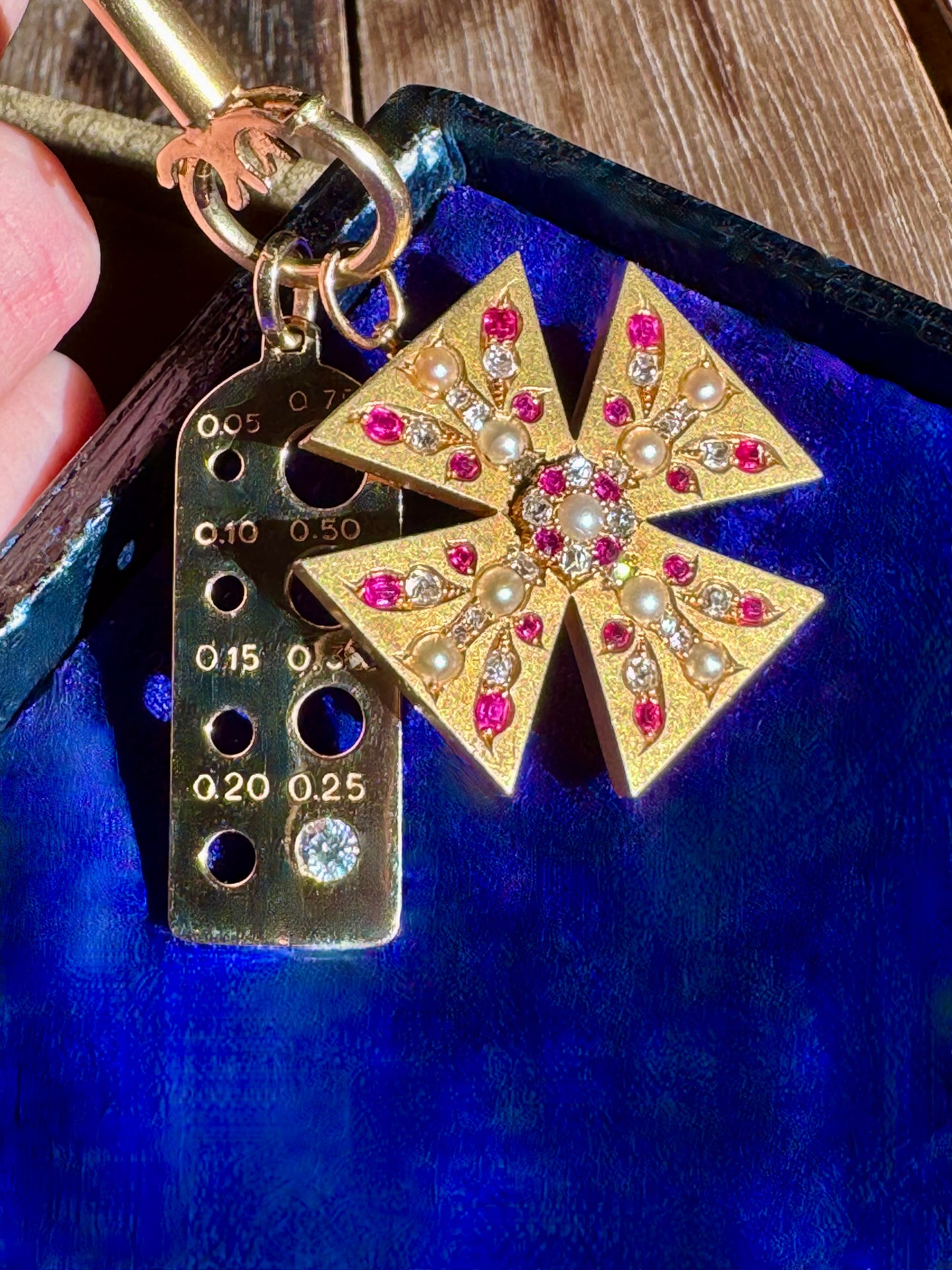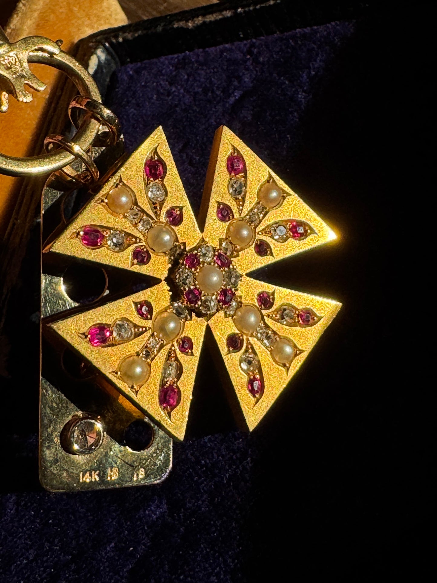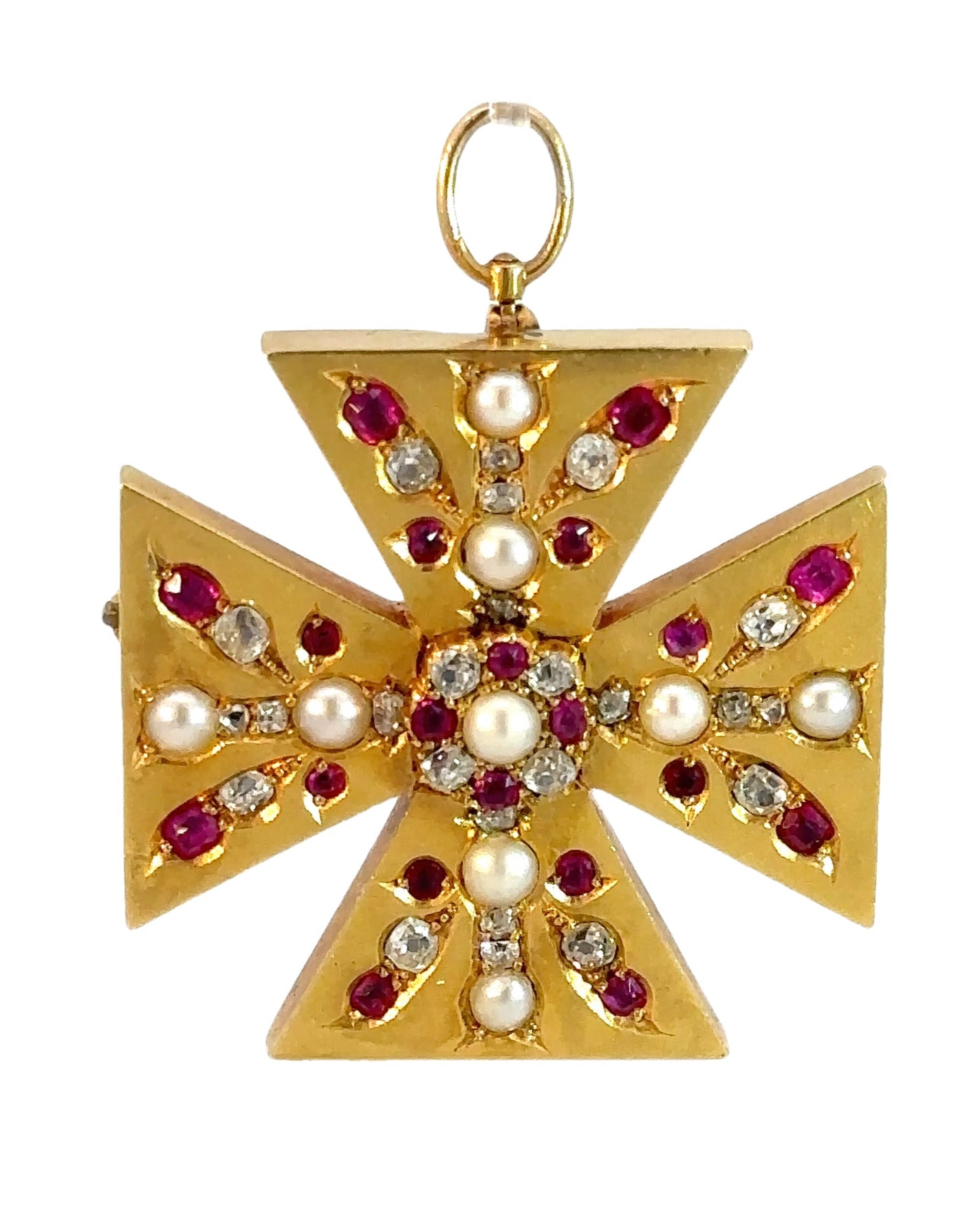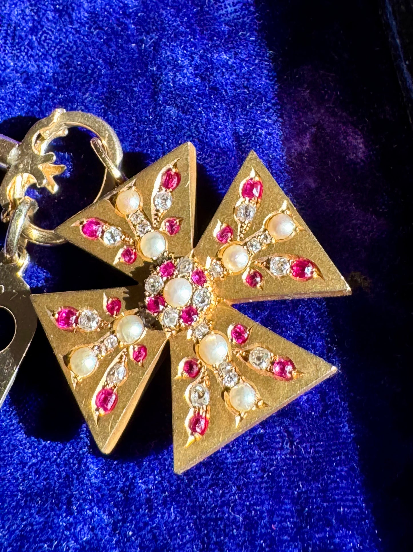 Victorian 15ct Gold, Ruby, Diamond and Pearl Maltese Cross Pendant