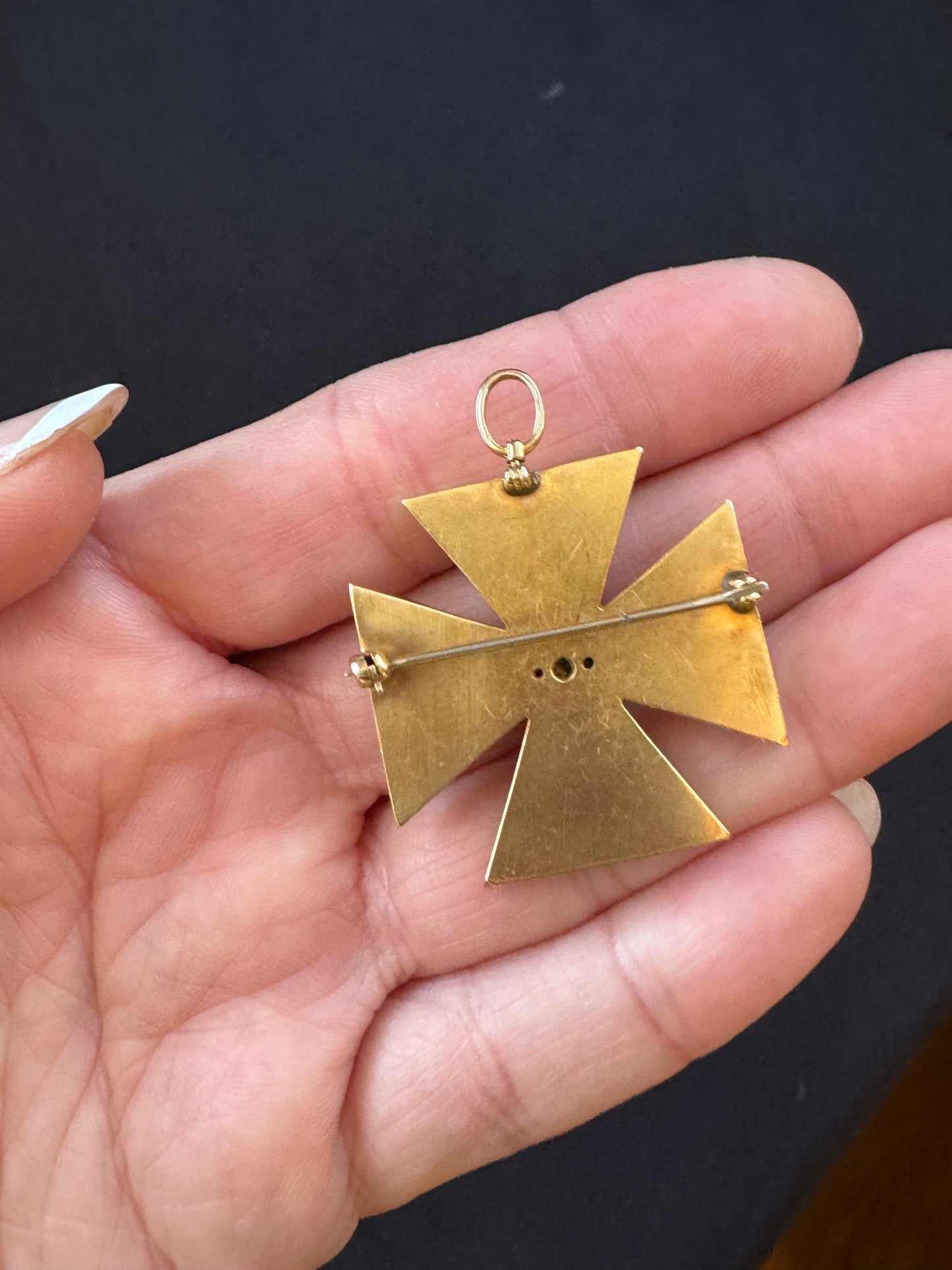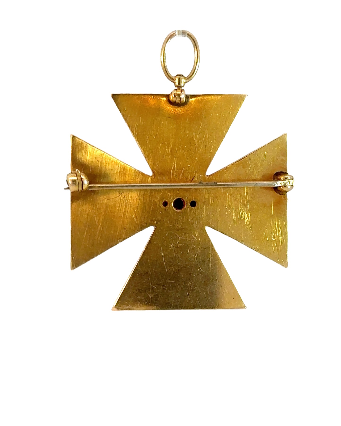 The Maltese cross is now associated with the fire service, but in Victorian times it was a popular symbol for women's jewelry. The cross measures 32 x 32 x 4 mm, and has both a pin and a flip-down swivel rotating bail to be worn a variety of ways. This is an exemplary piece in fantastic condition.