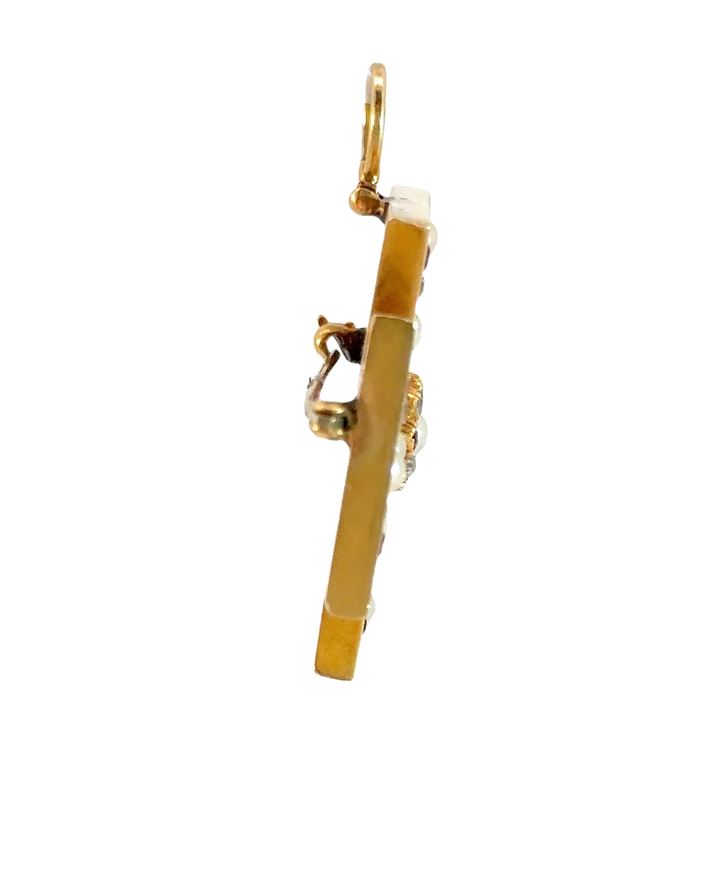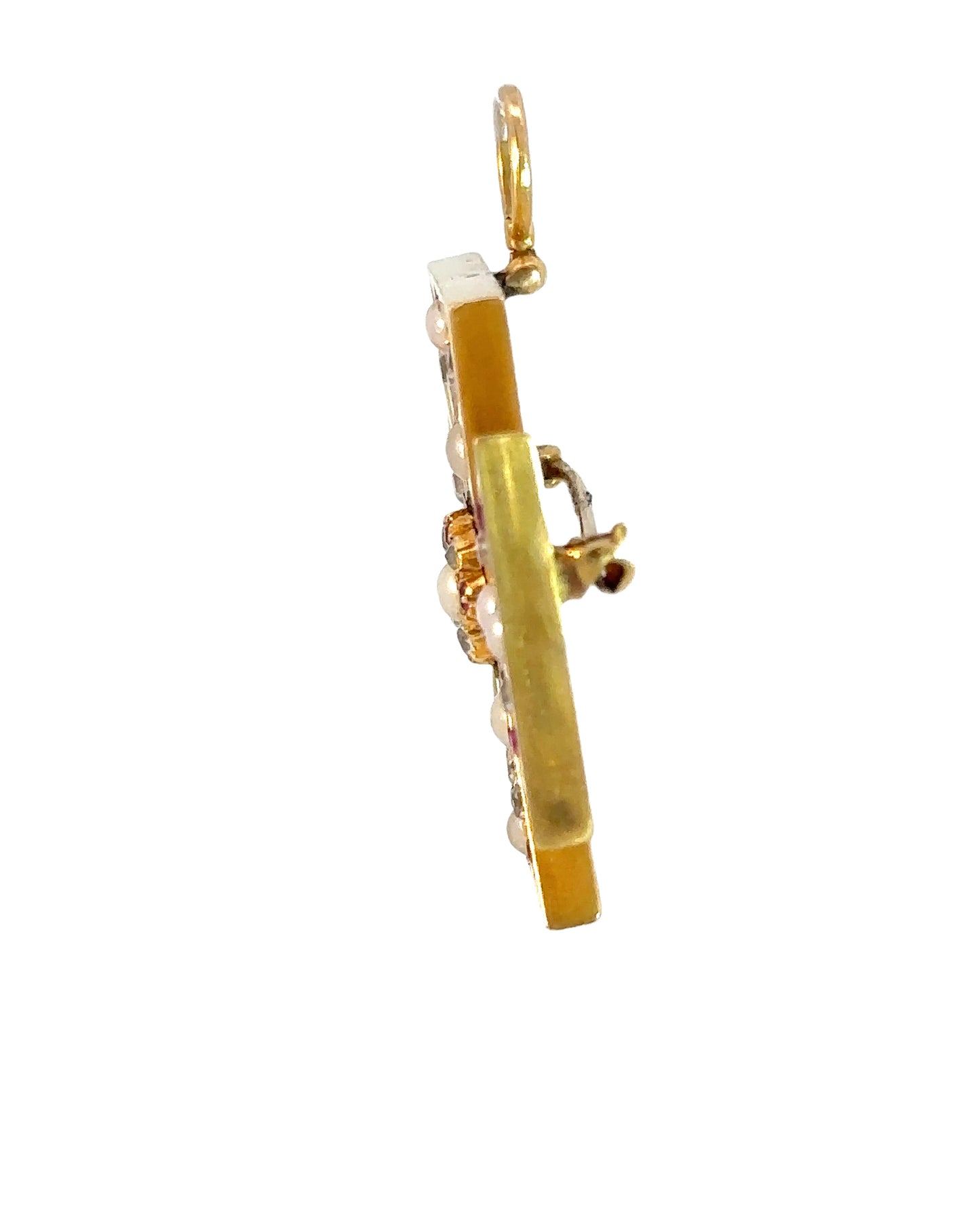 A versatile piece that functions as both a pendant and a brooch, this Victorian period cross is studded all over with an estimated .5 carat of rose cut diamonds, as well as 20 small rubies and nine pearls. The body of the cross consists of 14.3 grams of solid 15ct yellow gold, and the gems are set in symmetrical patterns along the arms of the cross that resemble butterflies.