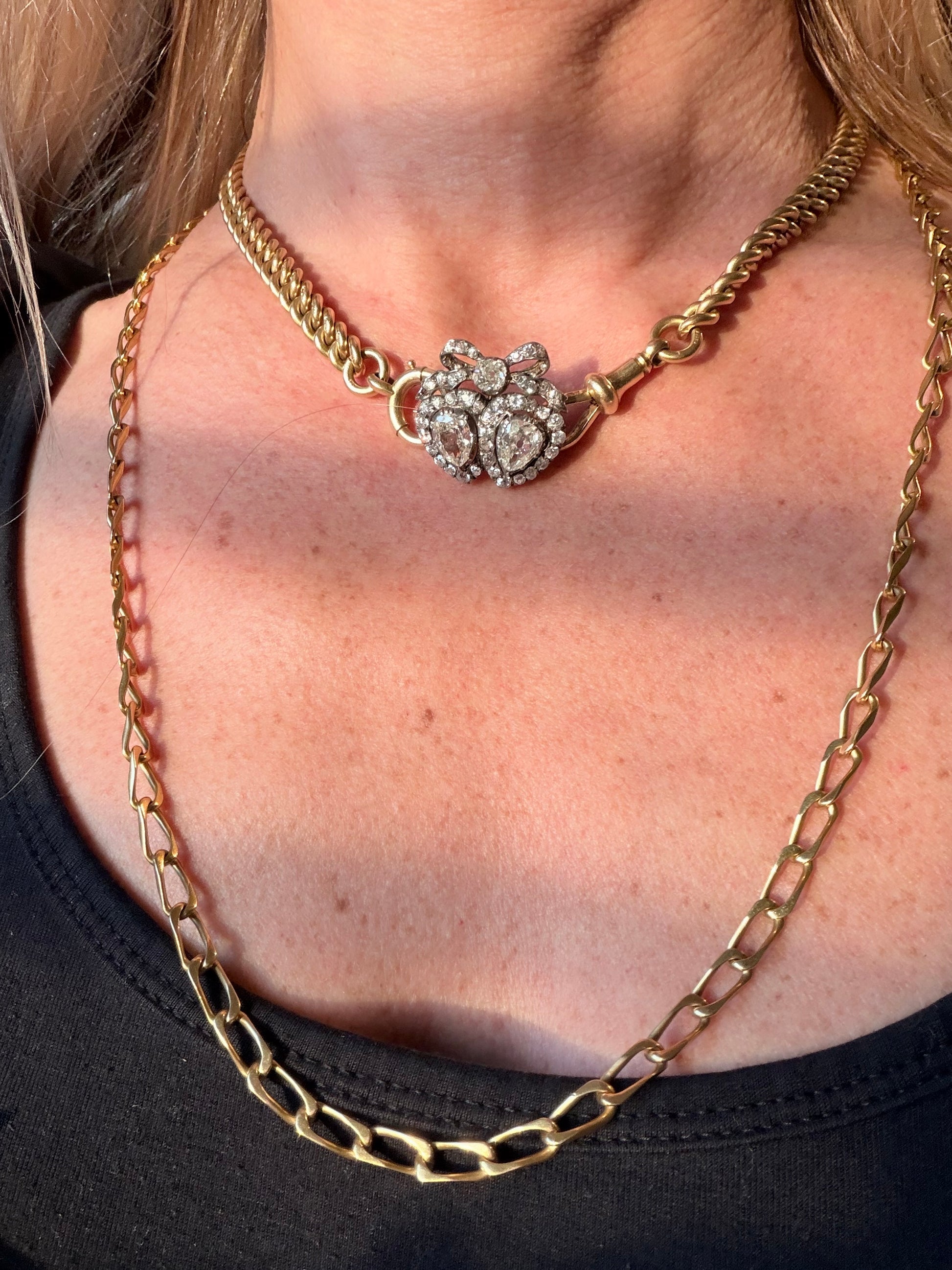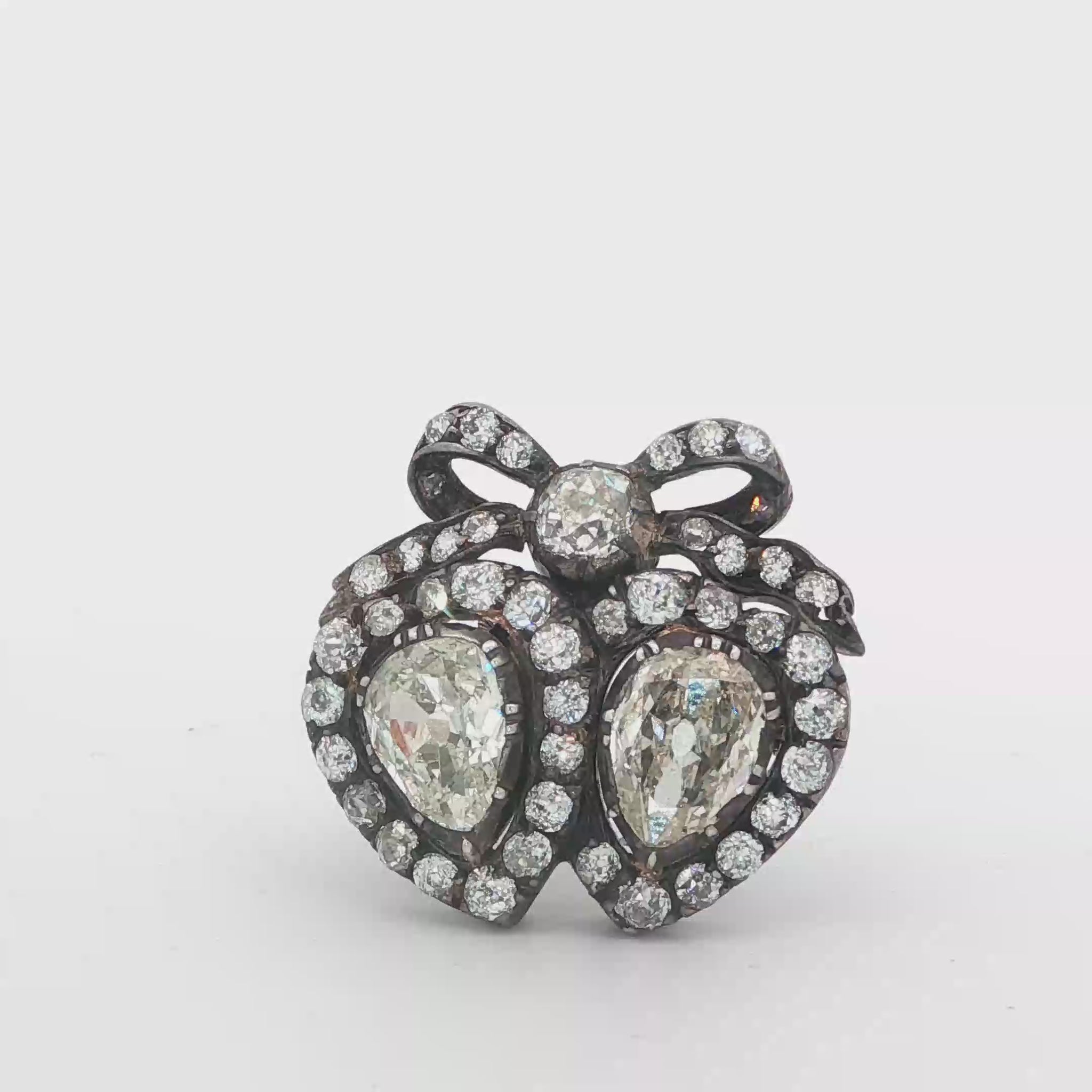 Set with pear-shaped diamonds weighing approximately 1.0 carat each, J - K color with VS - SI clarity, and accented by an additional roughly 2.0 carats of diamonds throughout. Sentimental without being sweet, and built with the craftsmanship only true Victorian pieces carry. A rare, all original and meaningful brooch that wears its history proudly.