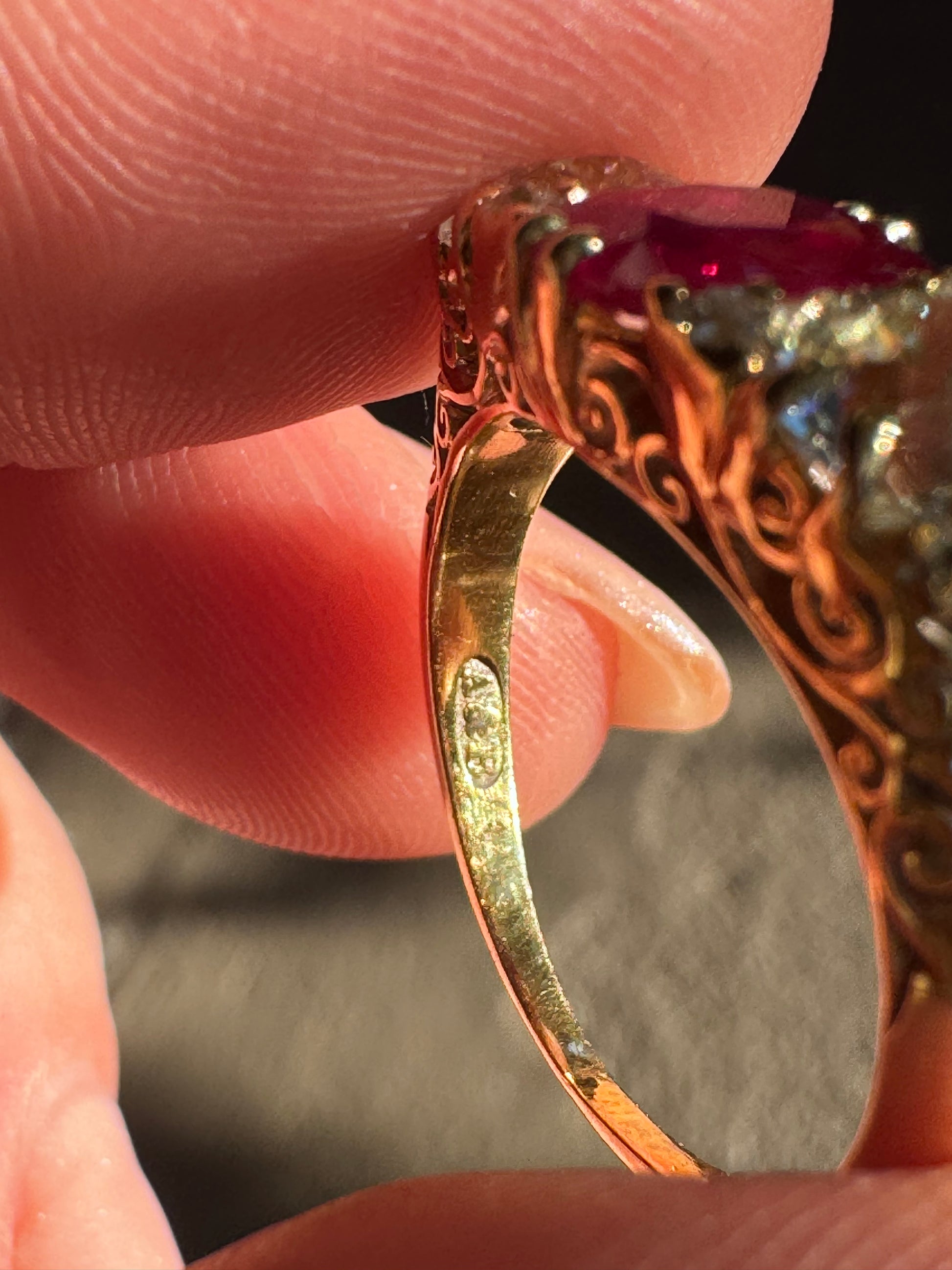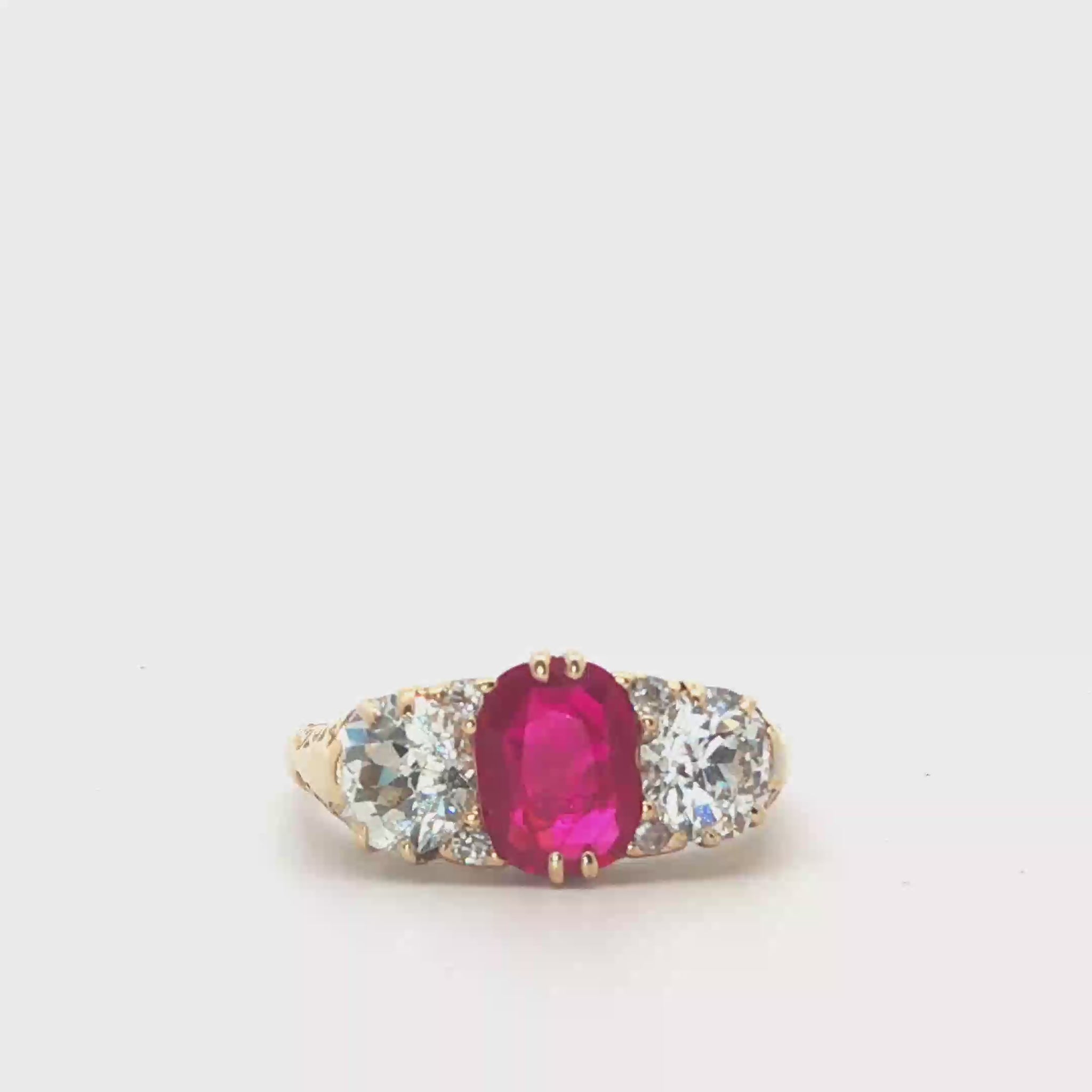 Crafted in rich 18k gold, this Victorian three-stone ring balances color and sparkle beautifully. At the center sits an approximately 1.60 ct Burmese ruby, no heat, prized for its natural color and depth. Flanking the ruby are old cut diamonds totaling approximately 1.85 carats, with H color and VS clarity, offering that soft, lively sparkle antique stones are known for.