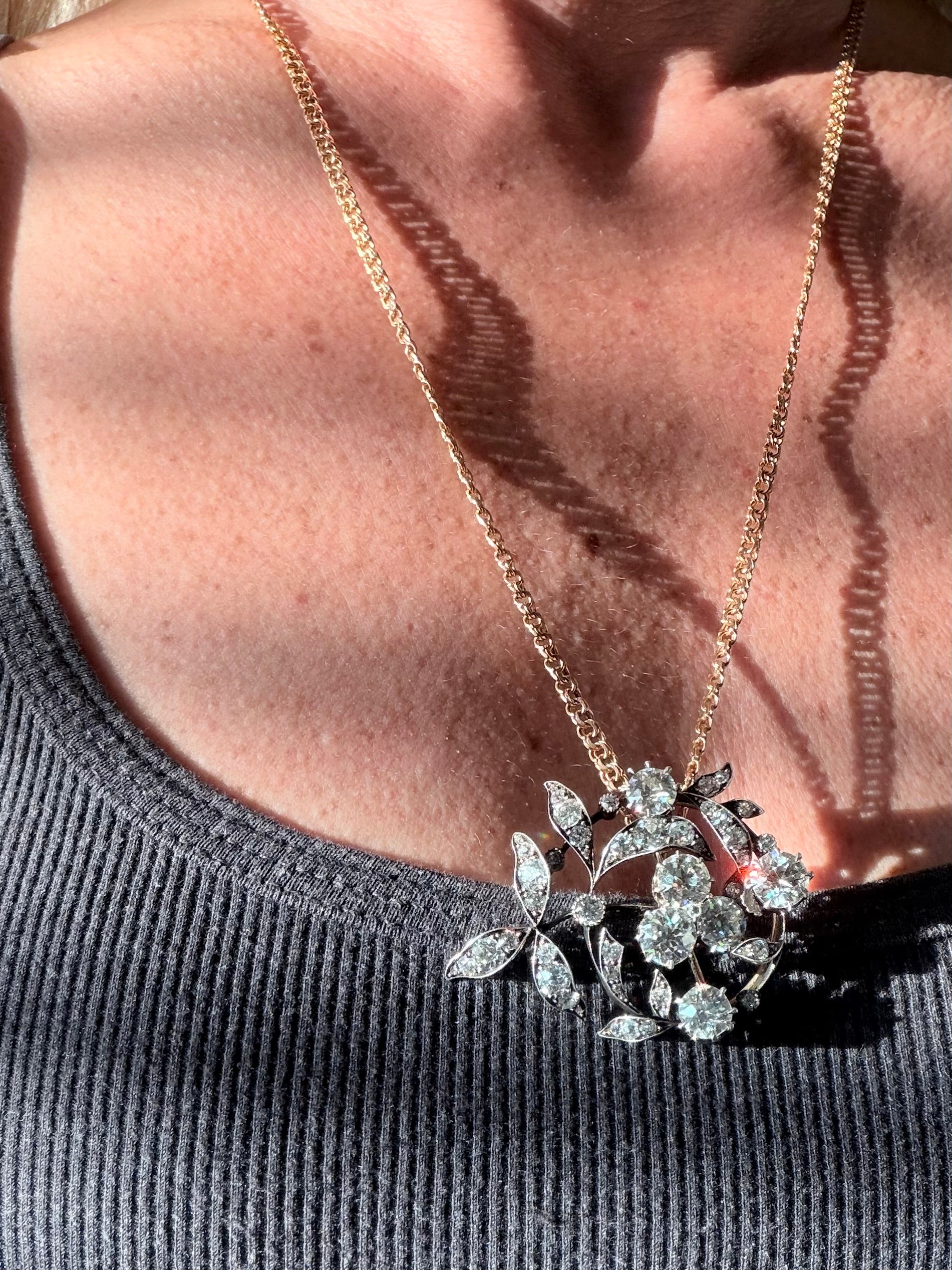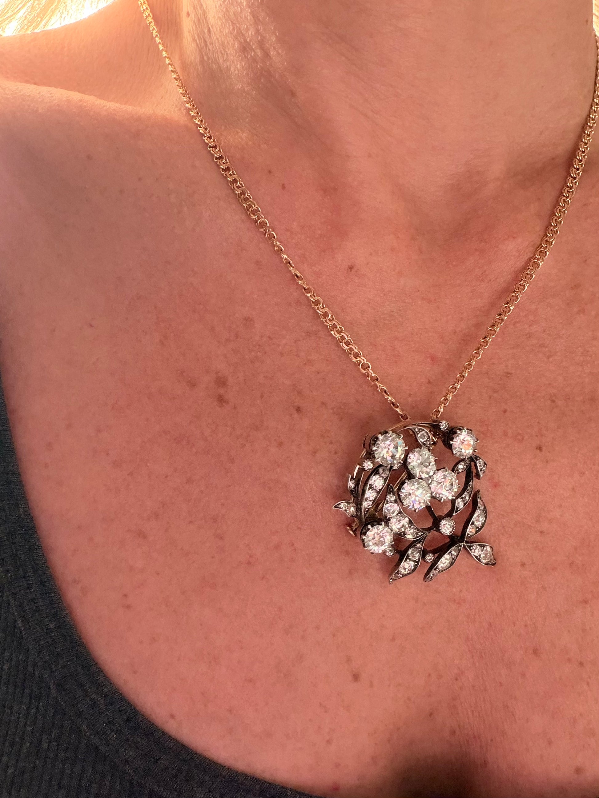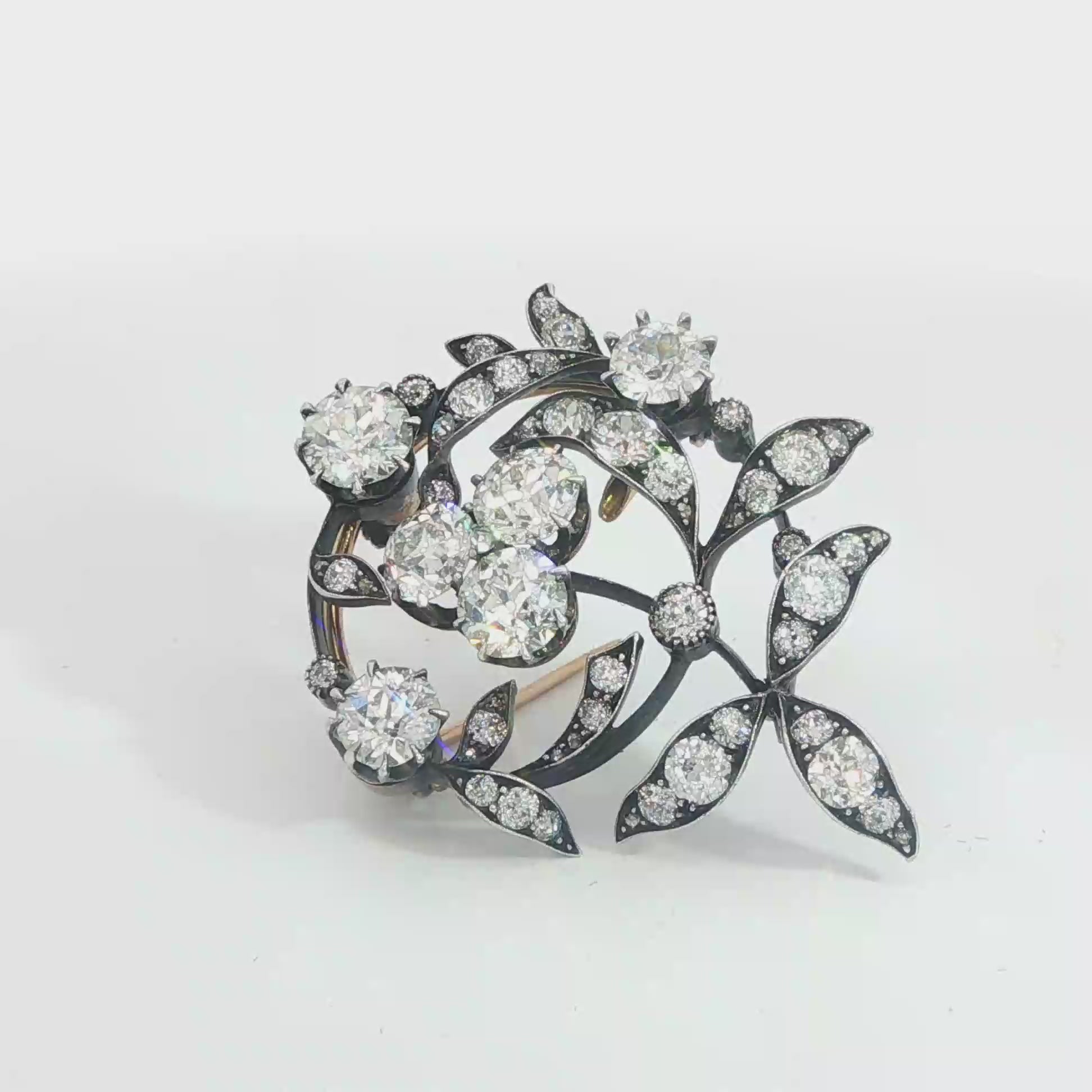 Measuring approximately 43 Ć 31 mm, the clover form is set with an exceptional arrangement of old European cut diamonds totaling approximately 7.0 carats. Three stones measure approximately 1.0 carat each, joined by one approximately 0.90 carat diamond and two approximately 0.80 carat diamonds. The diamonds grade approximately GāI in color and VS in clarity, offering remarkable brightness and cohesion for a piece of this age.