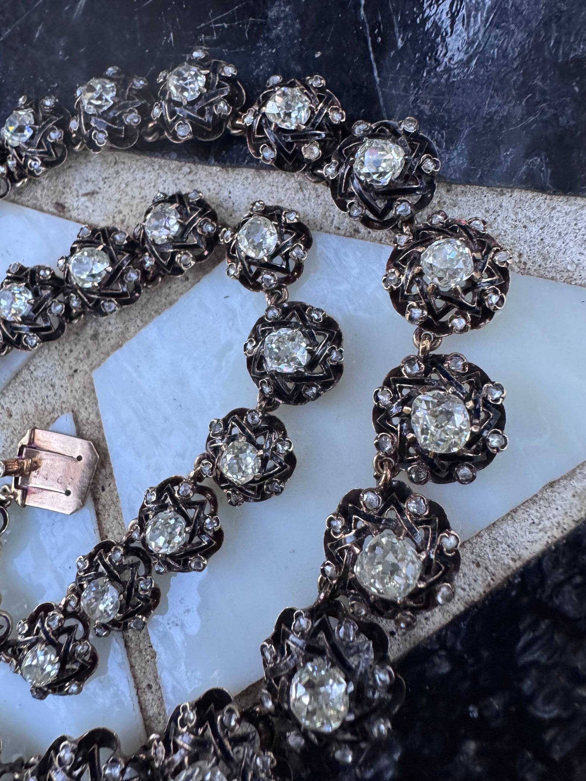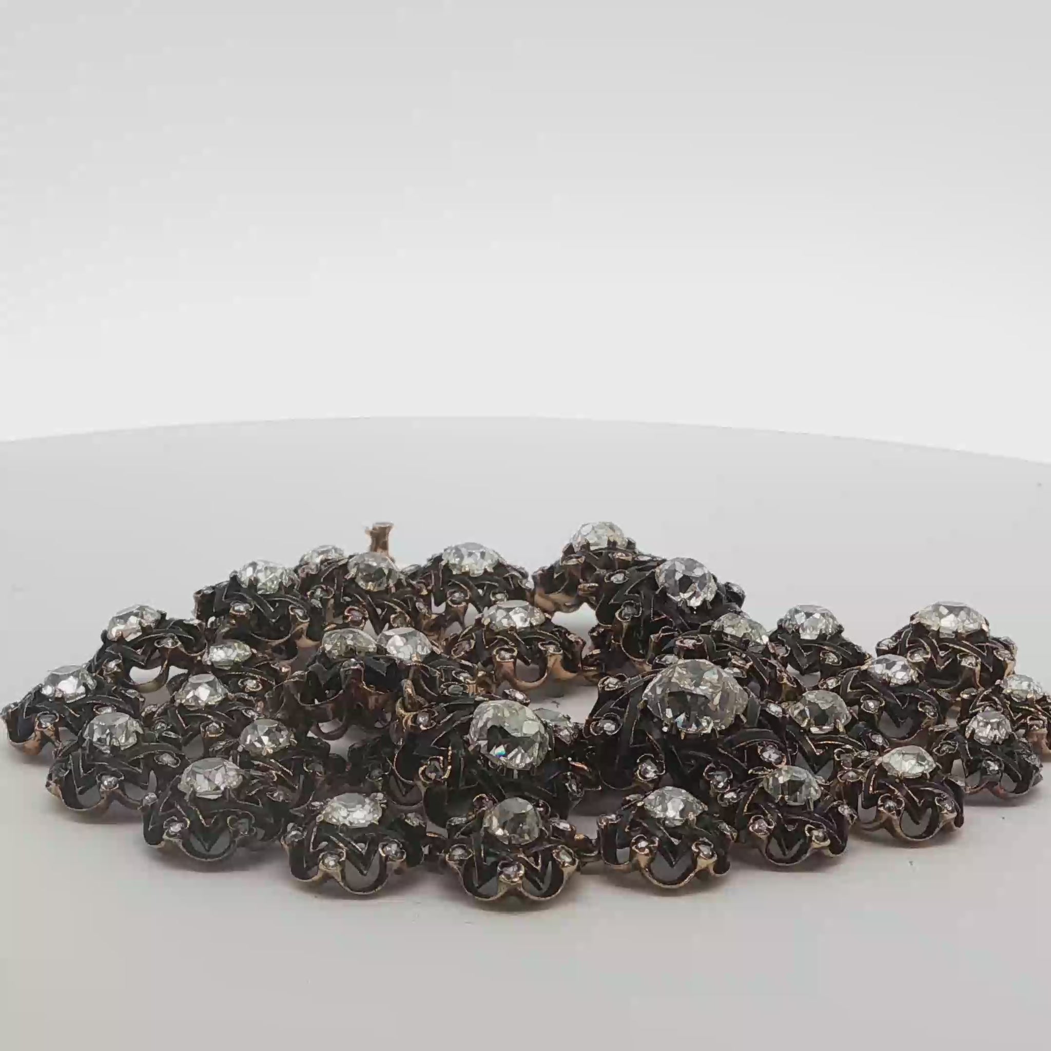 Victorian decadence at its finest. This enamel and diamond necklace, crafted in rich 18k gold and weighing 48.9 grams, drapes the neck with 19th-century glamour. Approximately 17 carats of old mine cut diamonds shimmer throughout, graded H–K with VVS–SI clarity, each stone catching light with that deep antique fire. The largest diamond, around 1.7ct, anchors the piece with quiet power.
