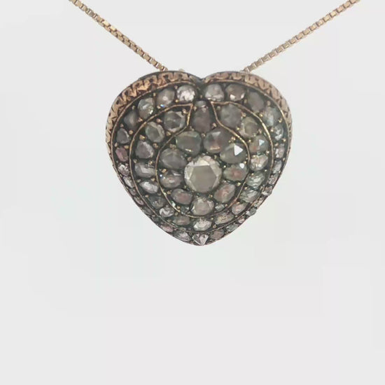 Victorian sentiment distilled into gold and diamond. This rose cut diamond heart is crafted in rich 15k yellow gold and silver, and weighs a substantial 10.8 grams, offering the reassuring weight and warmth characteristic of mid-Victorian jewelry. Measuring approximately 25 × 23 mm, it is set with an estimated 2 carats total weight of rose cut diamonds, their soft, domed facets producing a gentle, candlelit glow rather than modern brilliance.