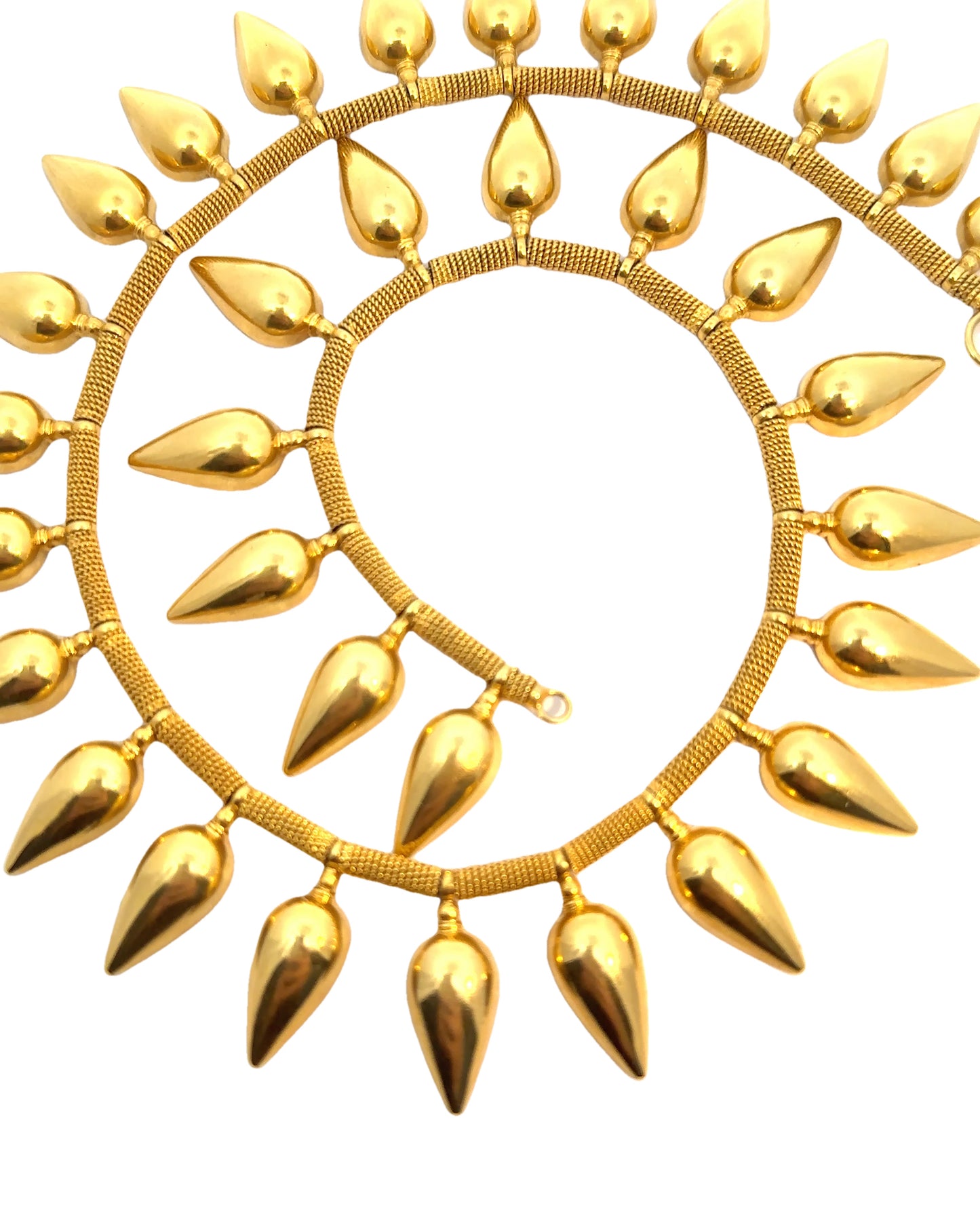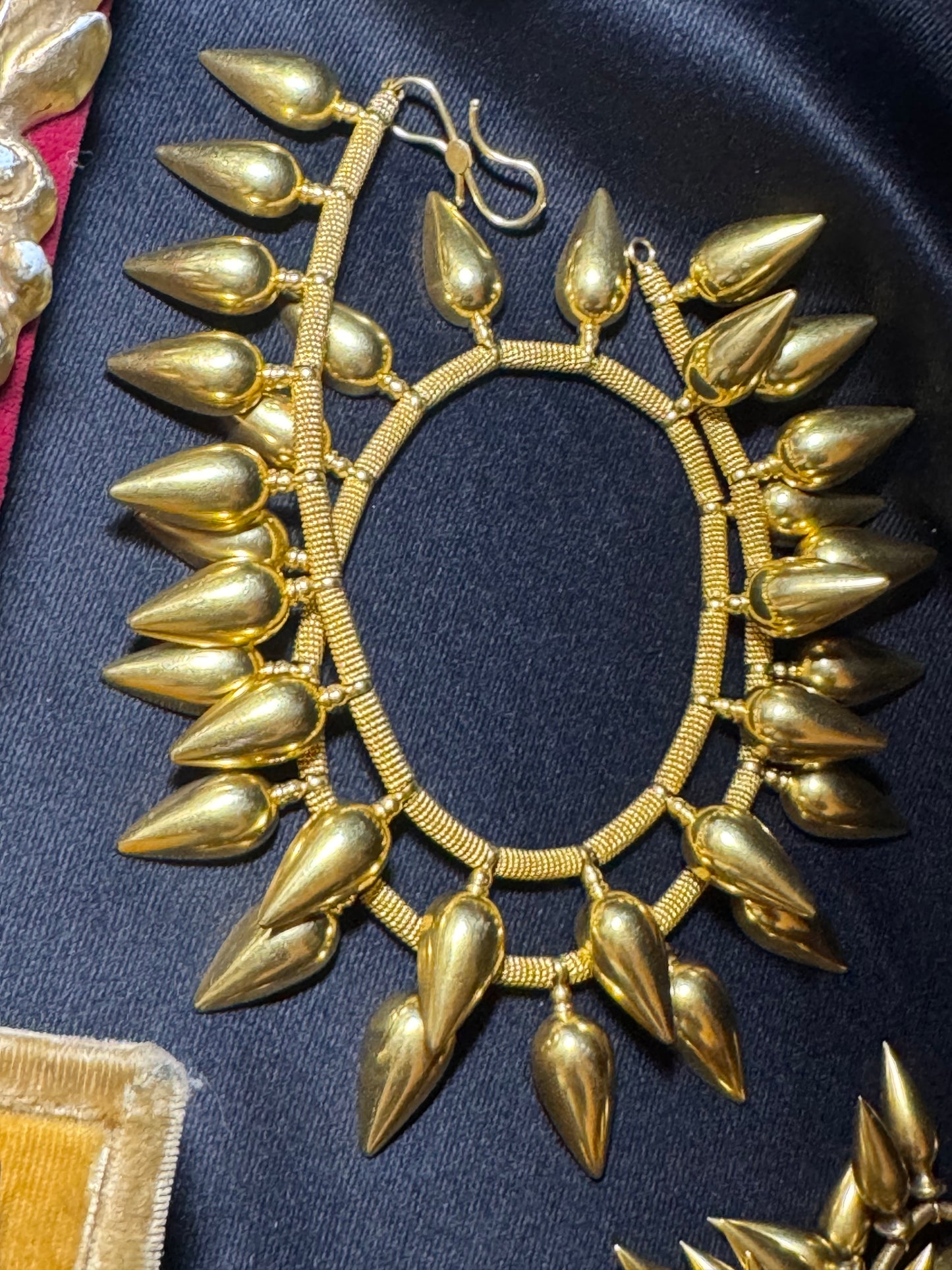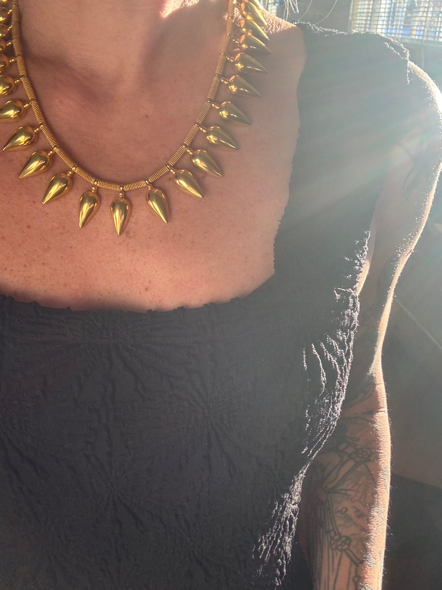 This one has me feeling kinda awesome and glam, but also the usual FA&FO. This necklace features tight spun flexible 3.66 mm links alternating with perfect 24 mm spikes. The tone and texture of the two links styles creates a pattern that pops even more, because of the 15ct gold with 22ct moody bloomed finish. She measures 17.75” closed and is hefty for this style at 73.3 grams.