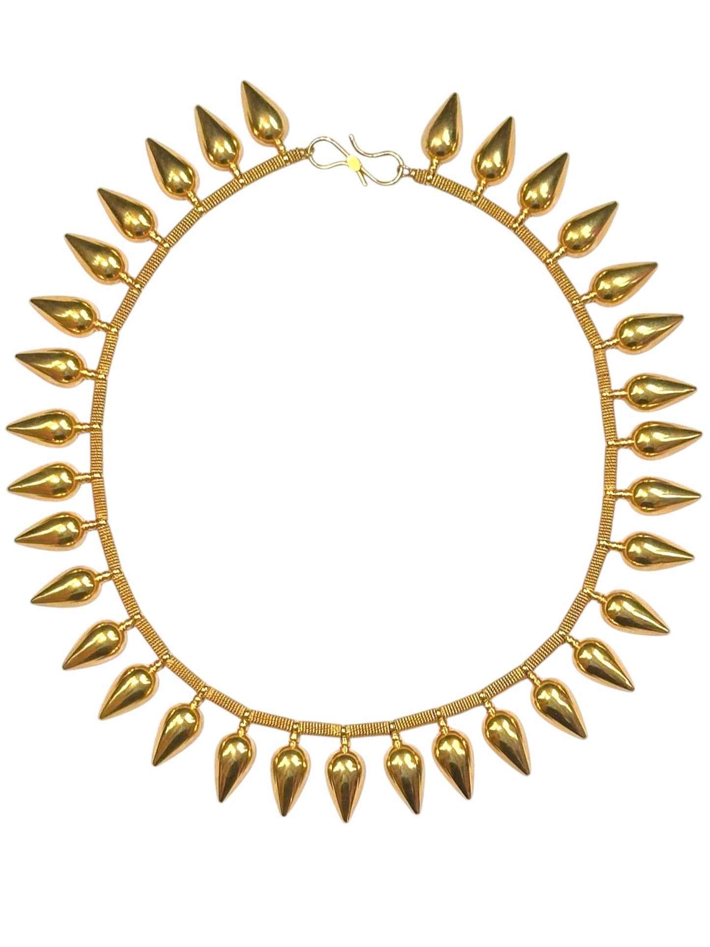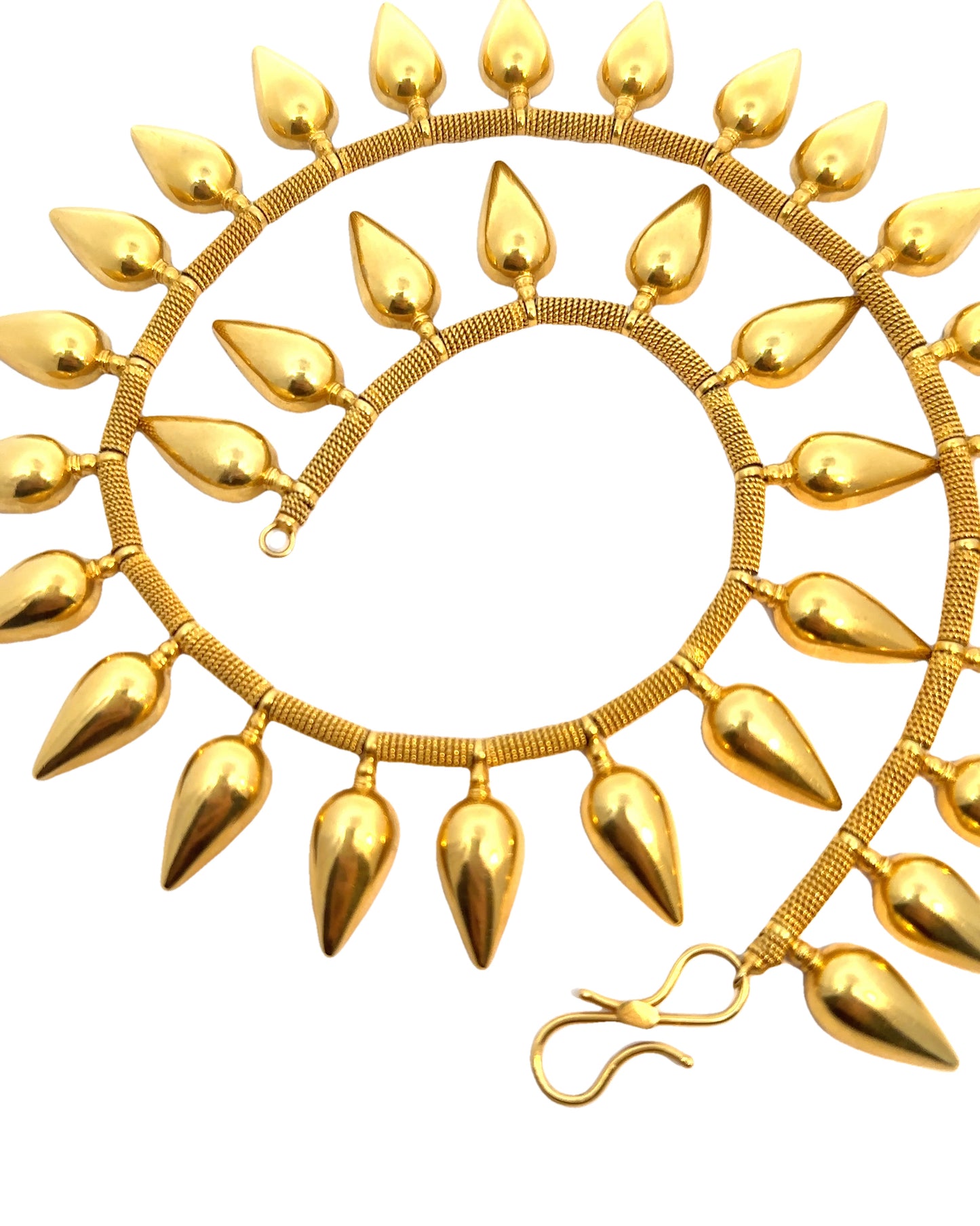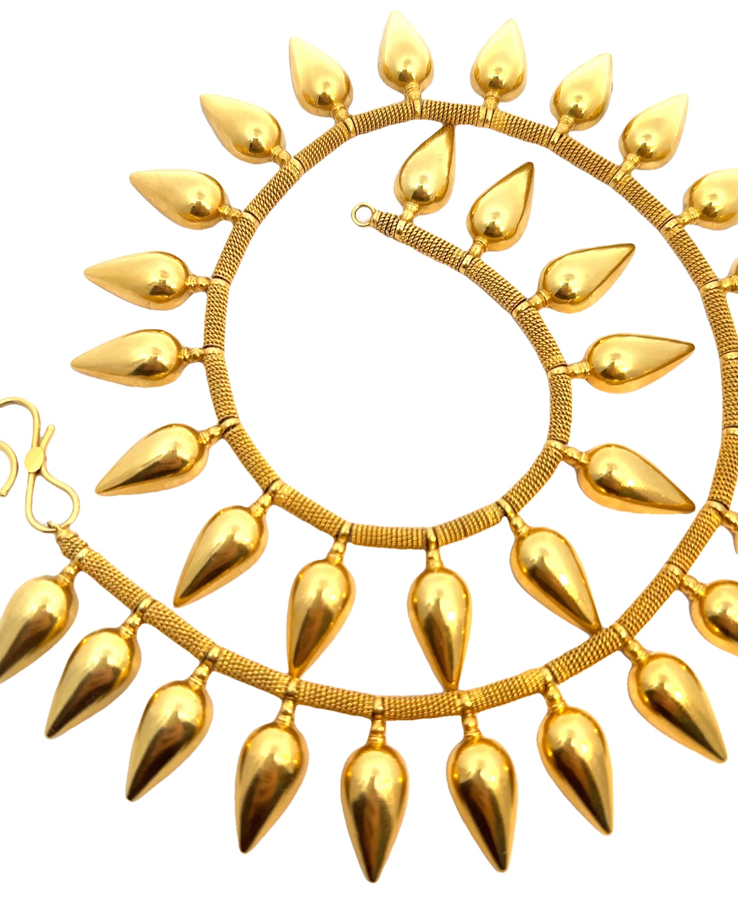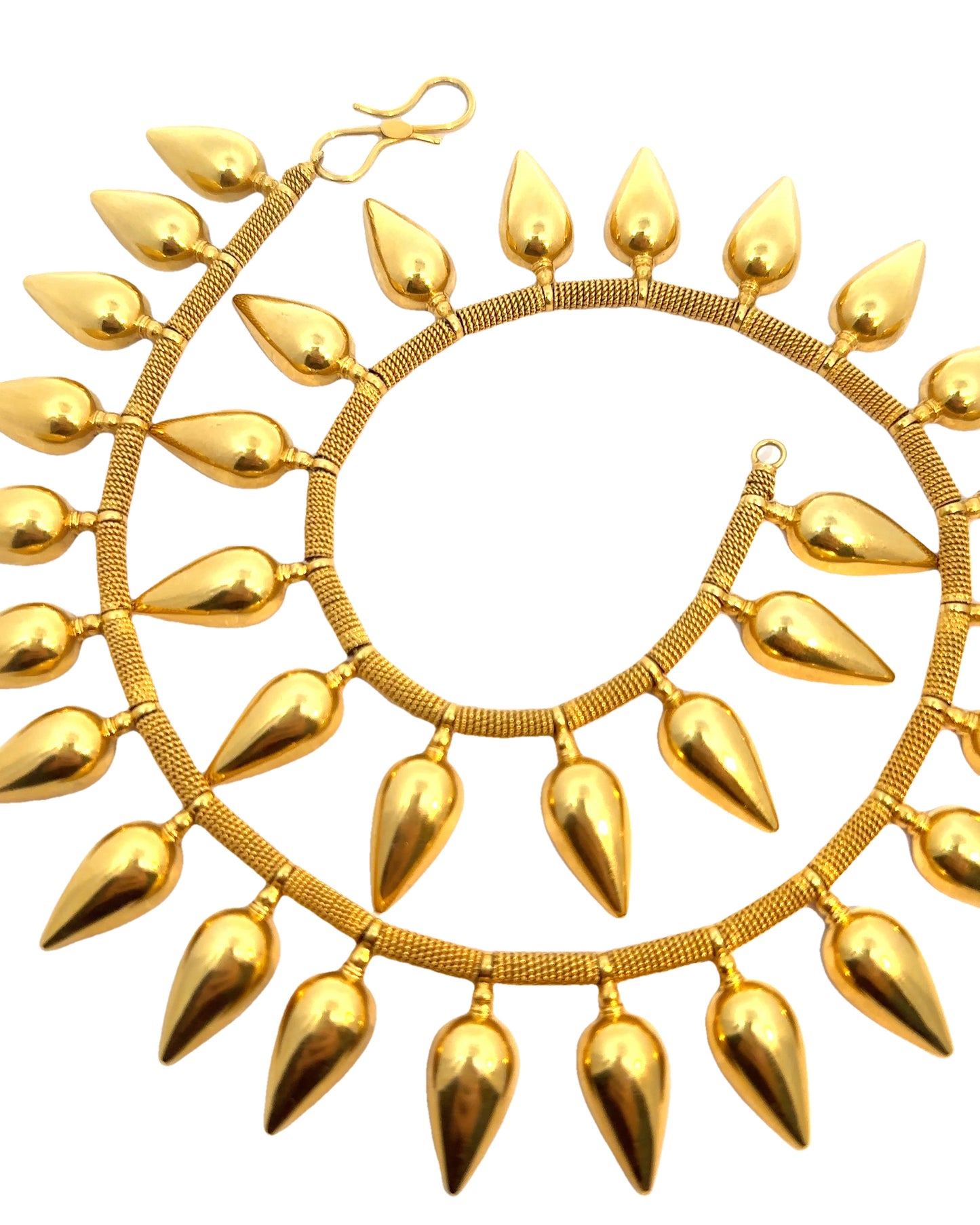 This one has me feeling kinda awesome and glam, but also the usual FA&FO. This necklace features tight spun flexible 3.66 mm links alternating with perfect 24 mm spikes. The tone and texture of the two links styles creates a pattern that pops even more, because of the 15ct gold with 22ct moody bloomed finish. She measures 17.75” closed and is hefty for this style at 73.3 grams.