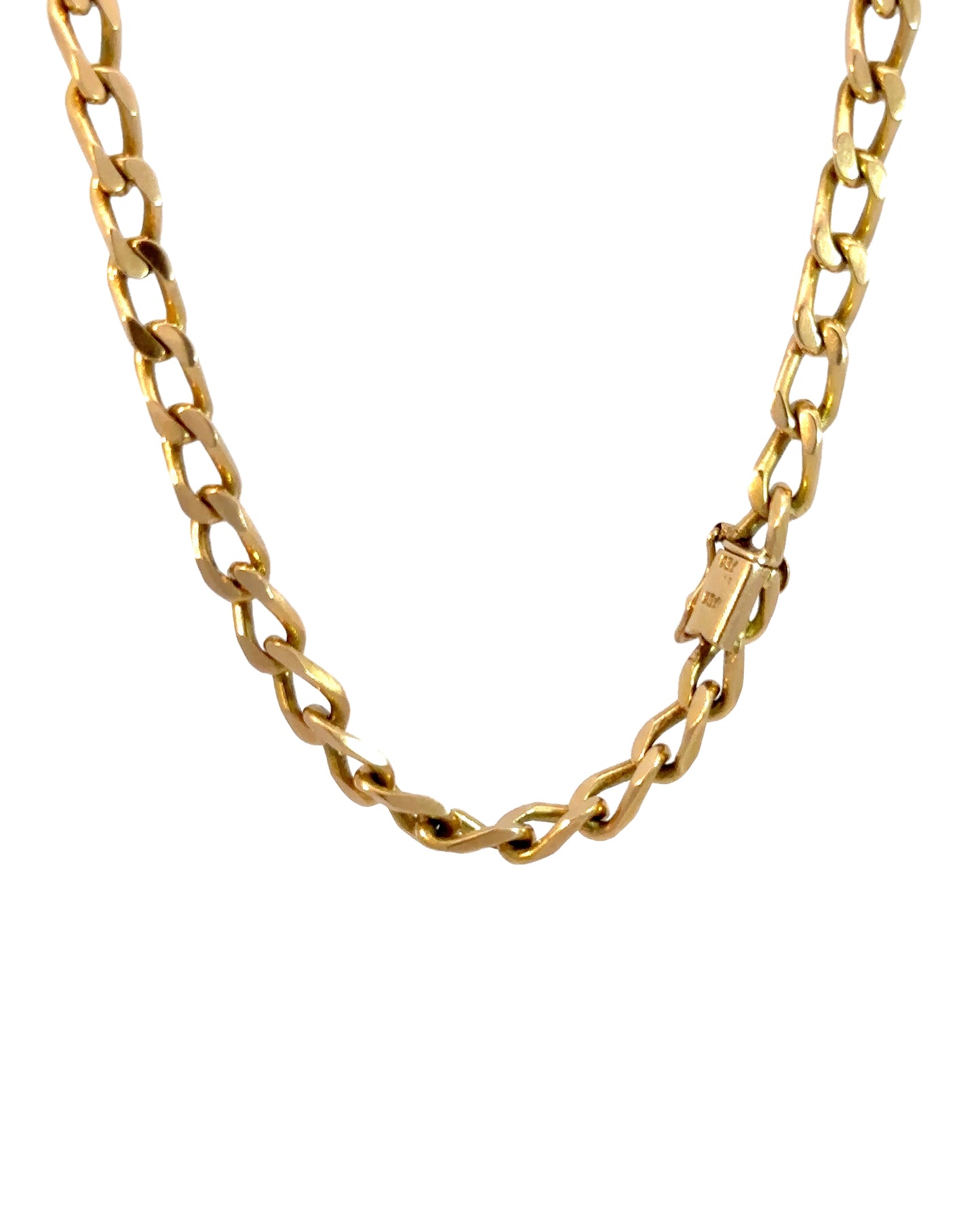 A solid and super heavy open curb chain! The extended curb links measure 5.4 mm, the entire chain is 16.5" long, and the total gold weight is 47.6 grams. A really good solid curb with the prettiest gold color. Stamped "750" for 18k gold.