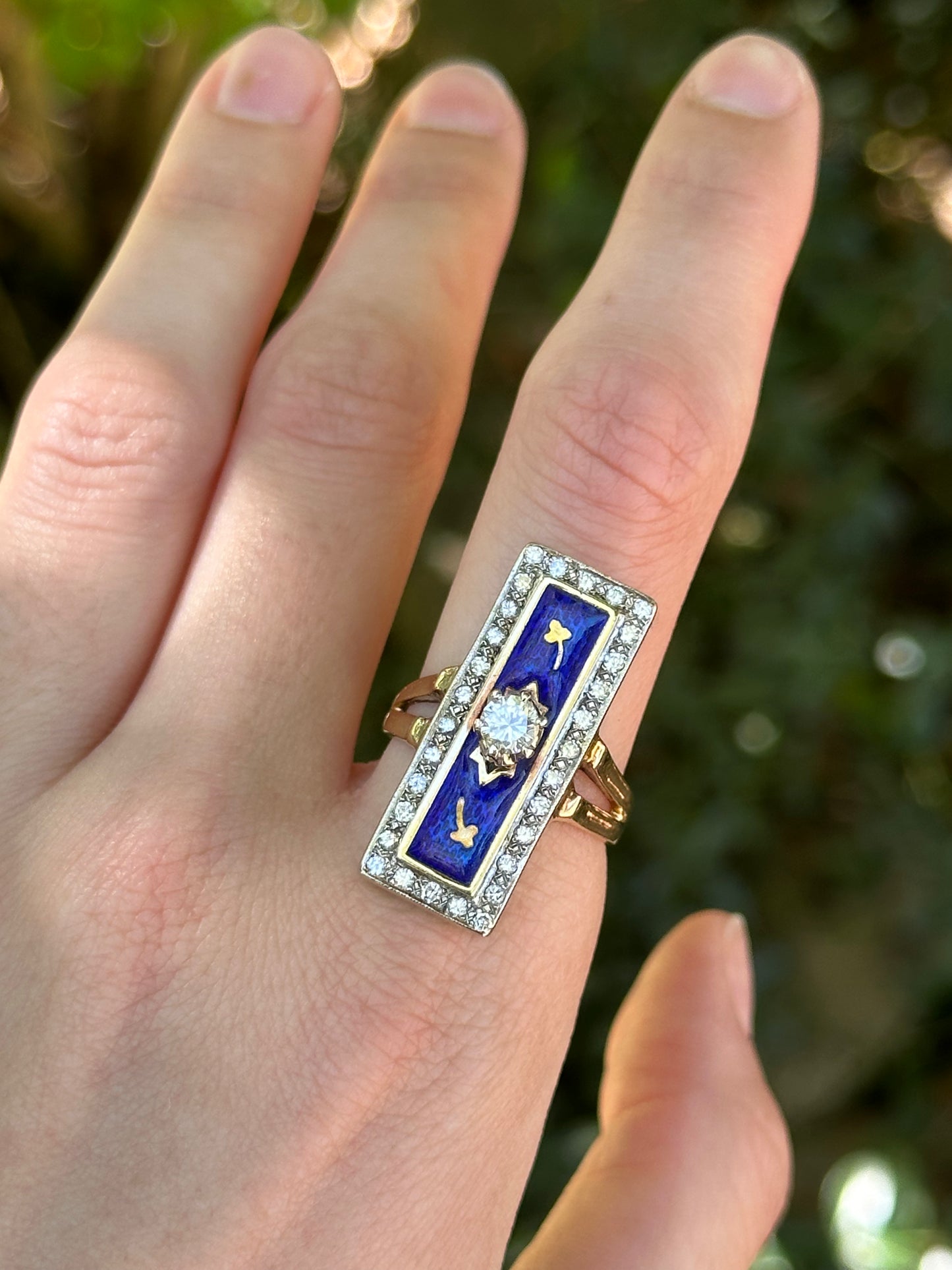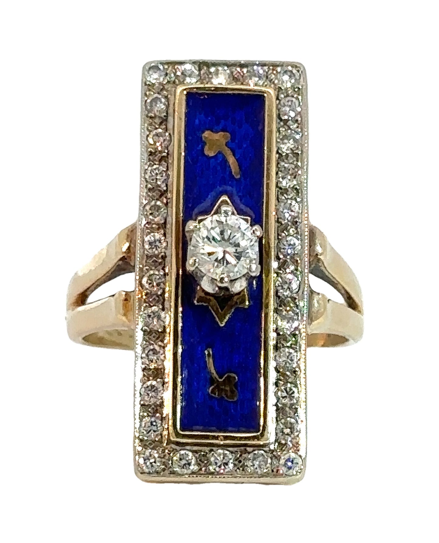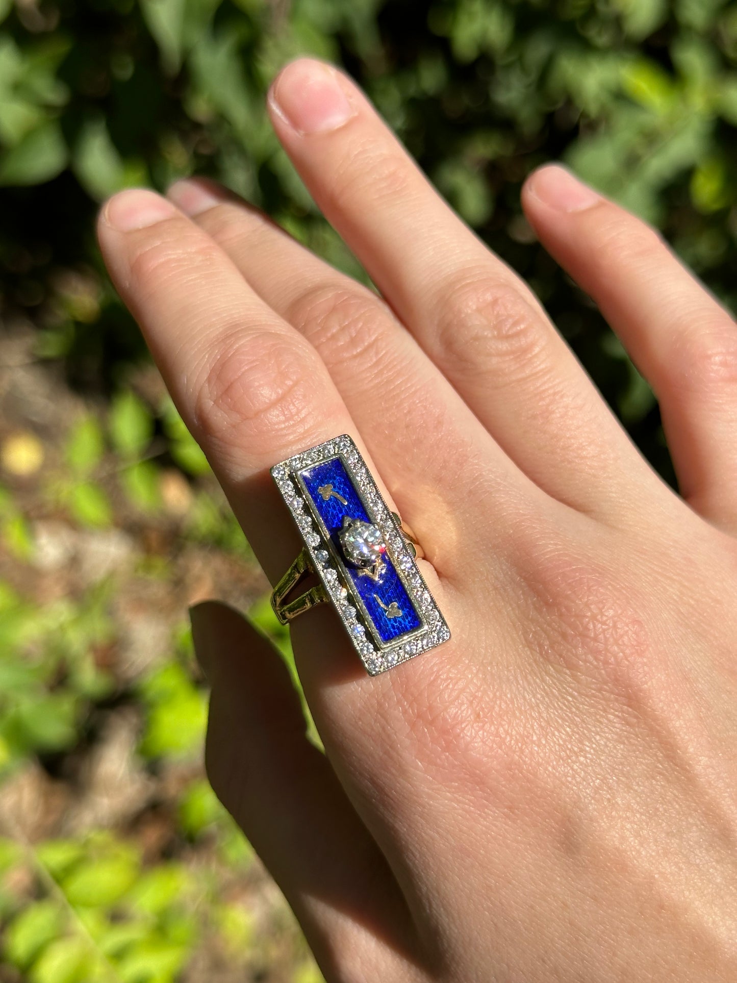 This beautiful 14k gold ring features a fabulous, large translucent blue glass enamel plaque with gold details, a diamond halo, and a diamond solitaire in the center. The bright blue of the enamel, the sparkly white of the diamonds, and the yellow gold all contrast each other beautifully. The outer halo consists of 30 diamonds, and the larger solitaire sits high off the finger in a 6 prong setting. This is a truly regal knuckle duster measuring 30 x 12 mm. This ring is a sizable 10.