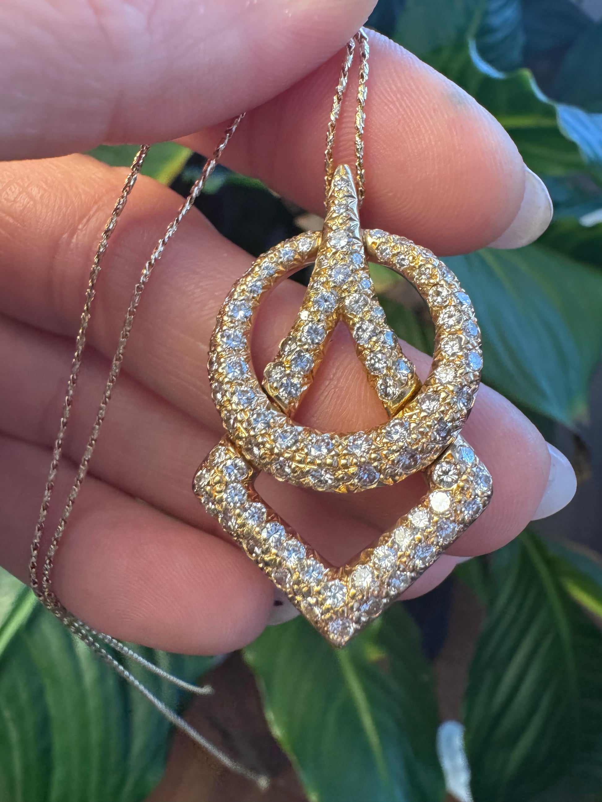 Estate 14k gold statement piece with clean lines, crisp edges, and a full hit of diamond sparkle. The 36 × 22 mm drop hangs from an 18 inch chain that gives it that perfect bling geometric statement.