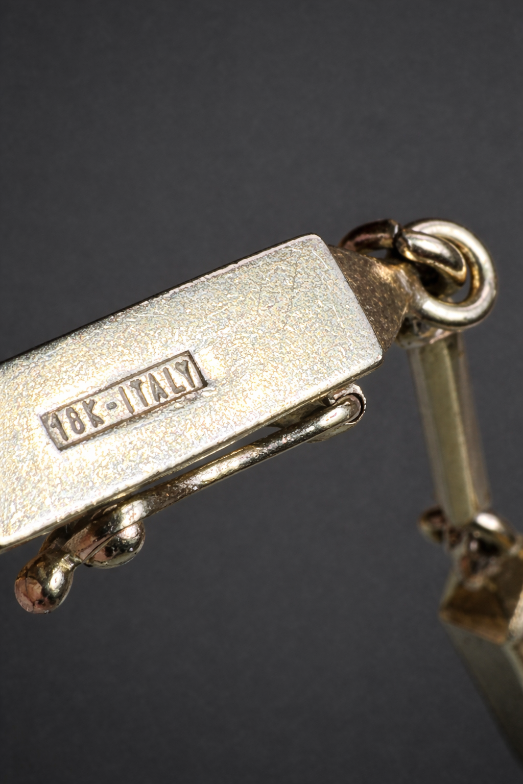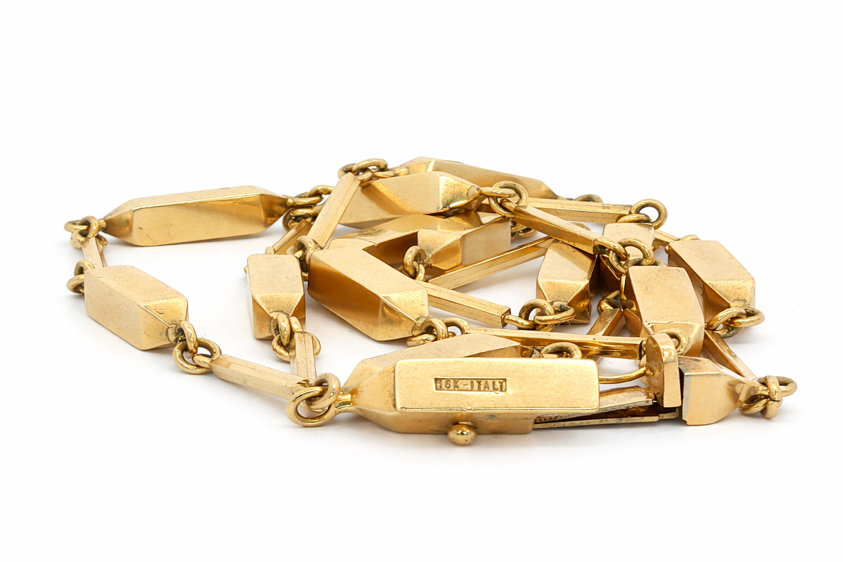 Vintage geometric spike necklace in 18k yellow gold, weighing 88.9 grams. Measuring 27.25 inches in length with links graduating from about 4.3 to 2.5 mm wide. Stamped “18k” and “Italy”. Finished with an endless clasp and figure 8 safety.