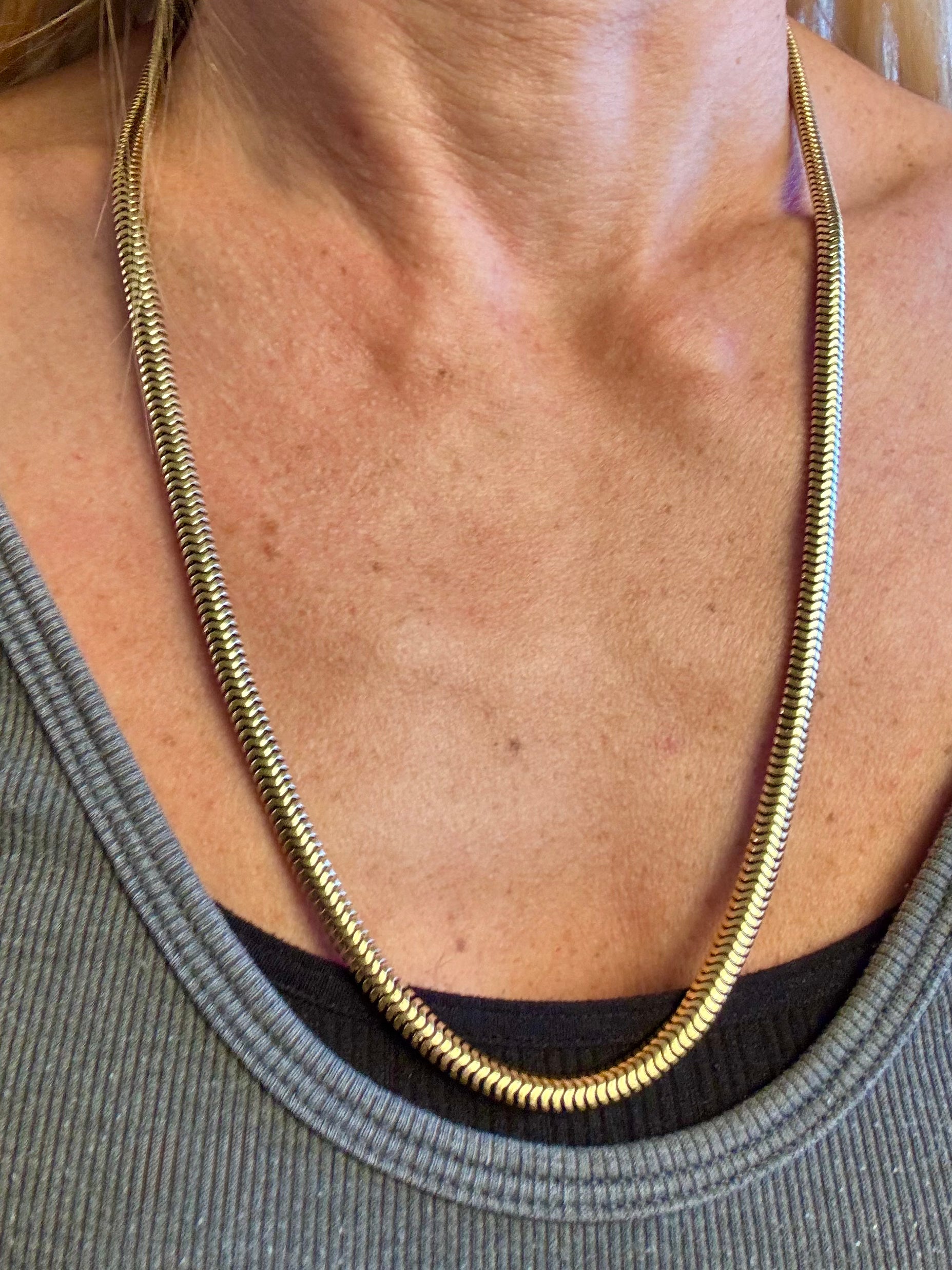 This vintage snake chain has that perfect estate jewelry charm, rich, smooth, and beautifully weighty in all the right places. Crafted in solid 14kt. yellow gold, it comes in at a gorgeous 43.8 grams, so you really feel the quality the moment you pick it up.