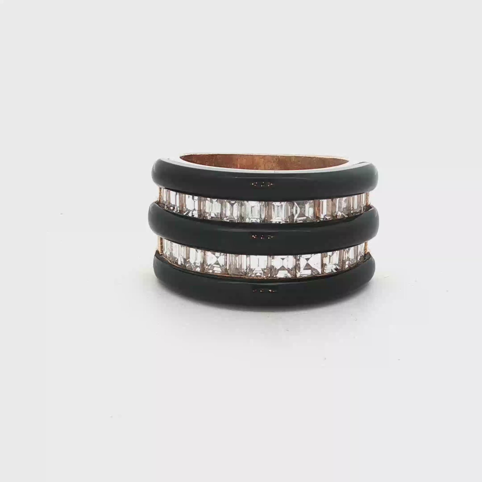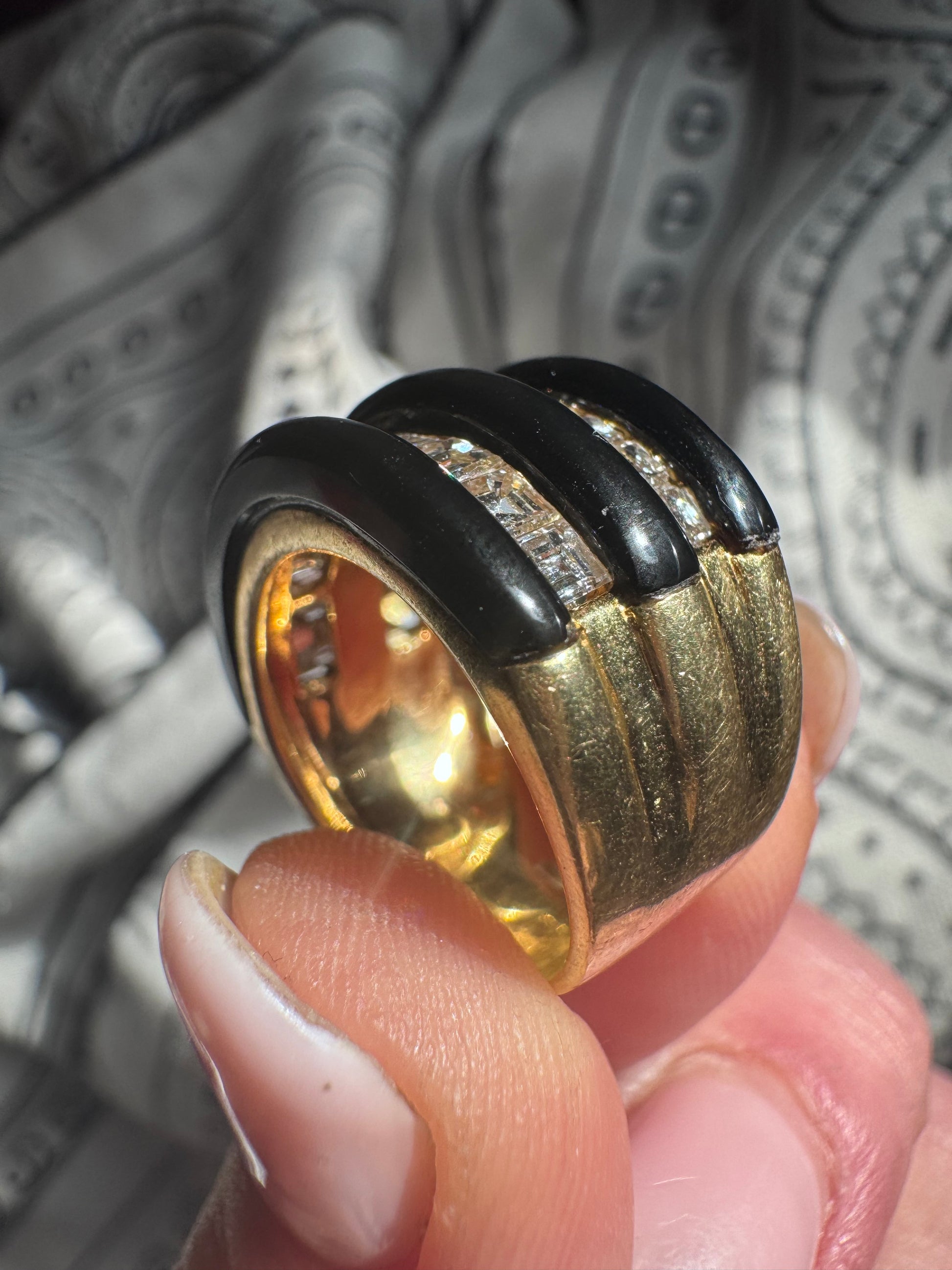 Vintage glamour in its sharpest form. Crafted in 18k gold and weighing 13 grams, this wide band ring pairs glossy black onyx with the clean geometry of carré-cut diamonds, giving it that unmistakable mid-century heft — bold, graphic, and beautifully balanced.