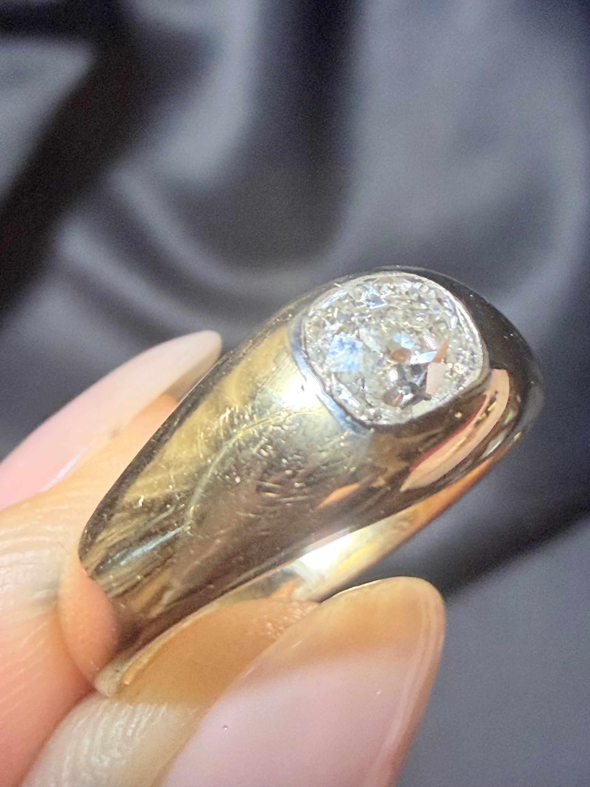 Vintage single stone diamond flush set ring in 18k gold, weighing 7.1 grams. Set with an approximately 0.65 carat diamond, H color, I1 clarity, with a beautiful cut that faces up far better than the grade suggests. The band tapers from 7.9 mm to 3.4 mm, giving strong presence with a balanced, wearable profile.