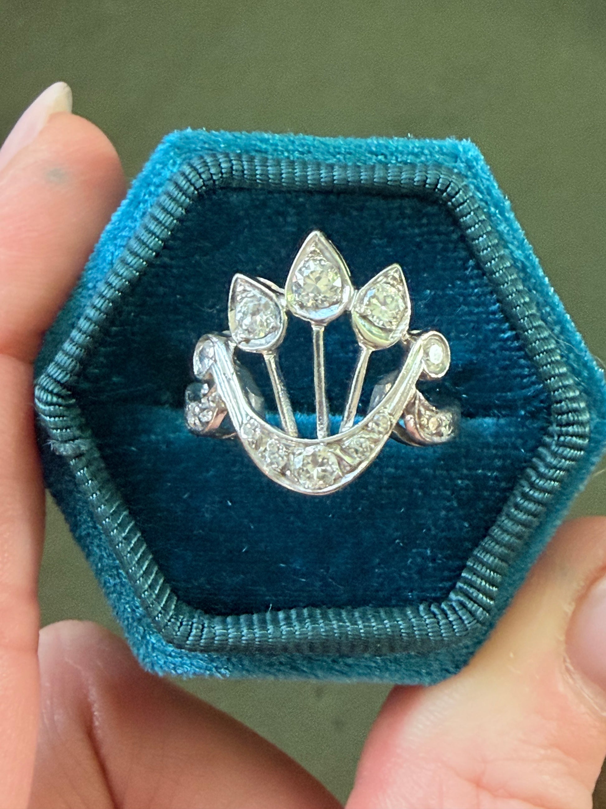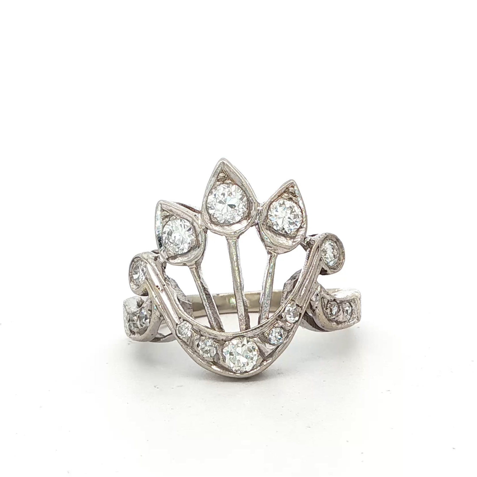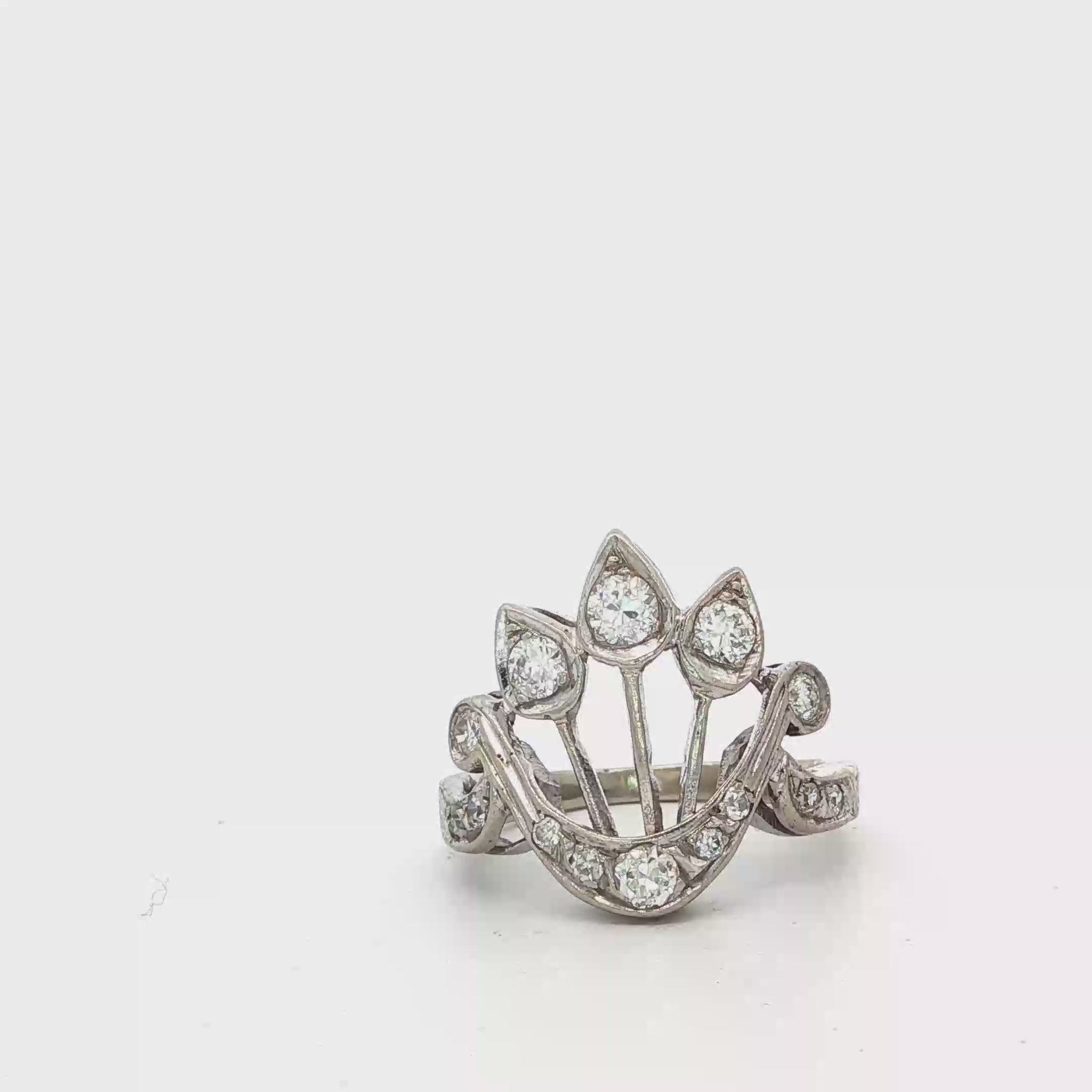 A vintage triple-arrow crown ring in 14k white gold —three arrows pointing forward, lifted by a crown of old-cut diamonds totaling approximately 1 carat. The top measures 18.7 x 19.7 mm. Sharp, symbolic, and full of quiet power. Sizable 7.