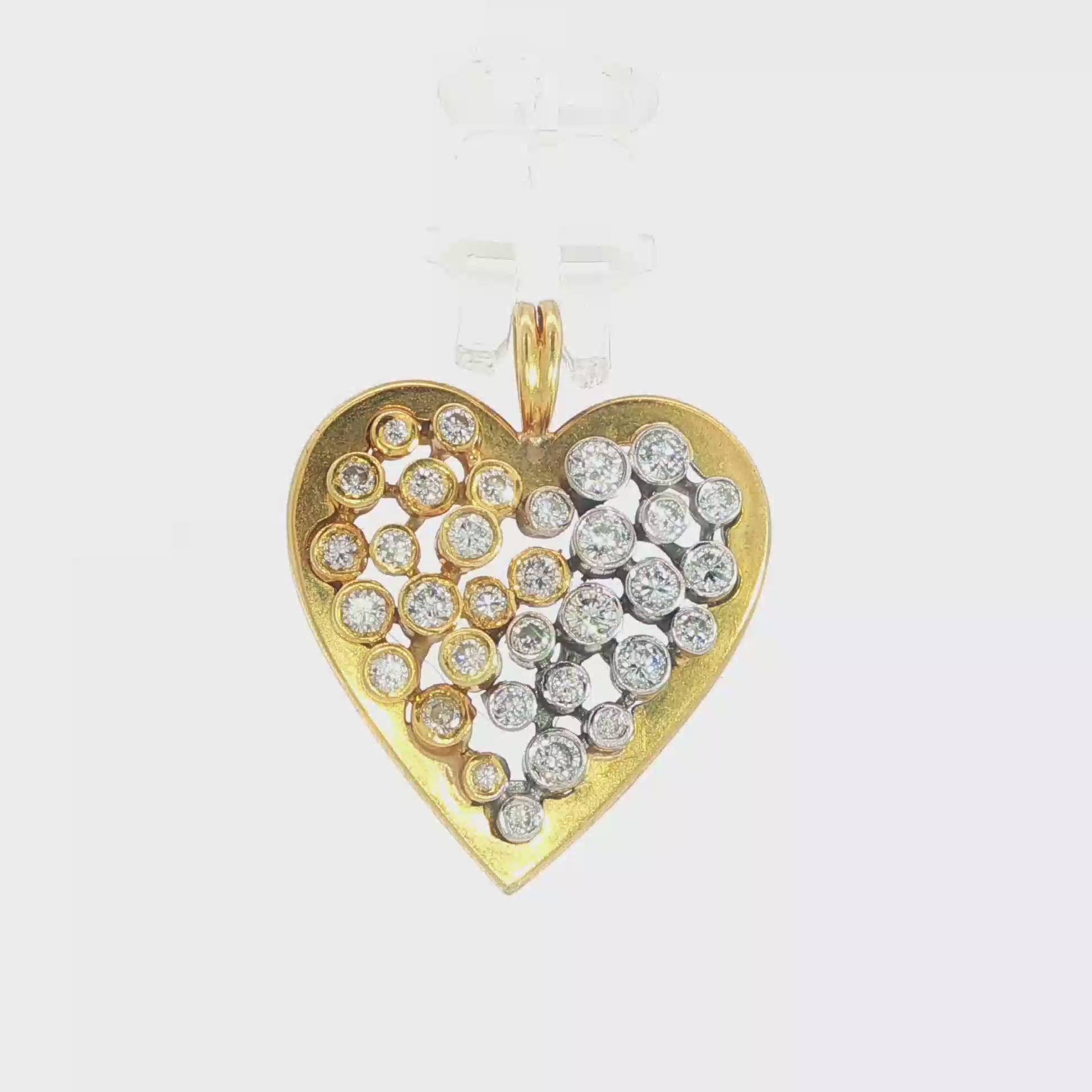 Vintage sentiment expressed in gold and diamond. This two-tone heart pendant is crafted in 18k gold and weighs a substantial 9.5 grams, giving it the reassuring weight and presence expected of well-made vintage jewelry. Measuring approximately 27 × 25 mm, it is set with an estimated 1.20 carats total weight of modern-cut diamonds, their brightness playing beautifully against the warmth of the gold.