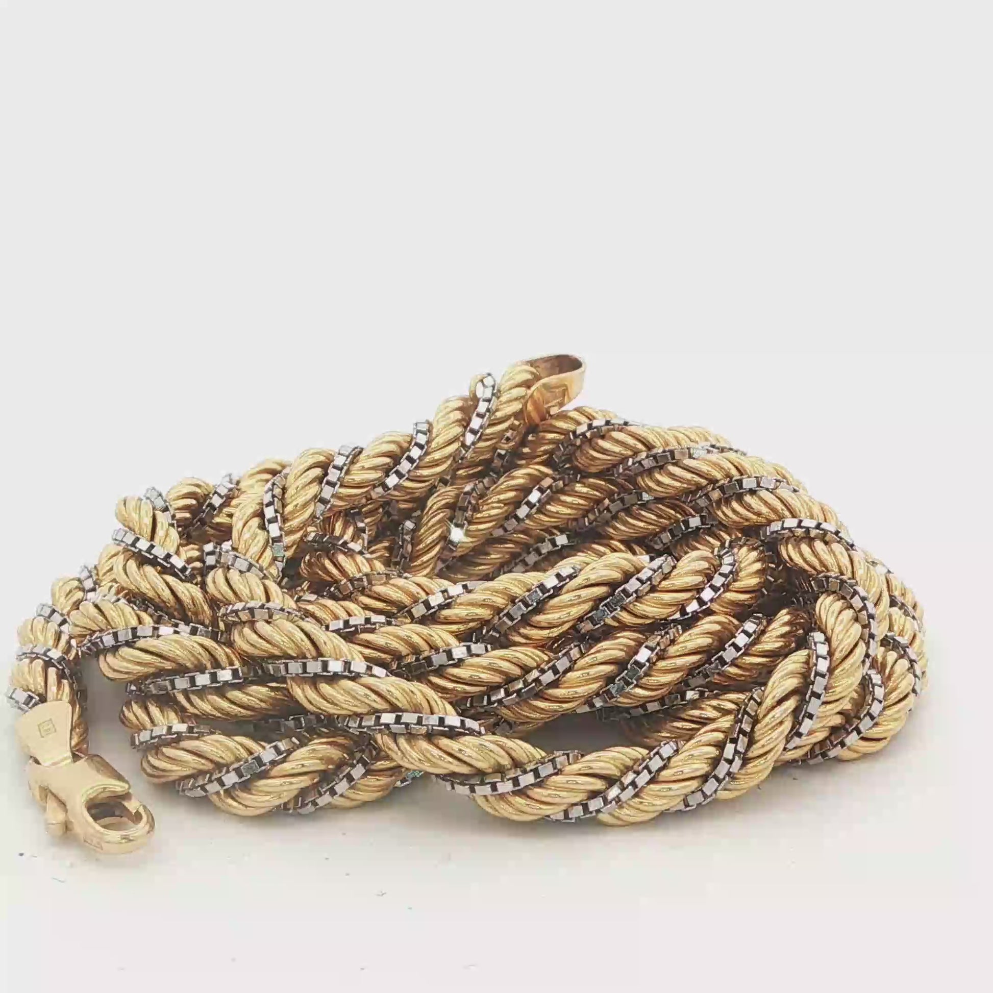 Crafted in 14k two-tone gold and weighing 31.7 grams, this vintage rope chain has beautiful contrast and movement. Measuring 29 inches in length with a 4 mm thickness, it drapes effortlessly and wears well on its own full length, double wrapped and layers beautifully.