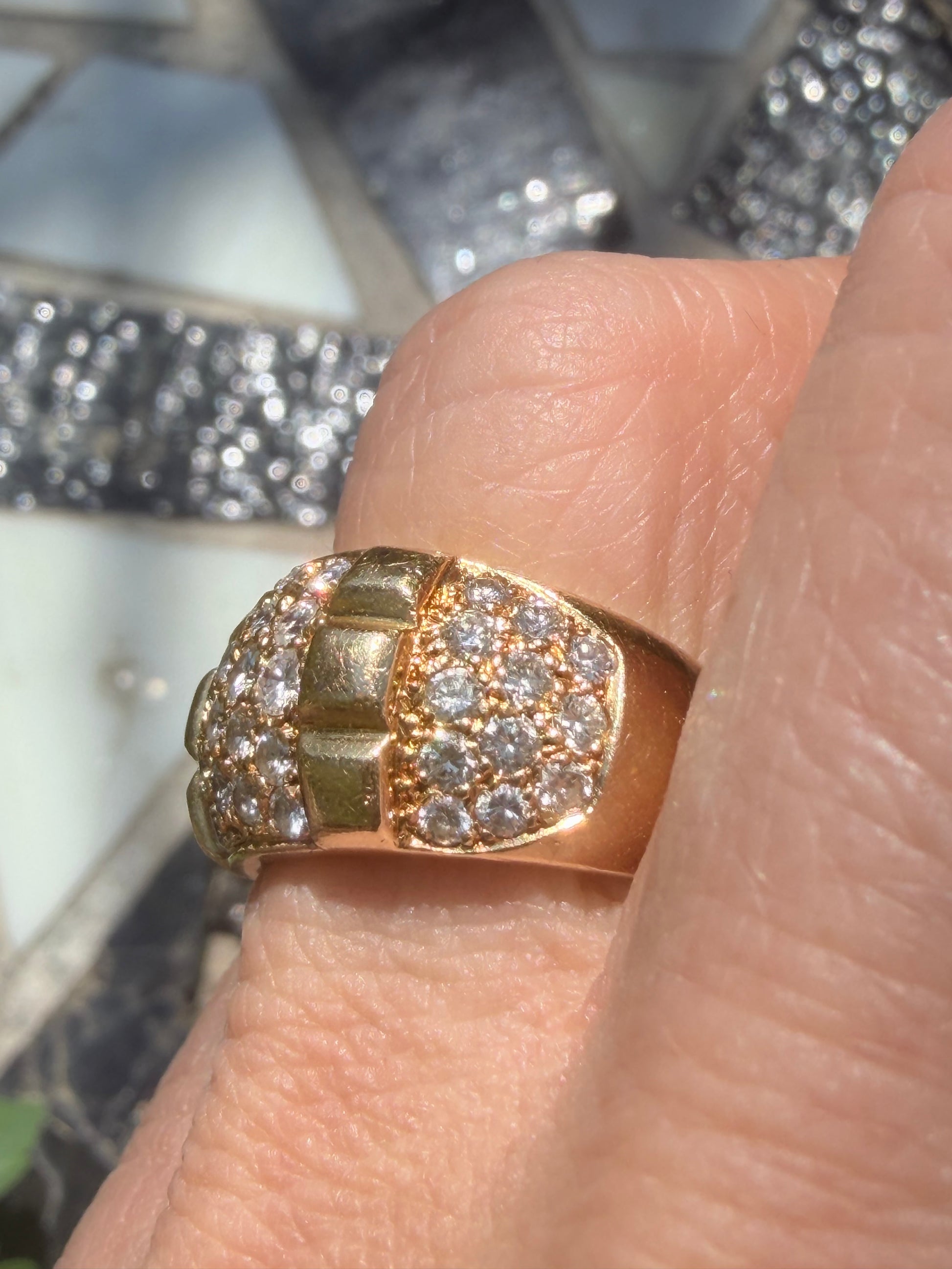 Van Cleef & Arpels built its name in Paris at Place Vendôme in 1906, known for precision setting, clean design, and a level of finish that set the standard across French high jewelry. By mid century, they were refining bold gold forms like this, combining strong volume with controlled diamond work so nothing feels overdone or loose. Pieces like this ring show that balance, structured gold, tight pavé, and design that reads clean from every angle.